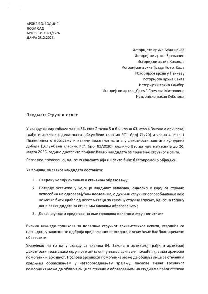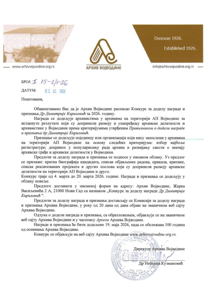 Поводом почетка обележавања јубилеја 200 година од рођења др Светозара Милетића (1826-1901) Архив Војводине вас позива на свечано отварање изложбе награђених дечјих литерарних и ликовних радова на конкурсу СВЕТОЗАР МИЛЕТИЋ – РЕЧ КОЈА НАРОД БУДИ / ГЛАС СРПСКЕ АТИНЕ и архивских докумената које ће се одржати у петак, 20. фебруара 2026. године у 12.00 часова […]