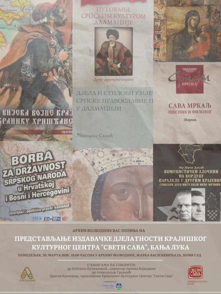 Архив Војводине и Крајишки Културни Центар „Свети Сава”, из Бања Луке са задовољством Вас позивају на представљање издавачке делатности Крајишког Културног Центра, са посебним освртом на књиге