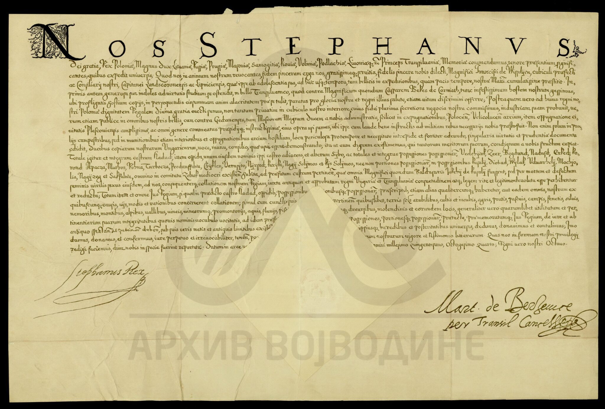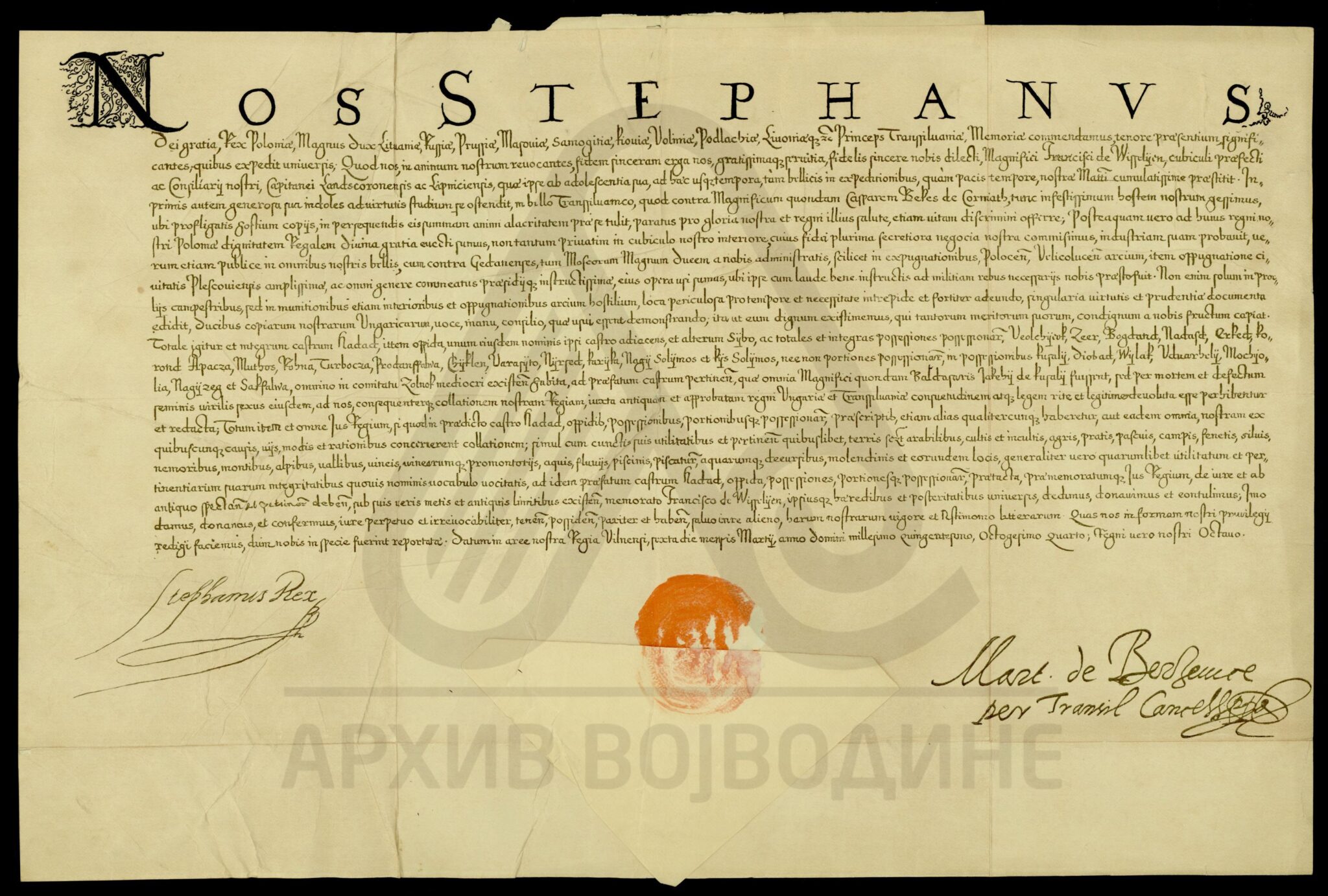 Даровница пољског краља Иштвана Баторија тврђаве Хадад (Hadad), и других поседа са припадајућим приходима, на име верне службе, коморнику, саветнику и капетану Ференцу де Веселенију (Wesselényi, de Wisselÿen).