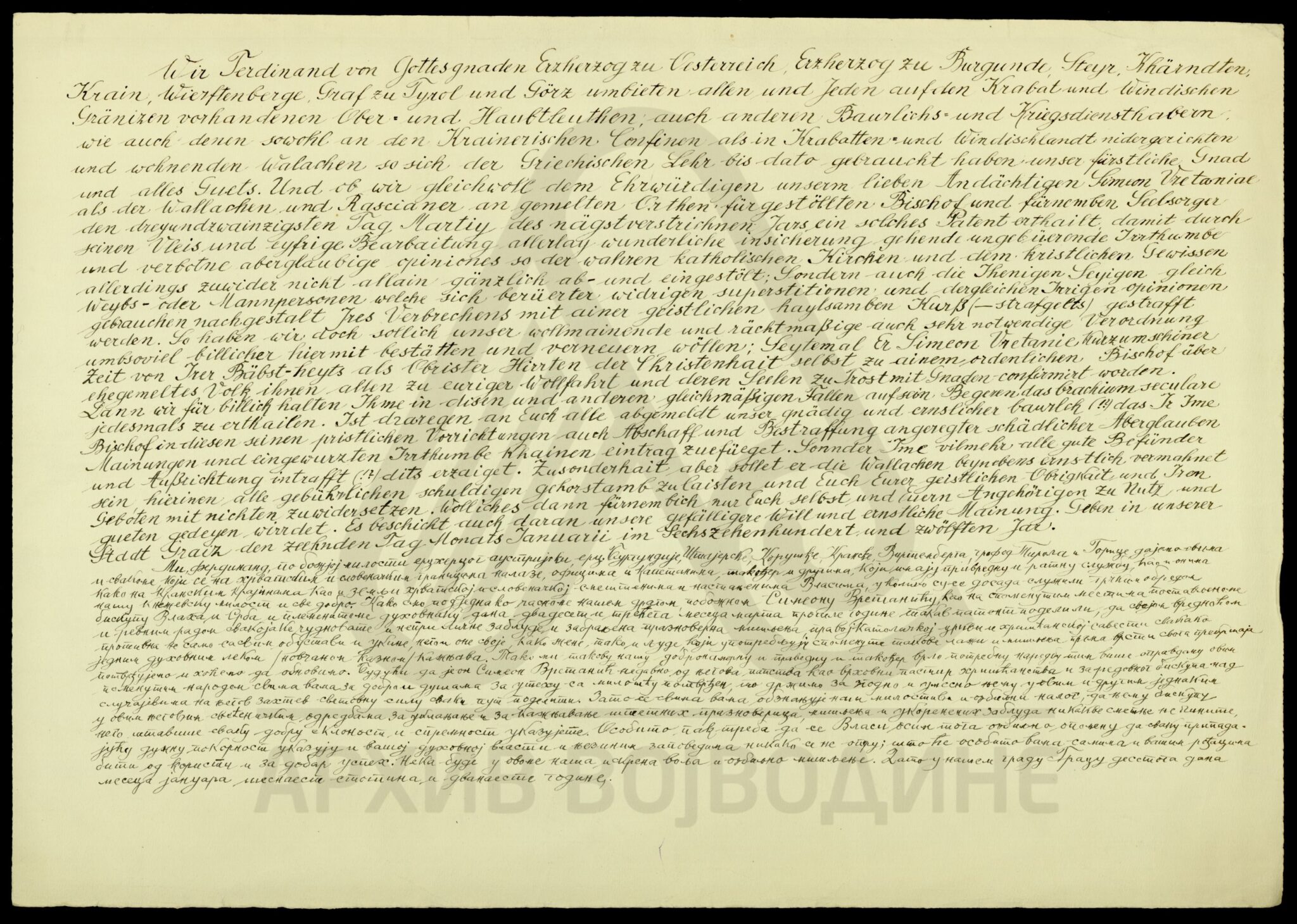 Патент војводе Фердинанда којим се потврђује ранија одлука да игуман манастира Марче, Симеон Вретанић који је 1611. године постављен за епископа Влаха и Срба, има власт да прогони и кажњава народ и његово празноверје, уз коришћење и световних овлашћења.