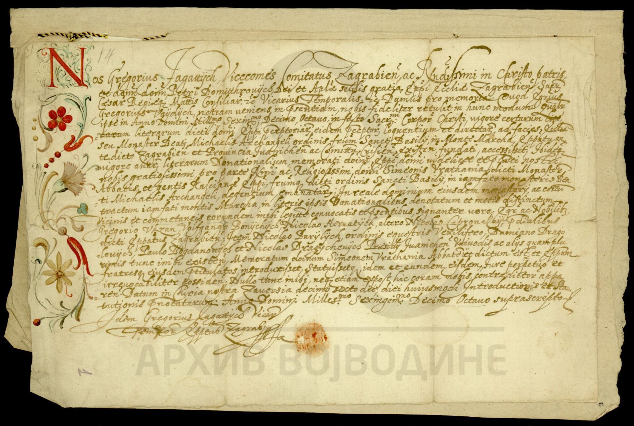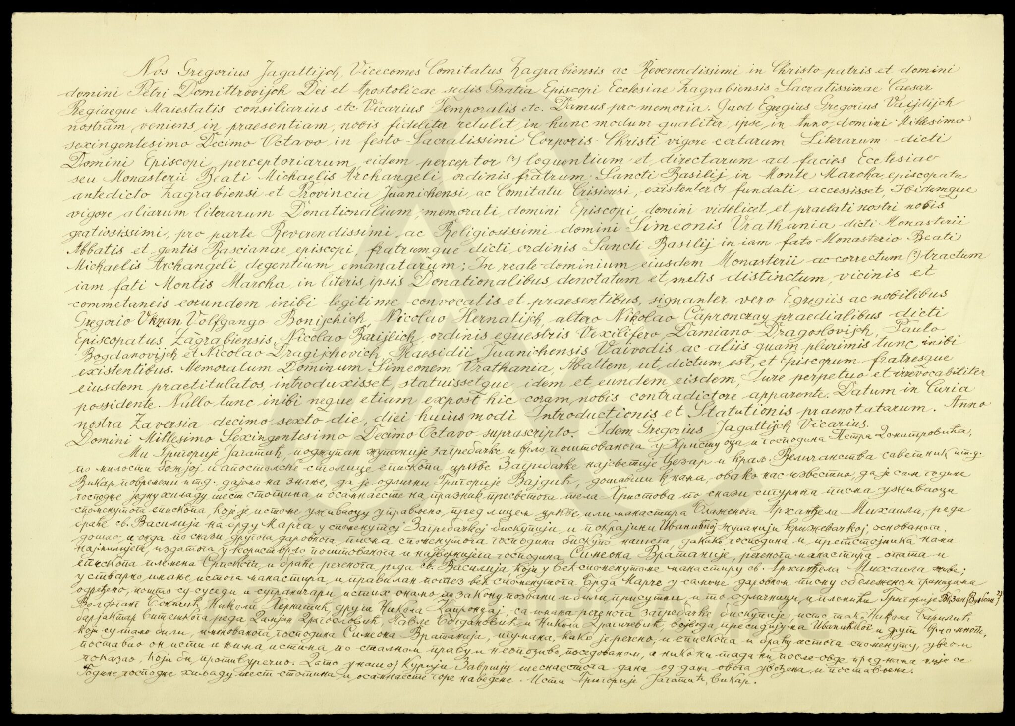 Потврда поджупана Загребачке жупаније, Георгија Јагатића (Јаgattÿch), о даровању поседа манастира Светог арханђела Михајла на брду Марча (Marcha), игуману поменутог манастира и епископу српског народа, Симеону Вретанићу.