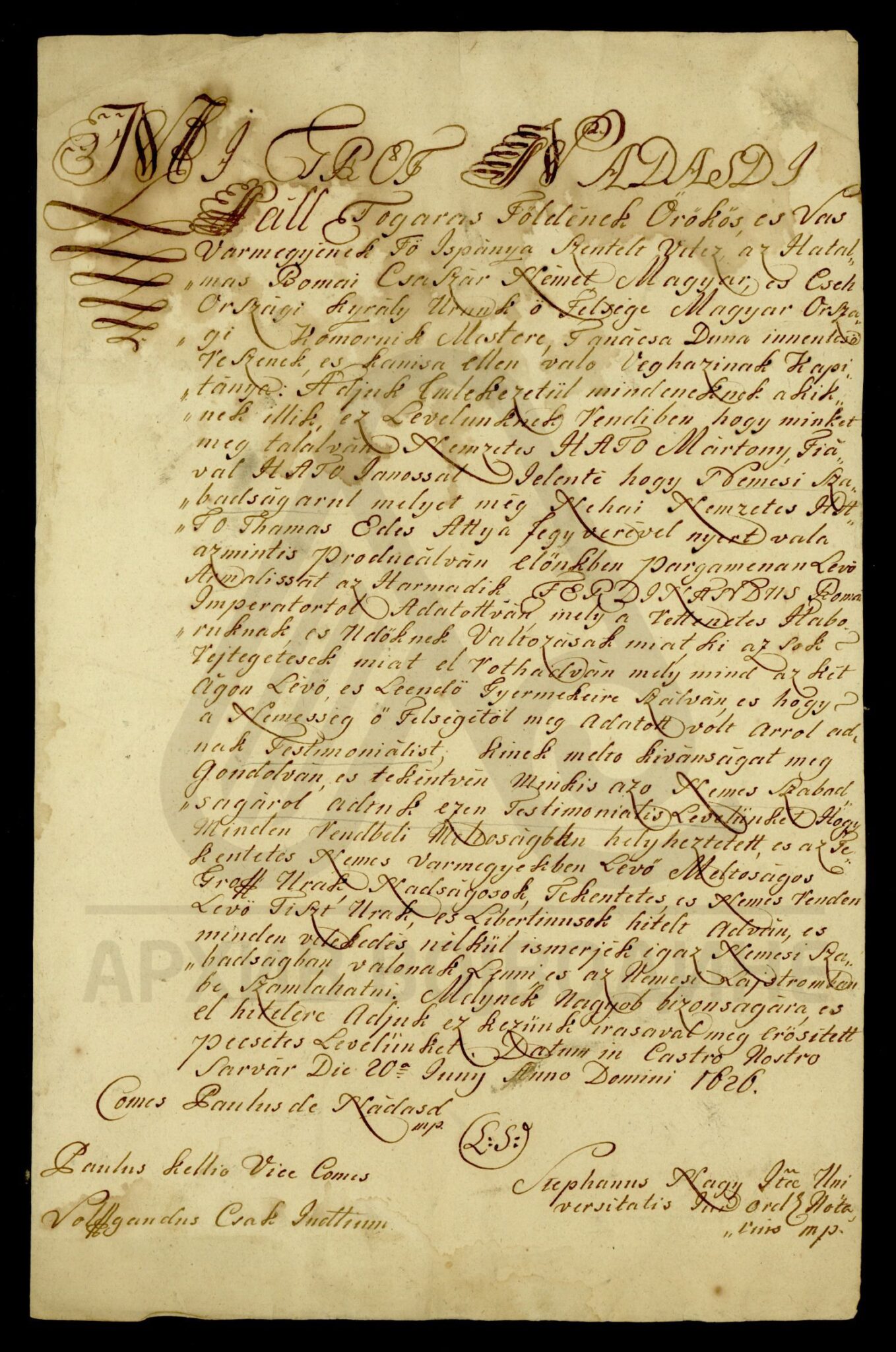 Препис сведочанства којим велики жупан жупаније Ваш, гроф Пал Надажди (Nadasdi, de Nádasd) , потврђује племство Хато Мартоњу (Hato Mártony) и његовом сину Јаношу, на основу племићке повеље дароване од стране Фердинанда III оцу поменутог, Тамашу Хато (Hato Thamas).
