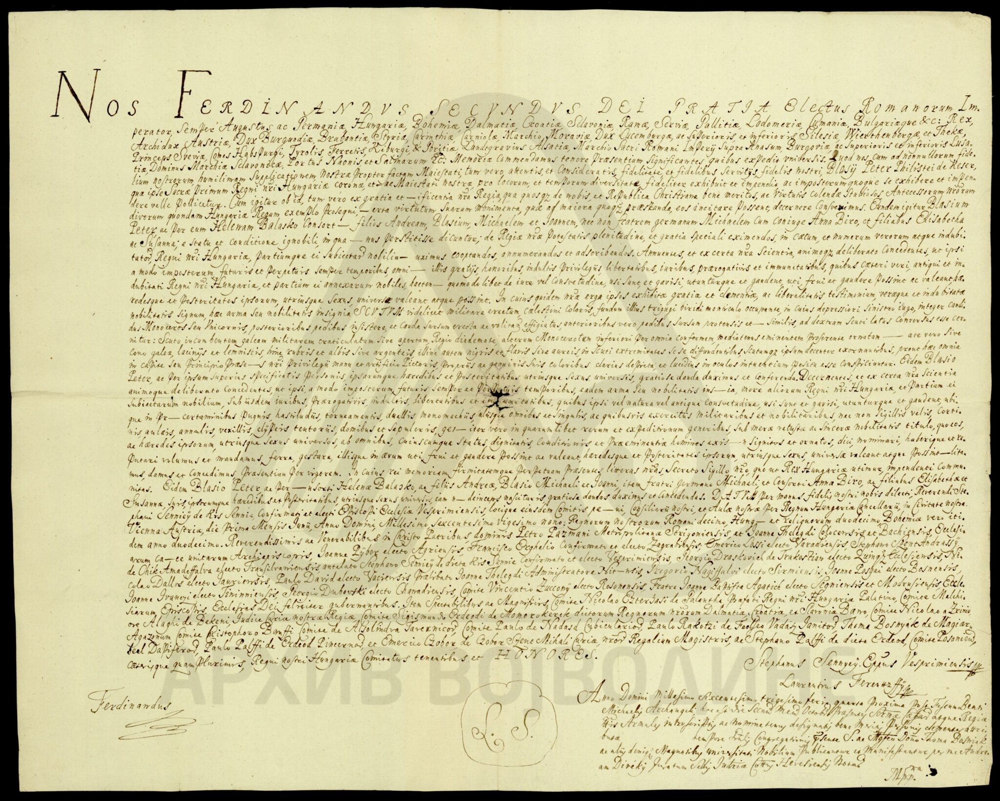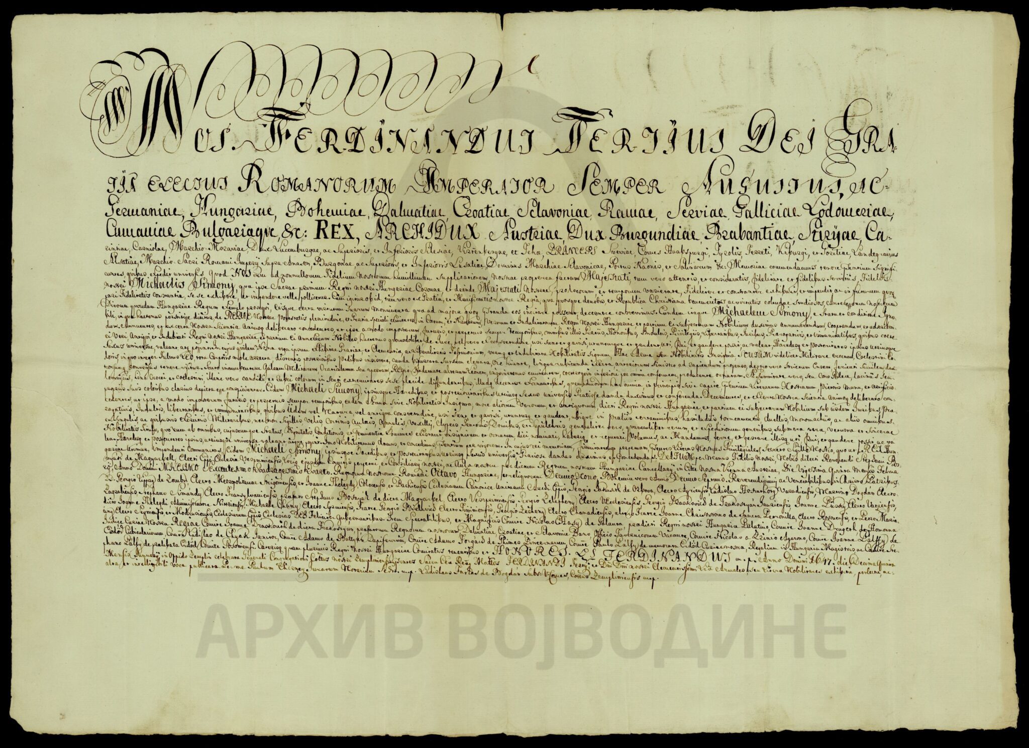 Диплома цара Фердинанда III о даровању племићке титуле Михаљу Шимонију (Simony), као и његовим наследницима оба пола, уз право употребе племићког печата.