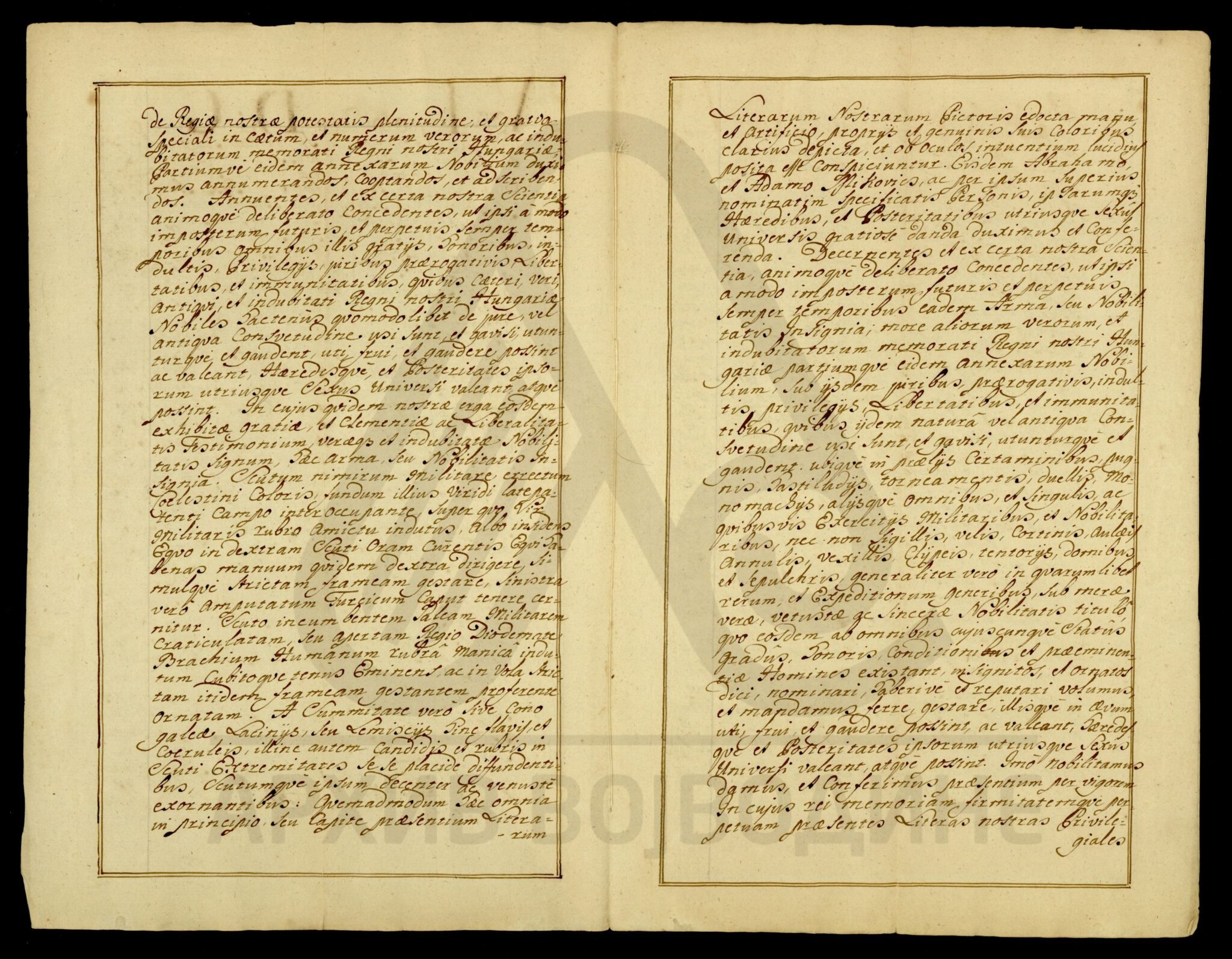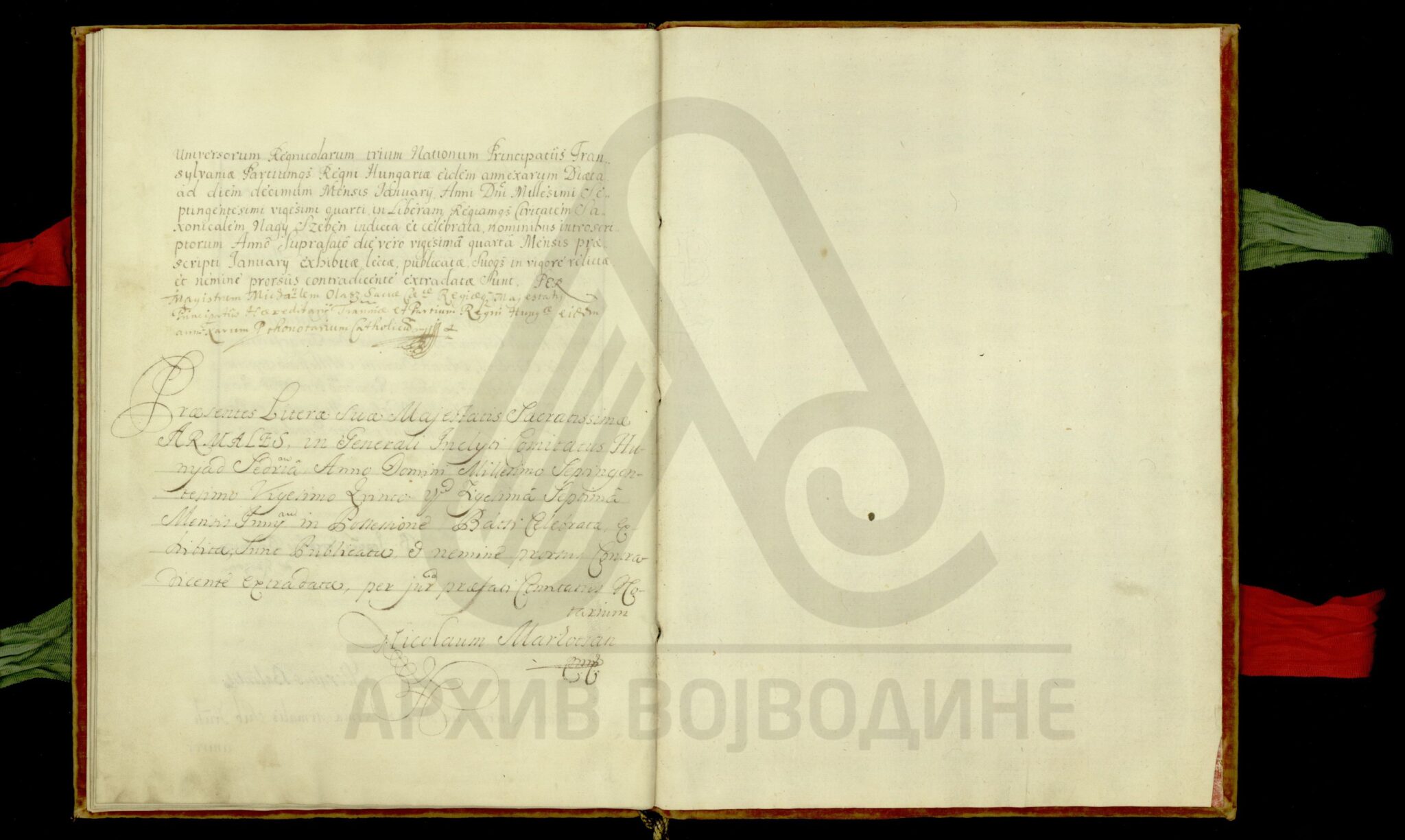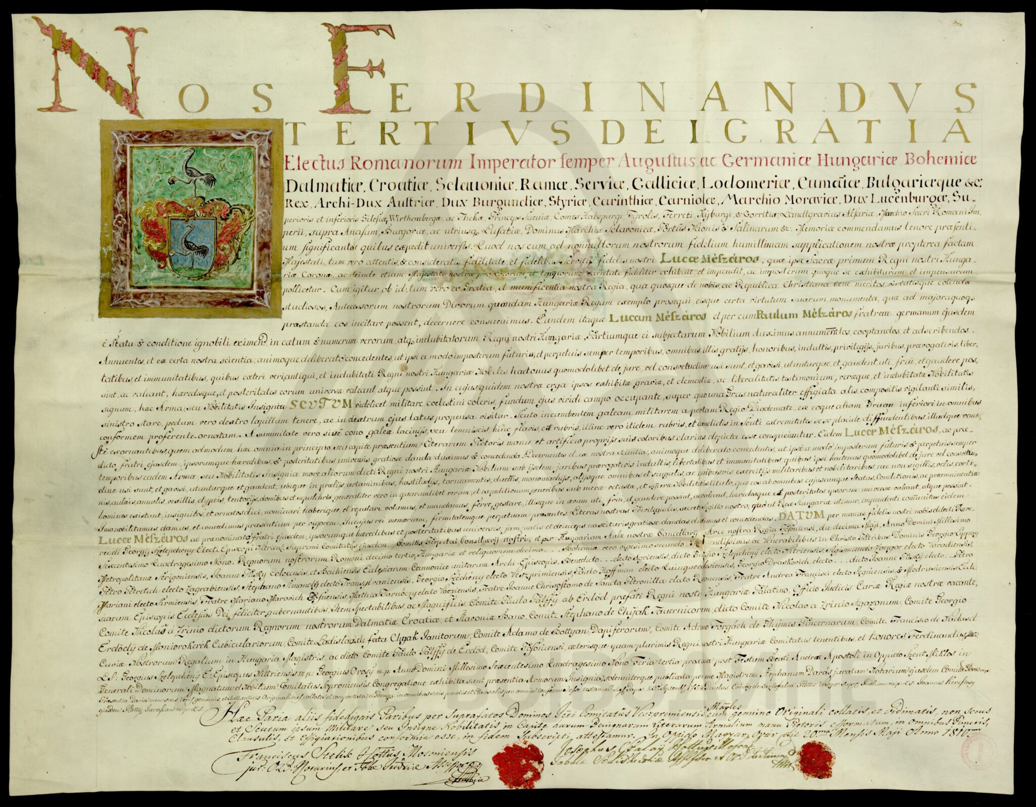 Повеља којом цар Фердинанд III дарује племство Луки Месарошу (Mészáros) , његовом брату Павлу Месарошу, као и њиховим наследницима, уз право употребе племићког печата, као и уживање свих племићких повластица и имунитета.