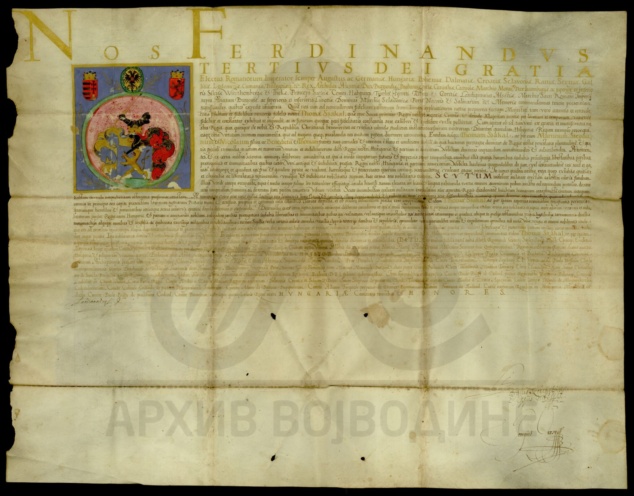 Диплома цара Фердинанда III о даровању племићке титуле, уз право употребе племићког печата, Томи Сакалу (Szakal), његовим синовима и браћи, као и наследницима именованих, оба пола.
