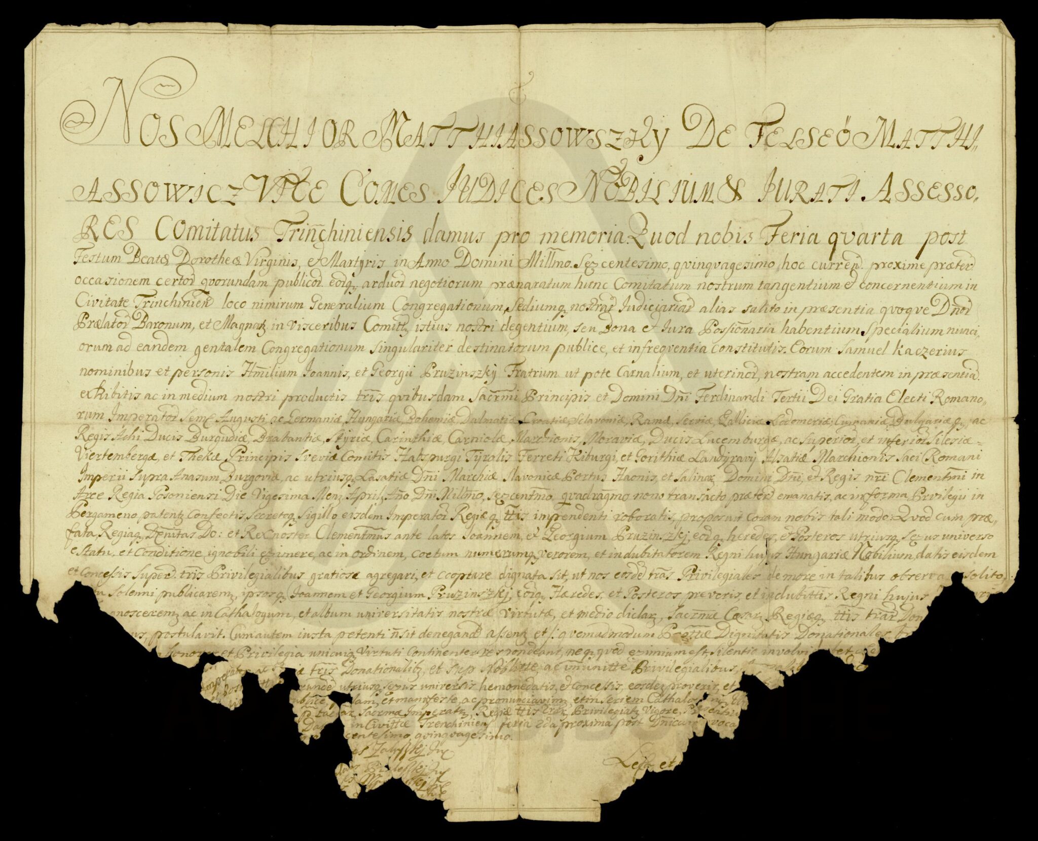 Пергамент, латински језик, 1 лист (велики формат), рукопис, очуван, печати жупанијских службеника.