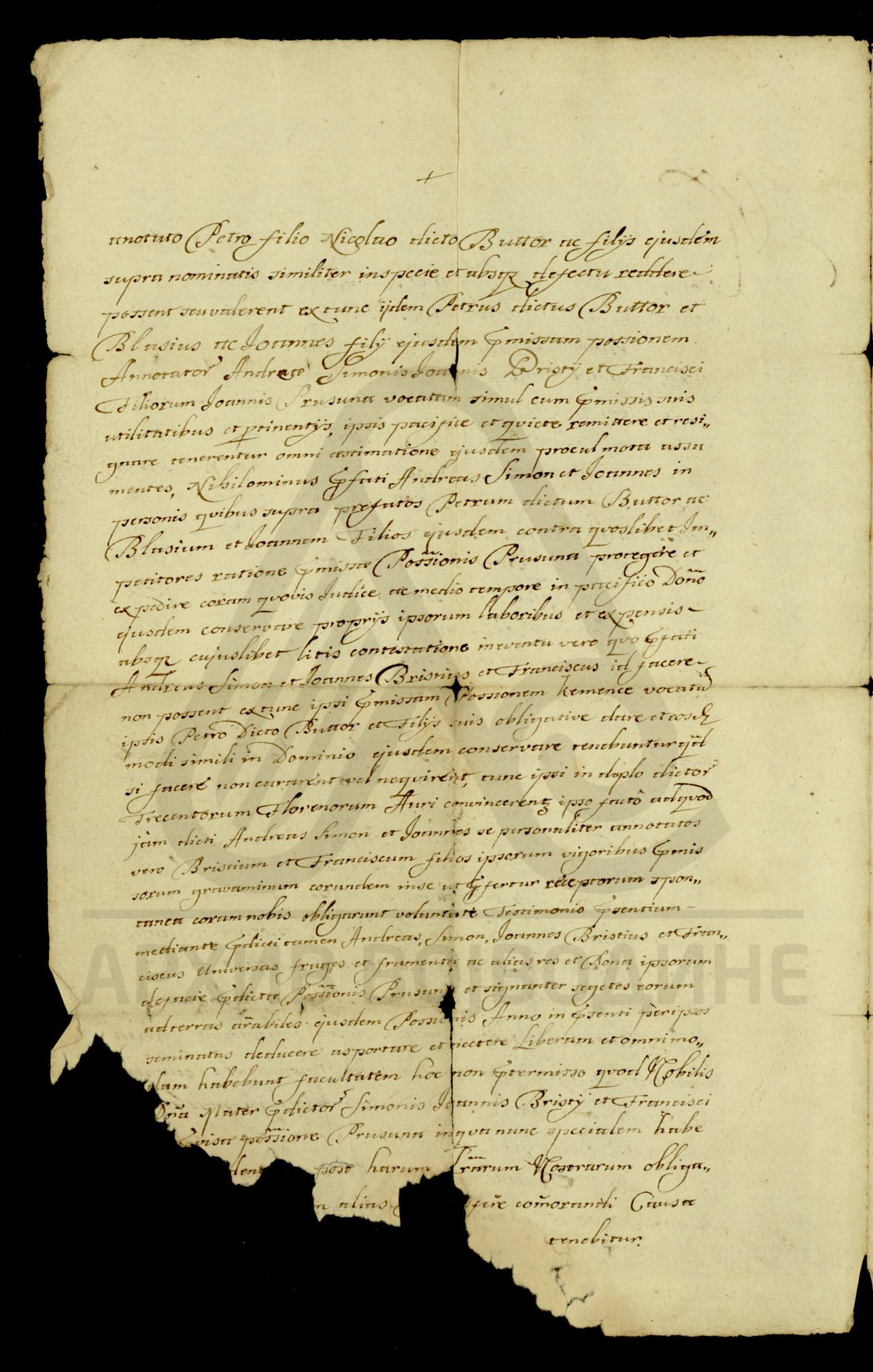Пергамент, латински језик, 1 лист (велики формат), рукопис, делимично оштећен (тешко читљив), без печата.