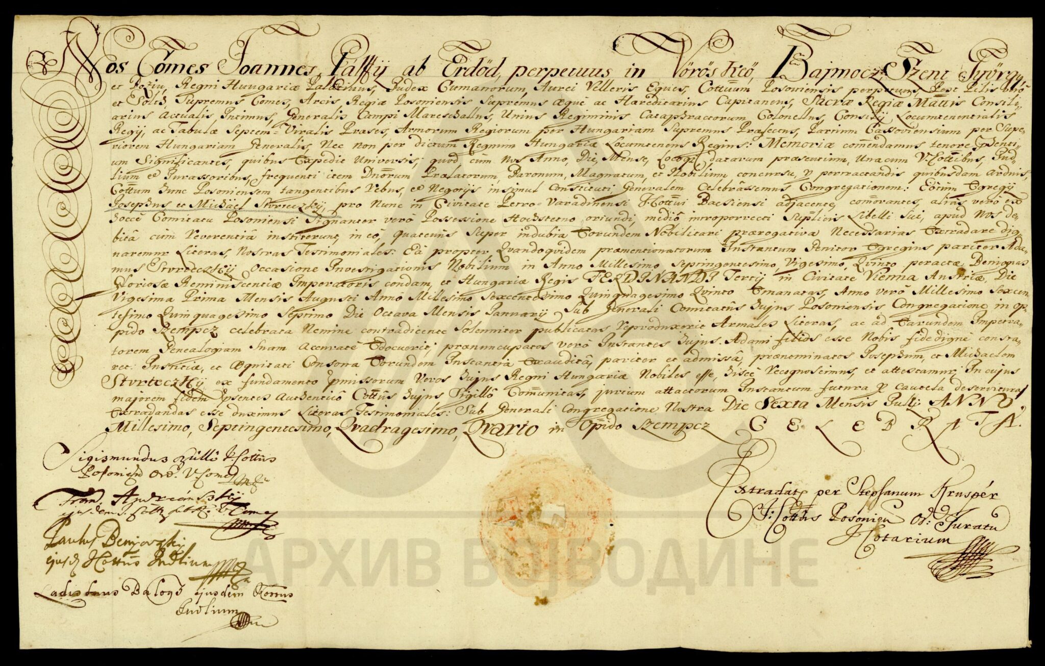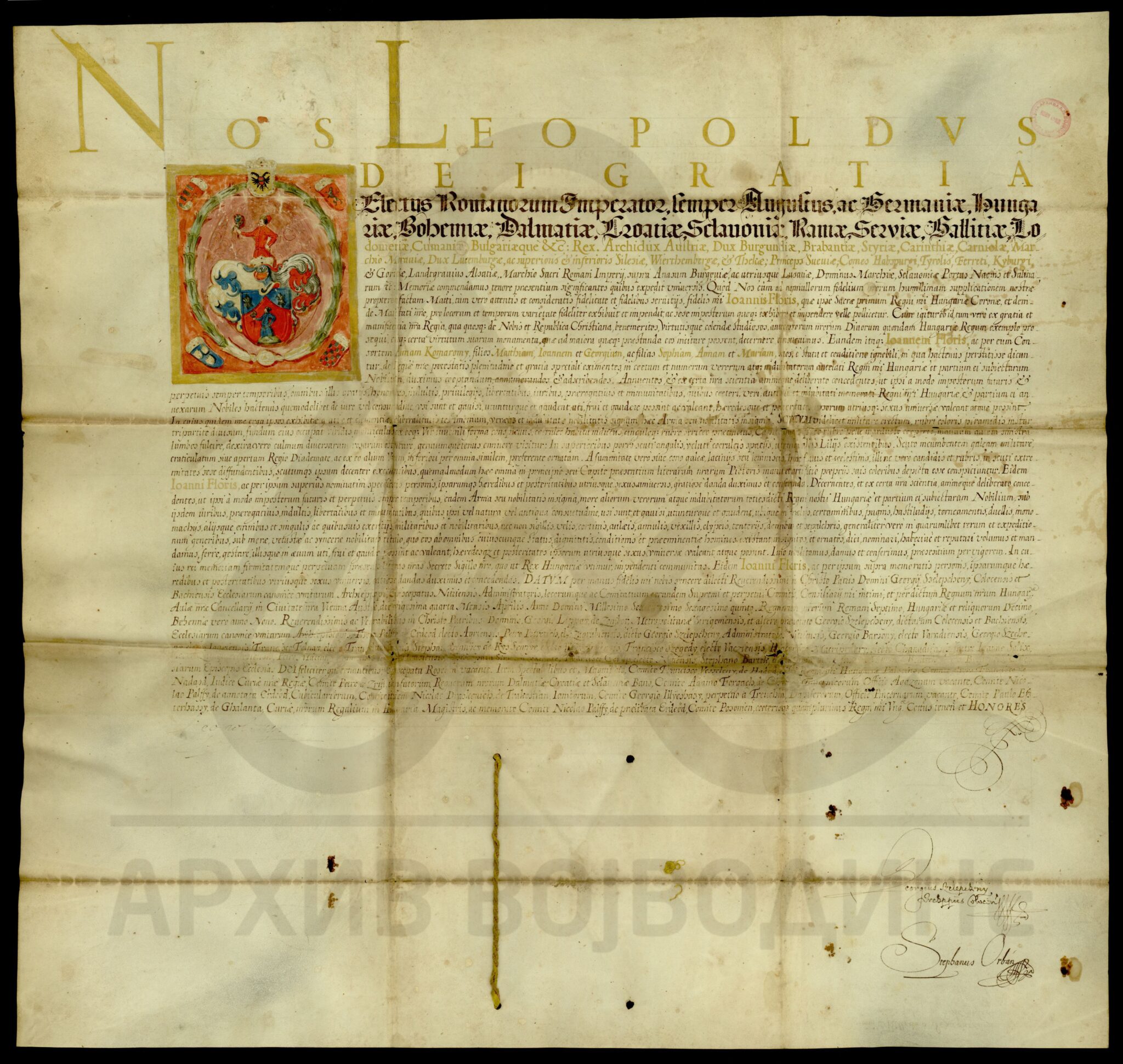 Диплома цара Леополда I о даровању племићке титуле, уз право употребе племићког печата, Јовану Флорису (Floris), његовој жени Ани Комароми (Komaromy) и деци, те будућим наследницима оба пола.