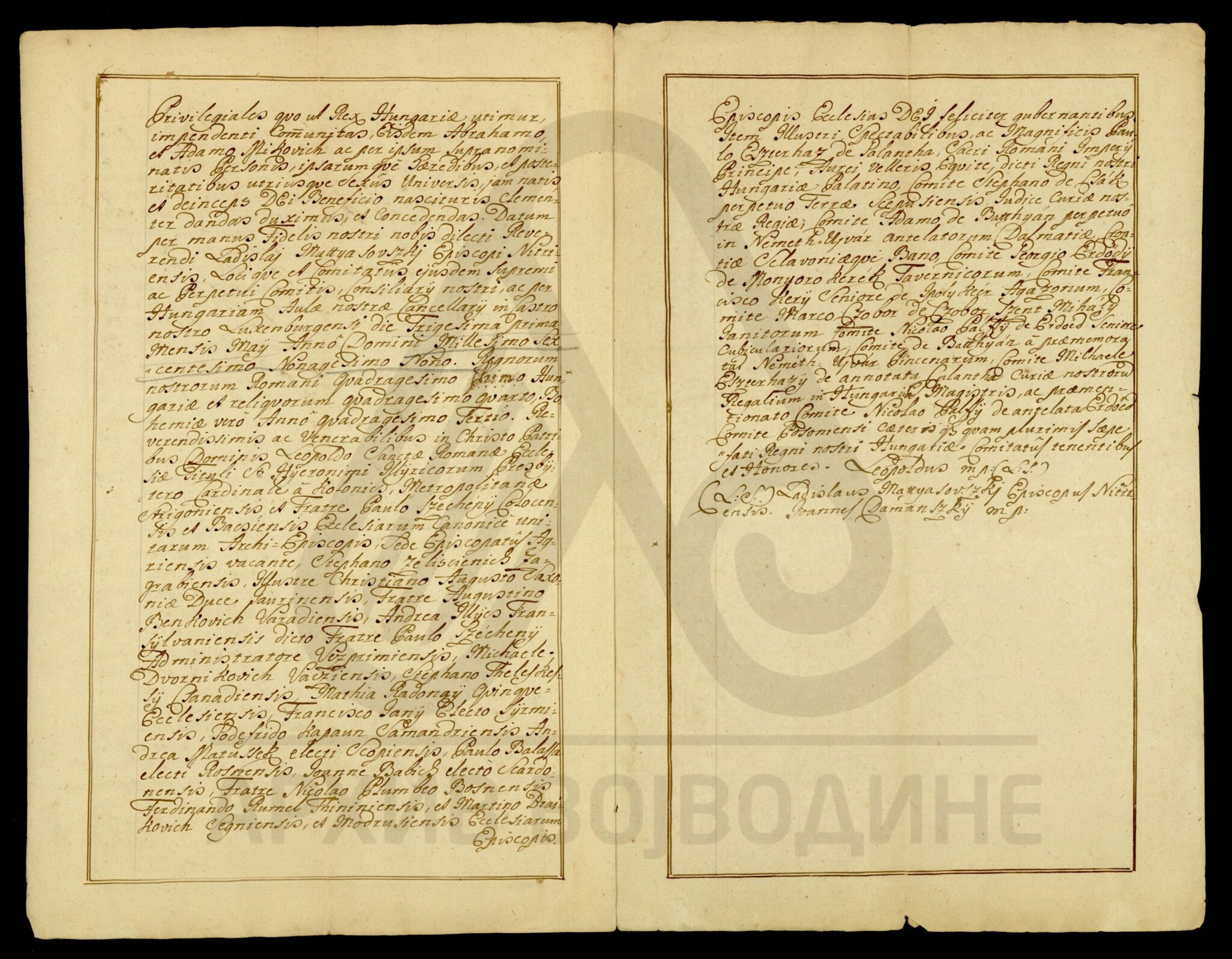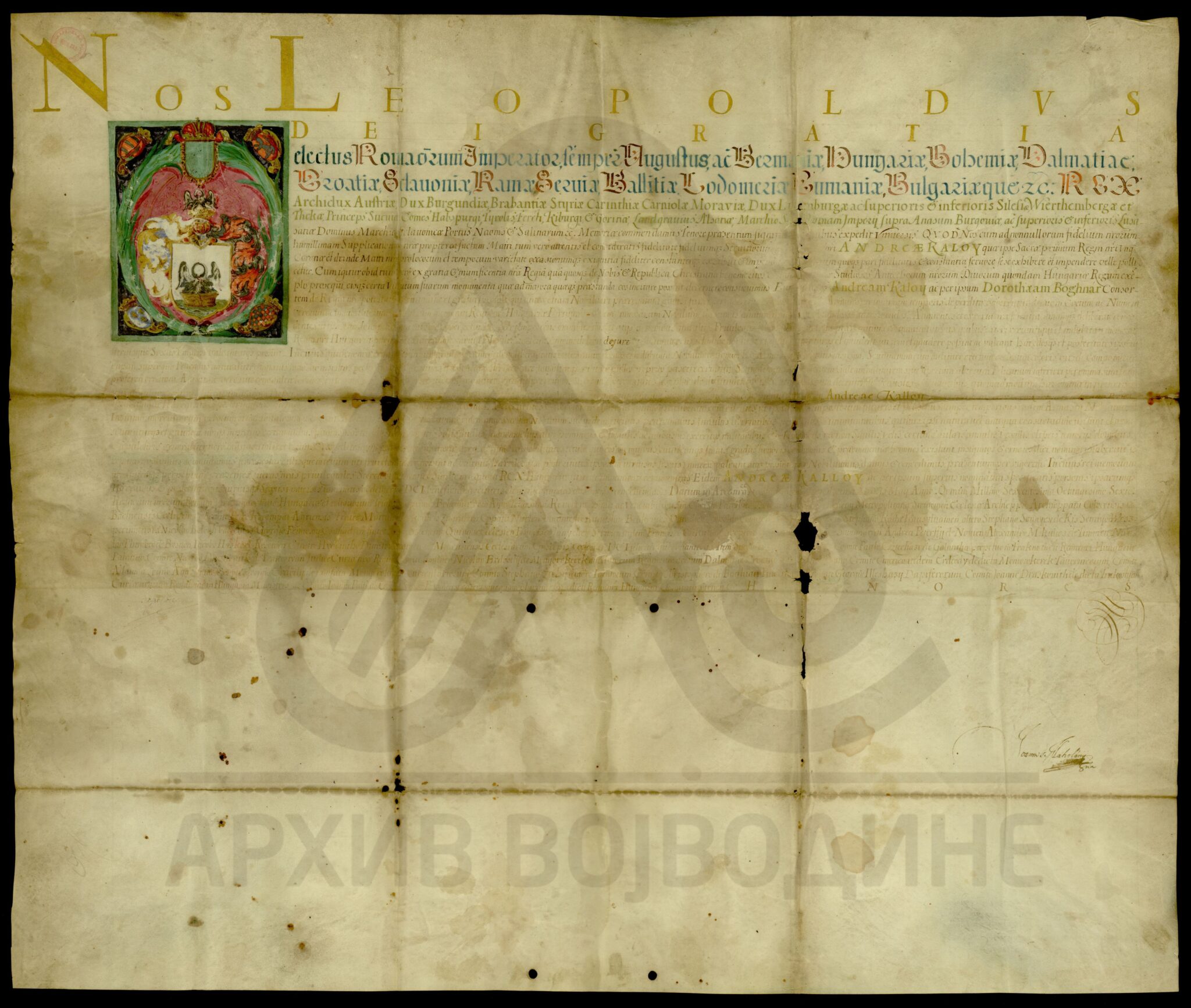 Диплома цара Леополда I о даровању племићке титуле, уз право употребе племићког печата, Андрашу Калоју (Kaloy), његовој жени Доротеји Богнар (Boghnár), као и будућим наследницима оба пола.