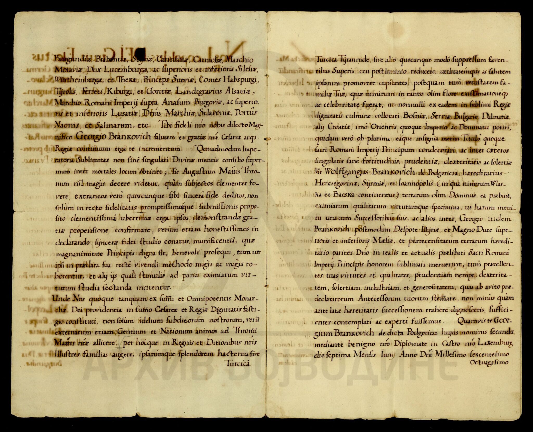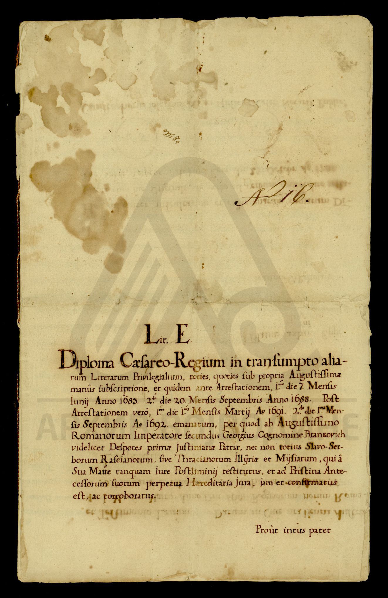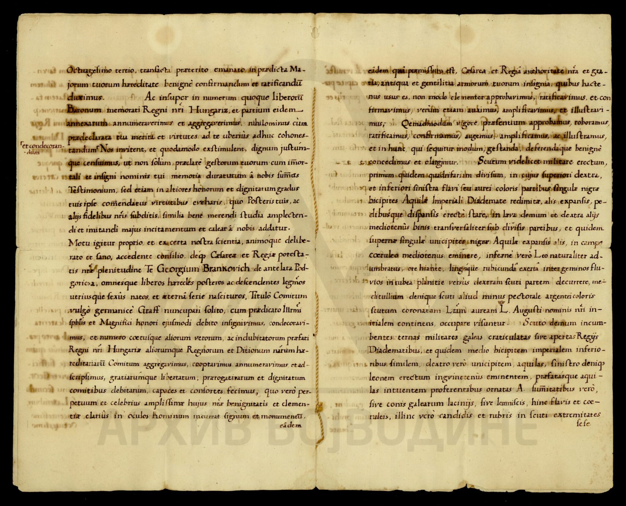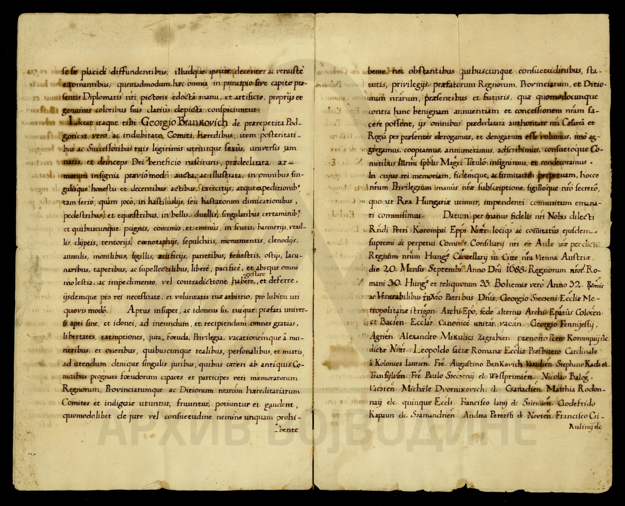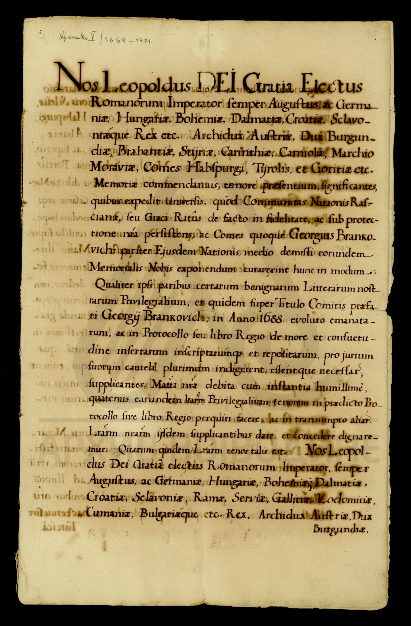 Потврда цара Леополда I дипломе од 20. септембра 1688. године о даровању грофовске титуле, и других повластица, Ђорђу Бранковићу (Georgius Brankovich).