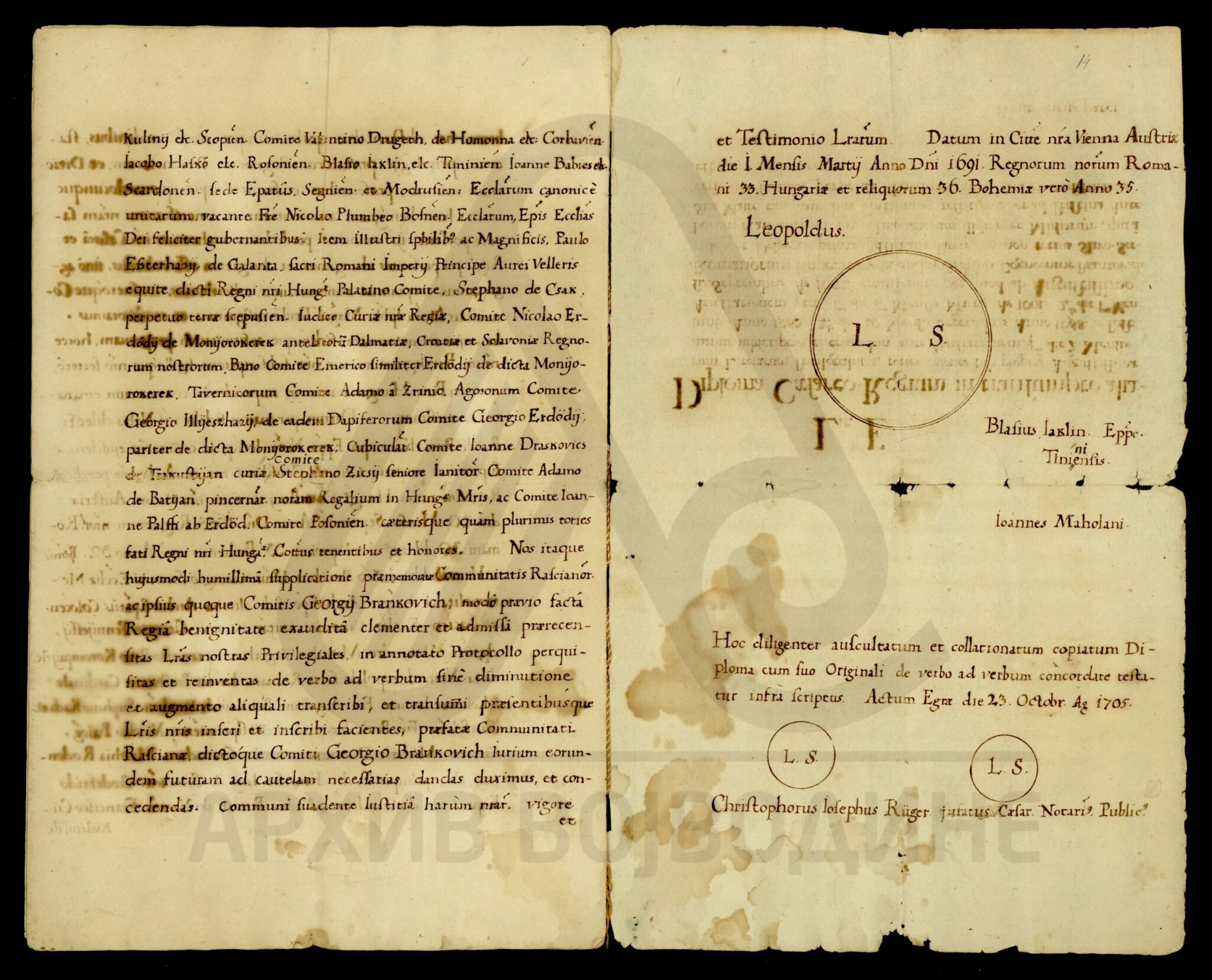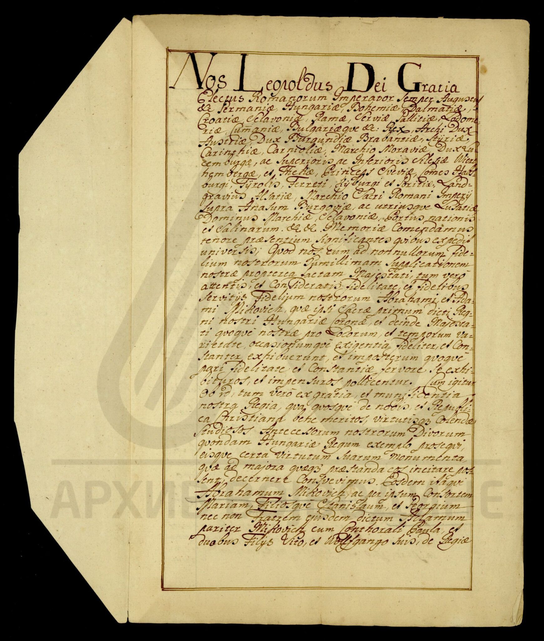 Препис повеље цара Леополда I о додељивању племства, уз уживање свих племићких повластица и имунитета, као и коришћење племићког печата, Авраму и Адаму Миковићу (Mikovich), њиховим породицама и будућим наследницима оба пола.