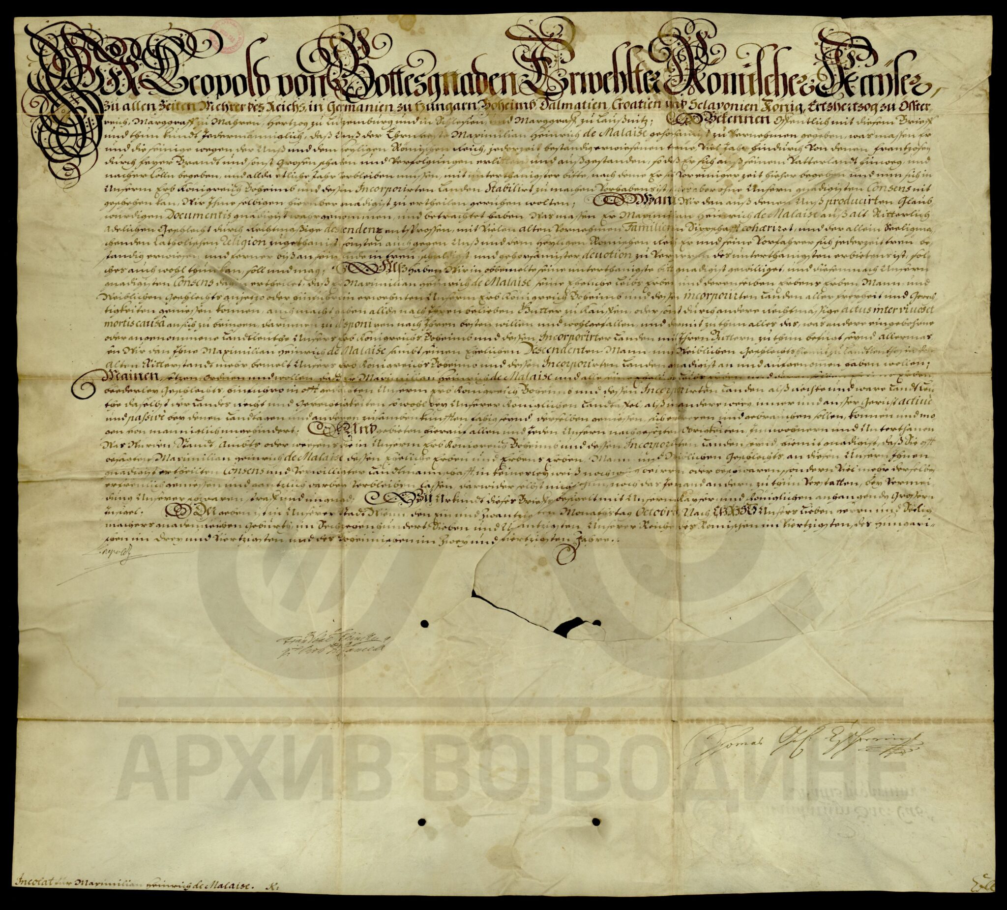 Диплома којом цар Леополд I потврђује сва ранија стечена племићка права породици де Малисе (de Malaise).