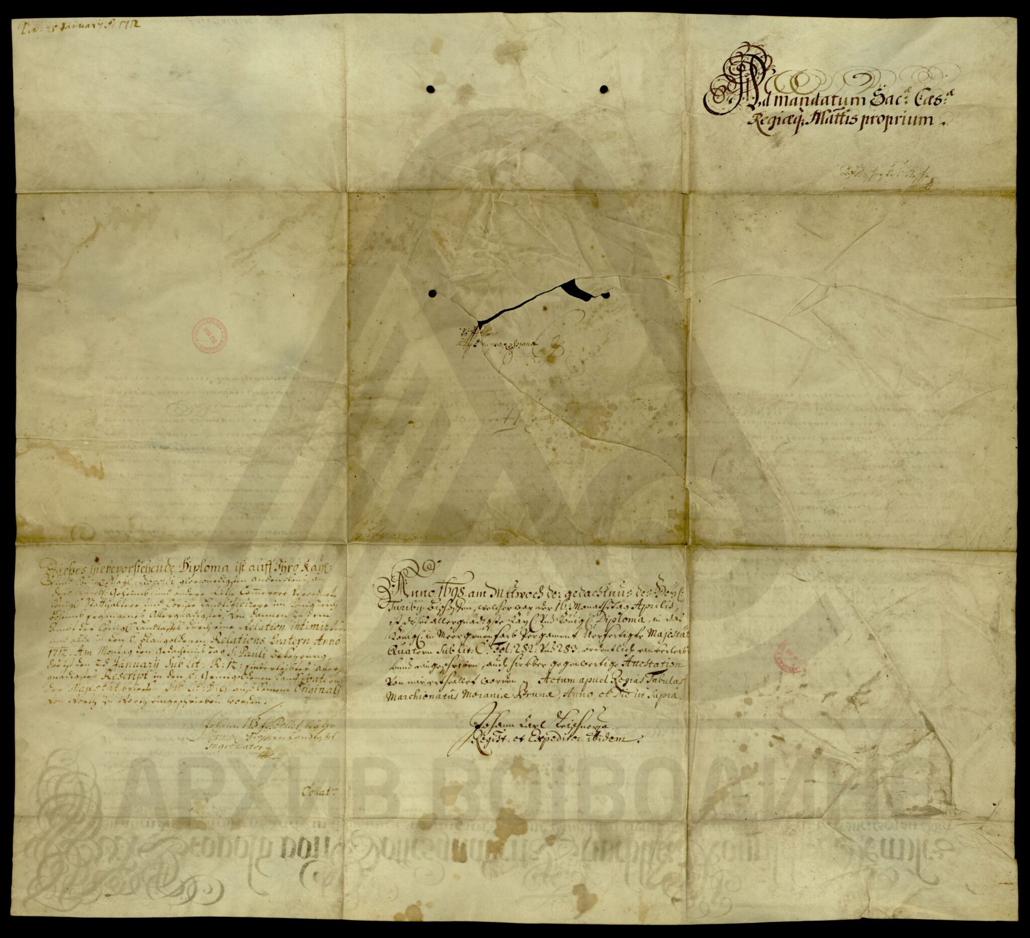 Пергамент, немачки језик, 1 лист (велики формат), рукопис, делимично оштећен, без печата.