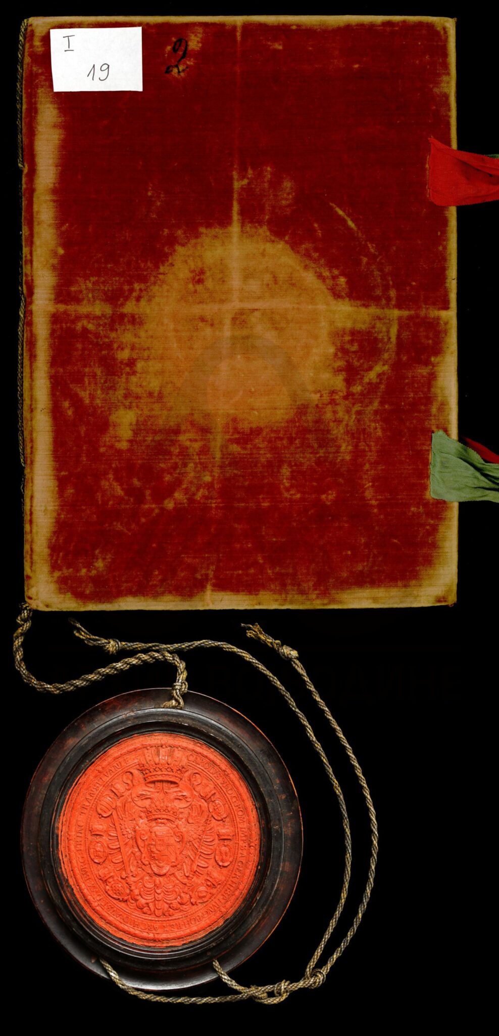 Пергамент, хартија, латински језик, 8 листова, рукопис (облик књиге тврдог повеза), очувана, воштани печат у дрвеној кутији.