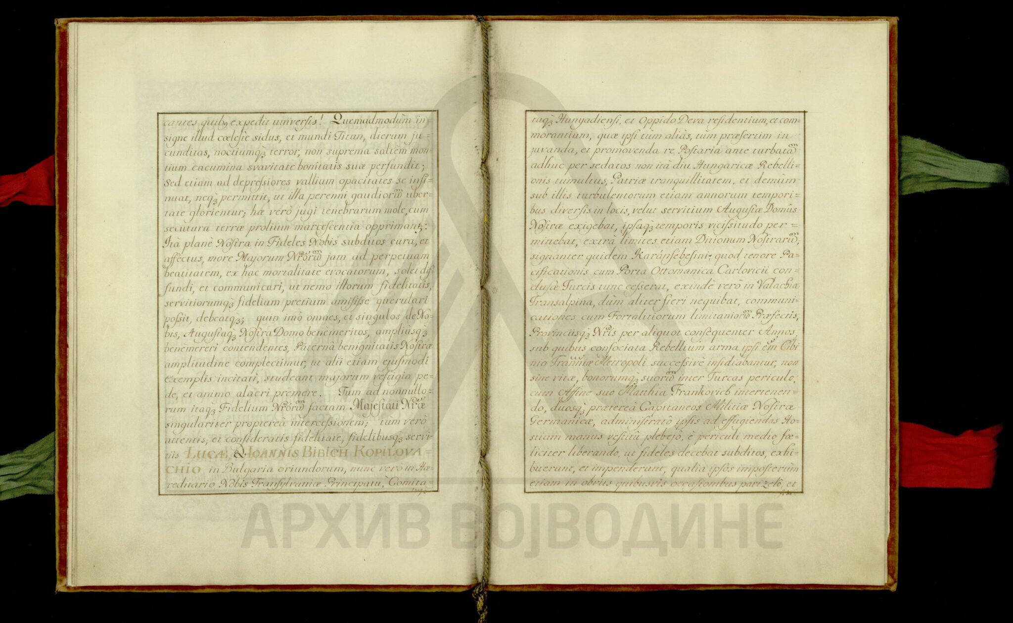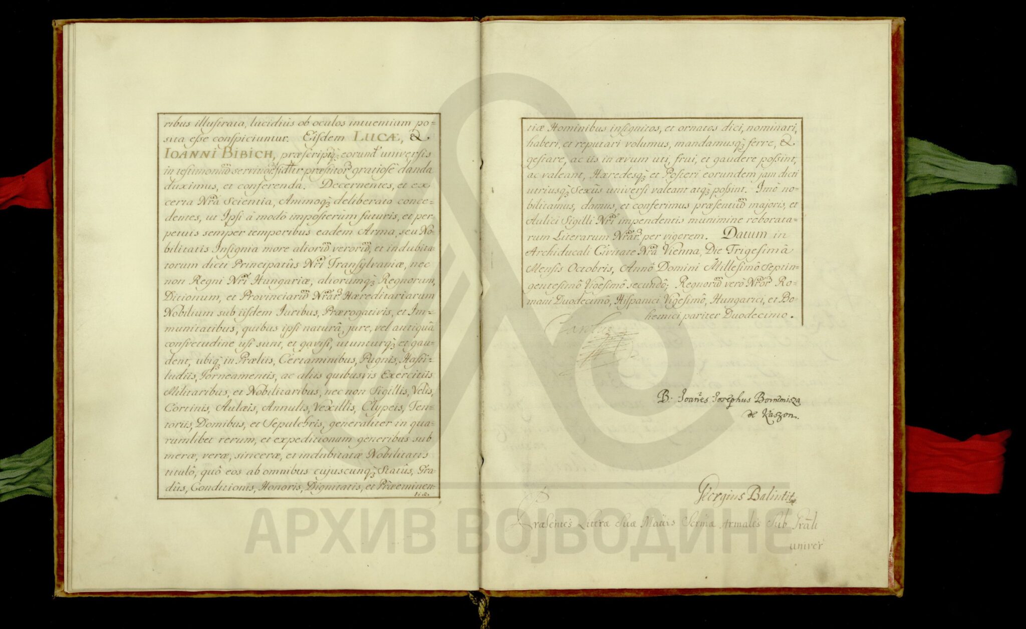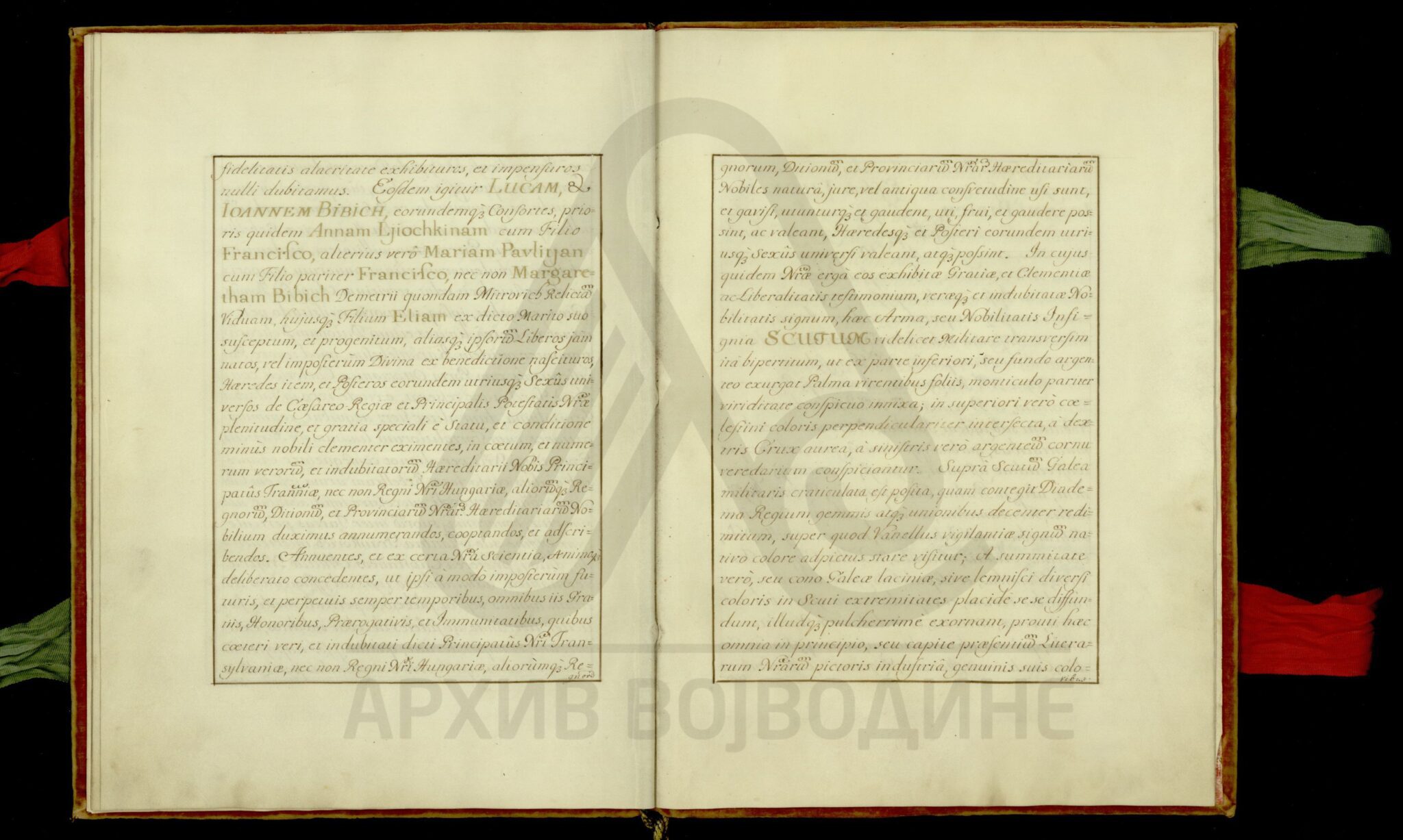 Диплома цара Карла VI о даровању племићке титуле, уз право употребе племићког грба, Луки и Јовану Бибићу (Bibich), пореклом из Бугарске (Bulgaria), а сада становника вароши Дева (Déva) на територији жупаније Хуњад (Hunyad) у Кнежевини Трансилванији, породицама именованих као и будућим наследницима.