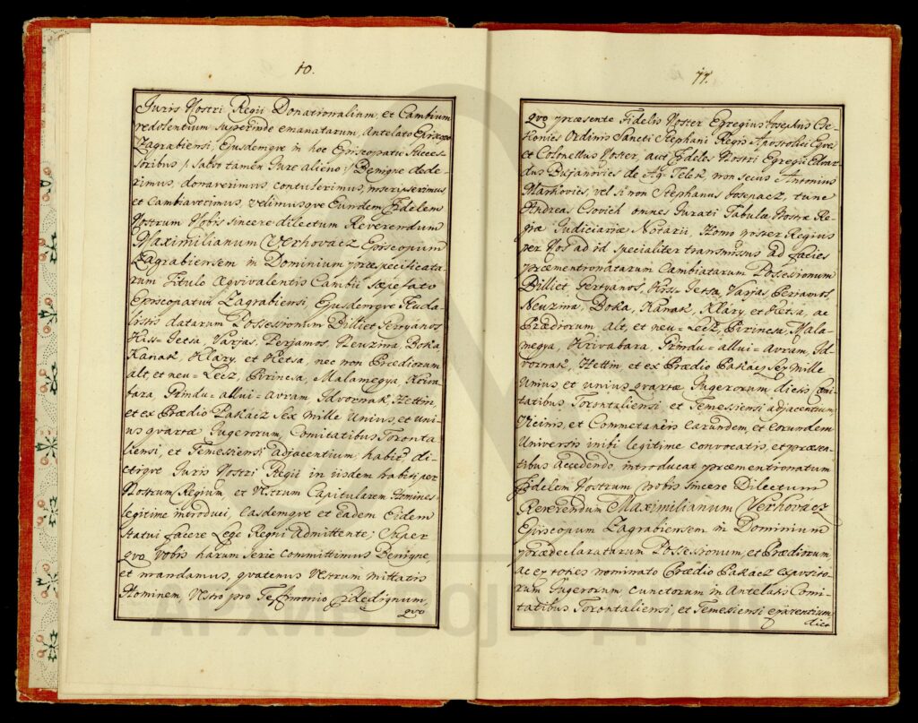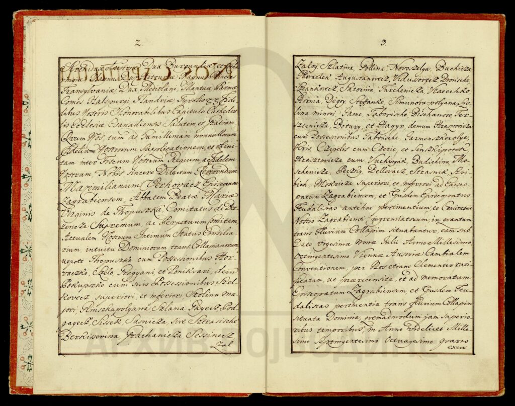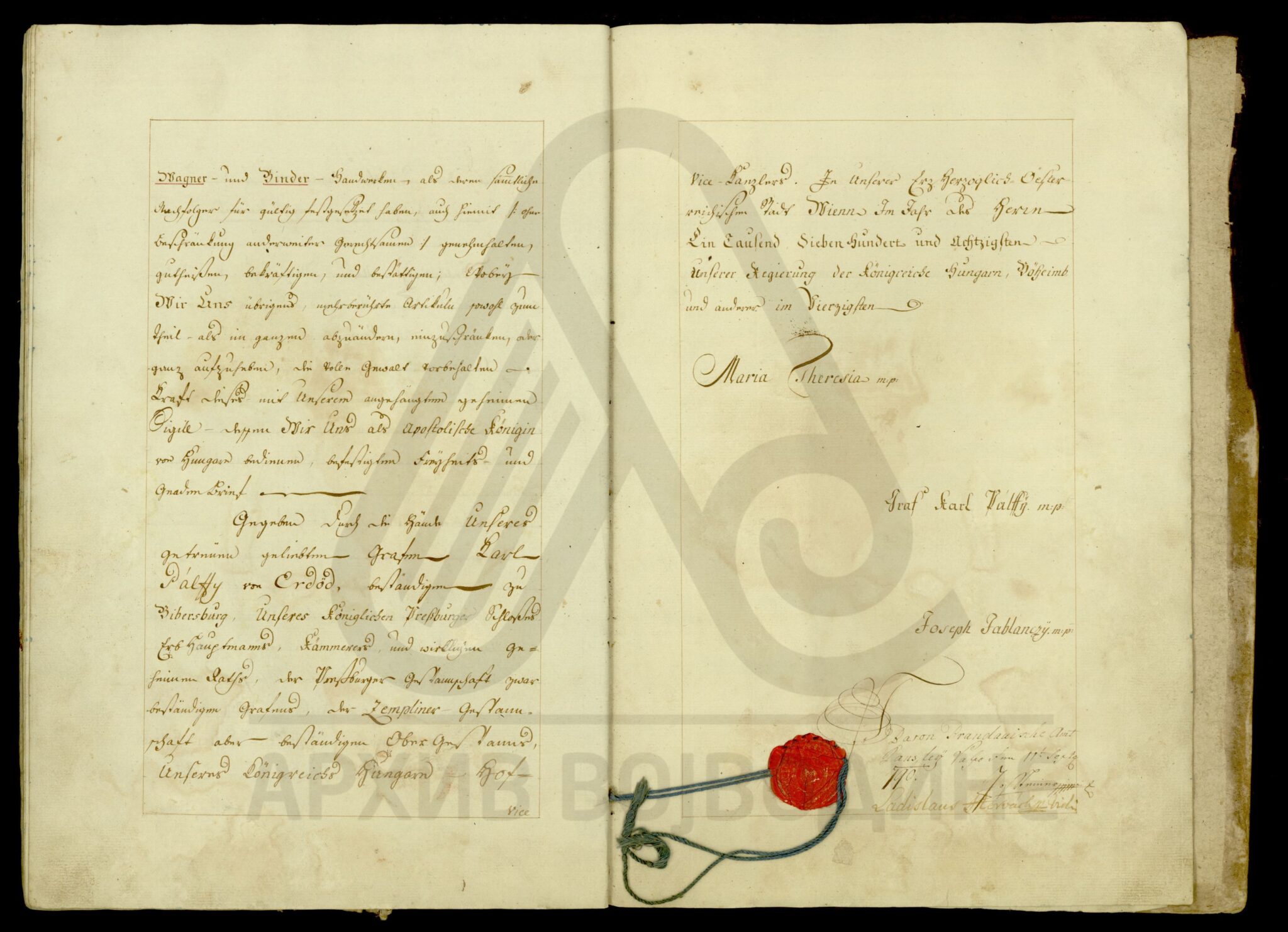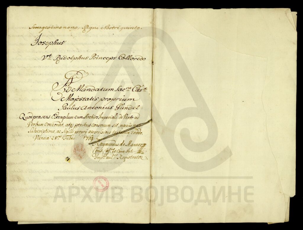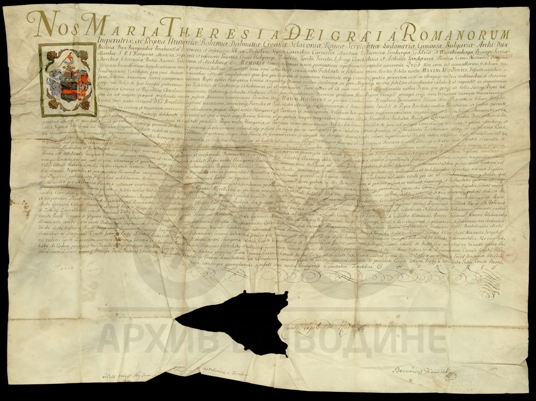 Диплома царице Марије Терезије о даровању племићке титуле, уз право употребе племићког печата, Максиму Мириловићу (Mirillovics), некадашњем заставнику Фелдварске тврђаве (Фелдварског Шанца; Feudvár), његовој жени и деци, као и будућим наследницима именованих, оба пола.