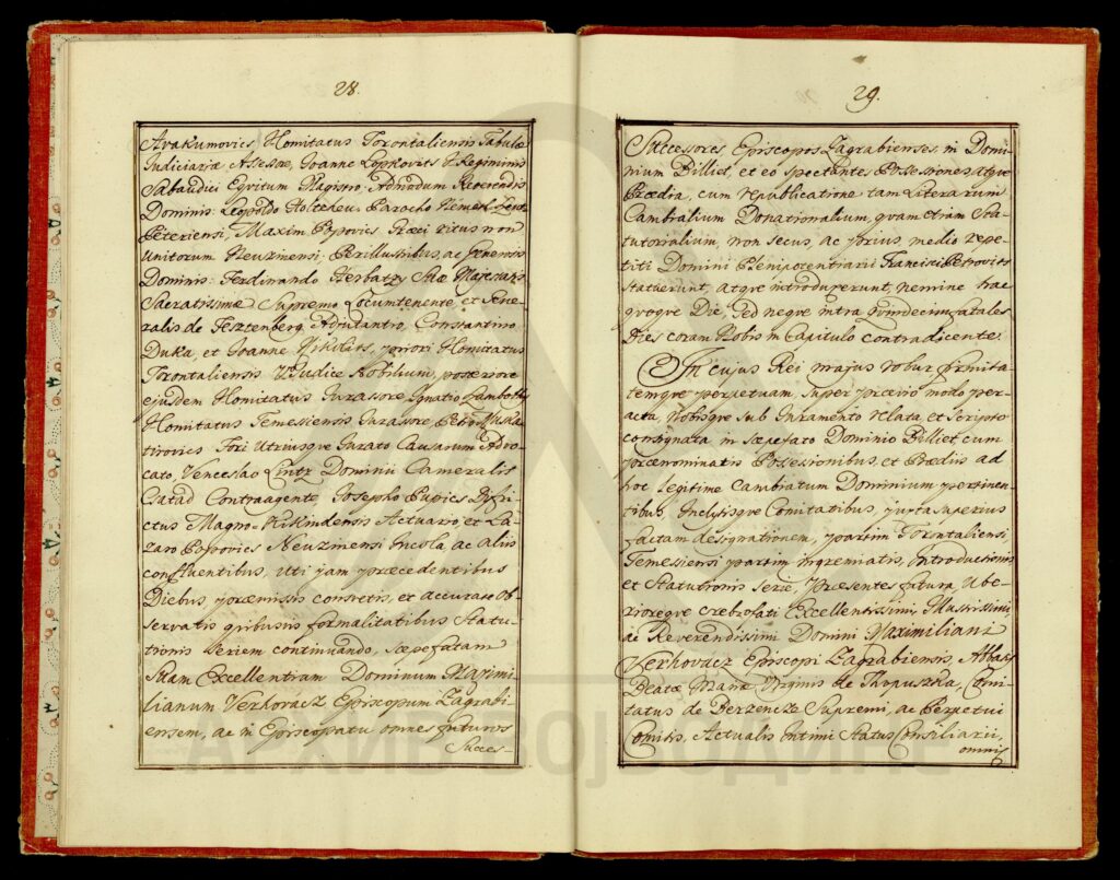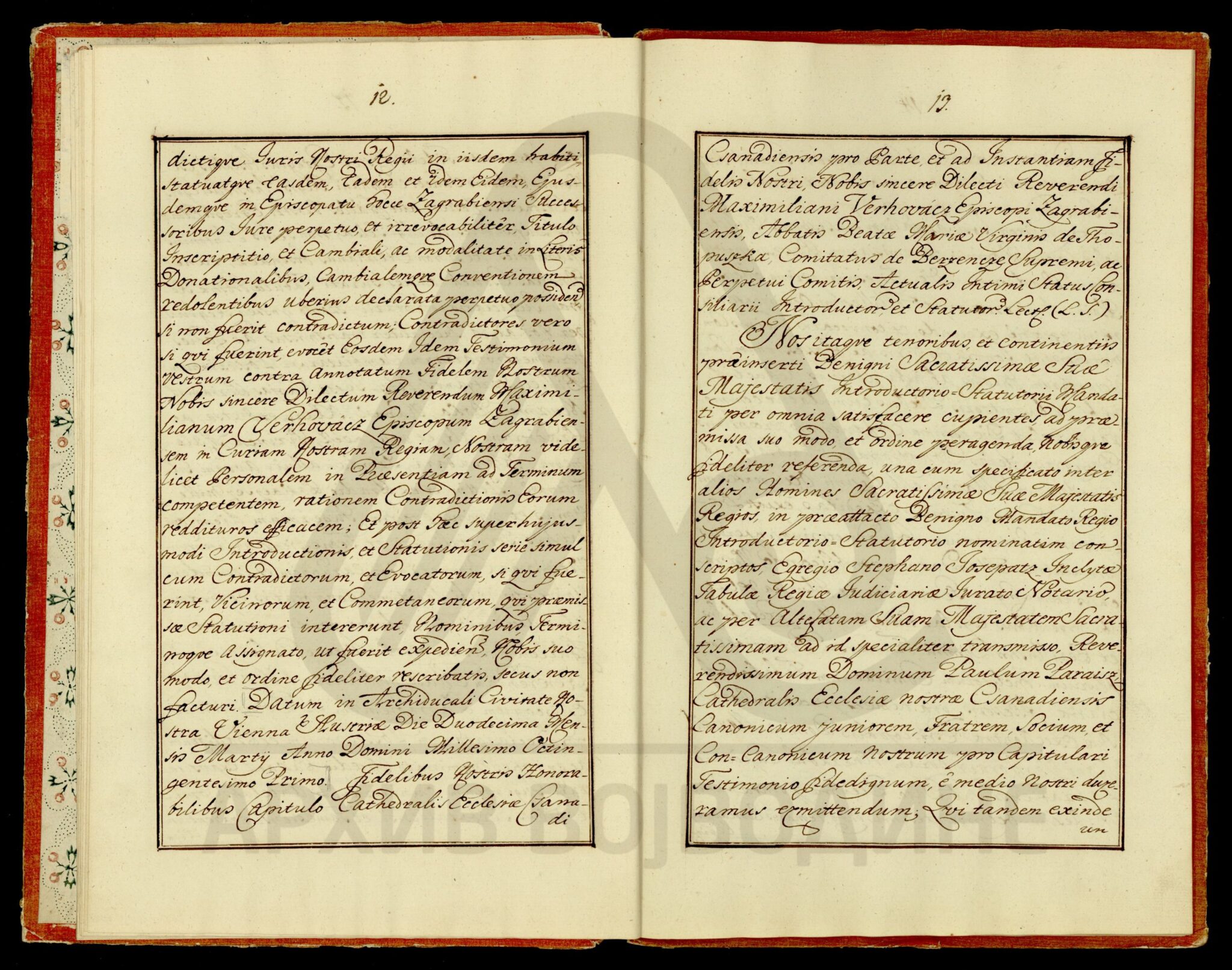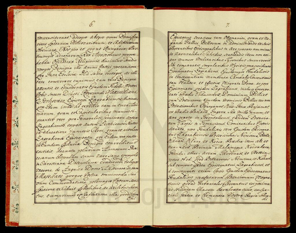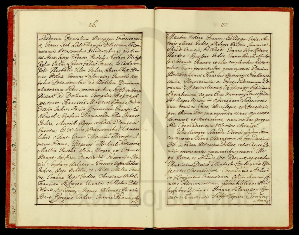 Диплома царице Марије Терезије о даровању племићке титуле, уз право употребе племићког печата, Максиму Мириловићу (Mirillovics), некадашњем заставнику Фелдварске тврђаве (Фелдварског Шанца; Feudvár), његовој жени и деци, као и будућим наследницима именованих, оба пола.