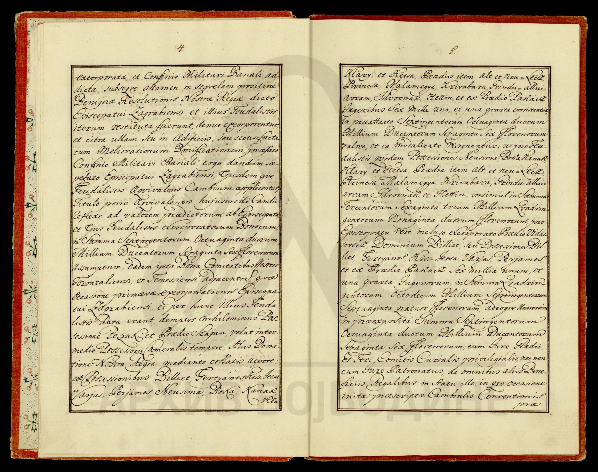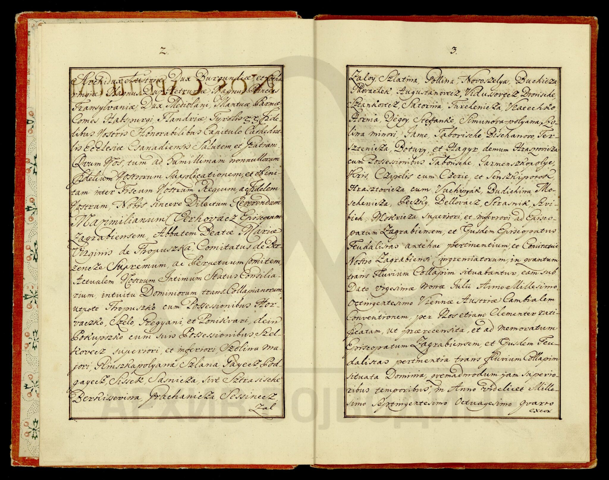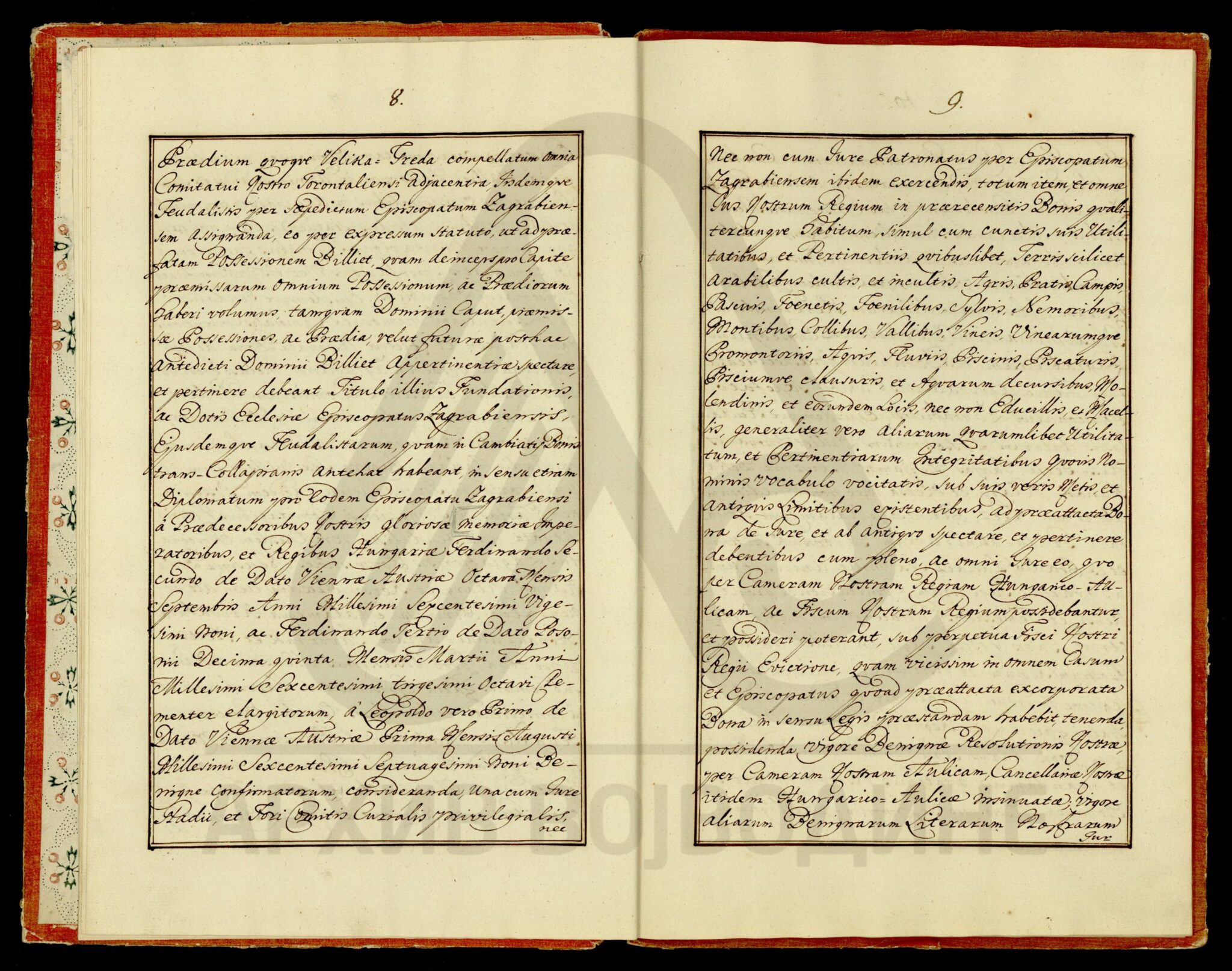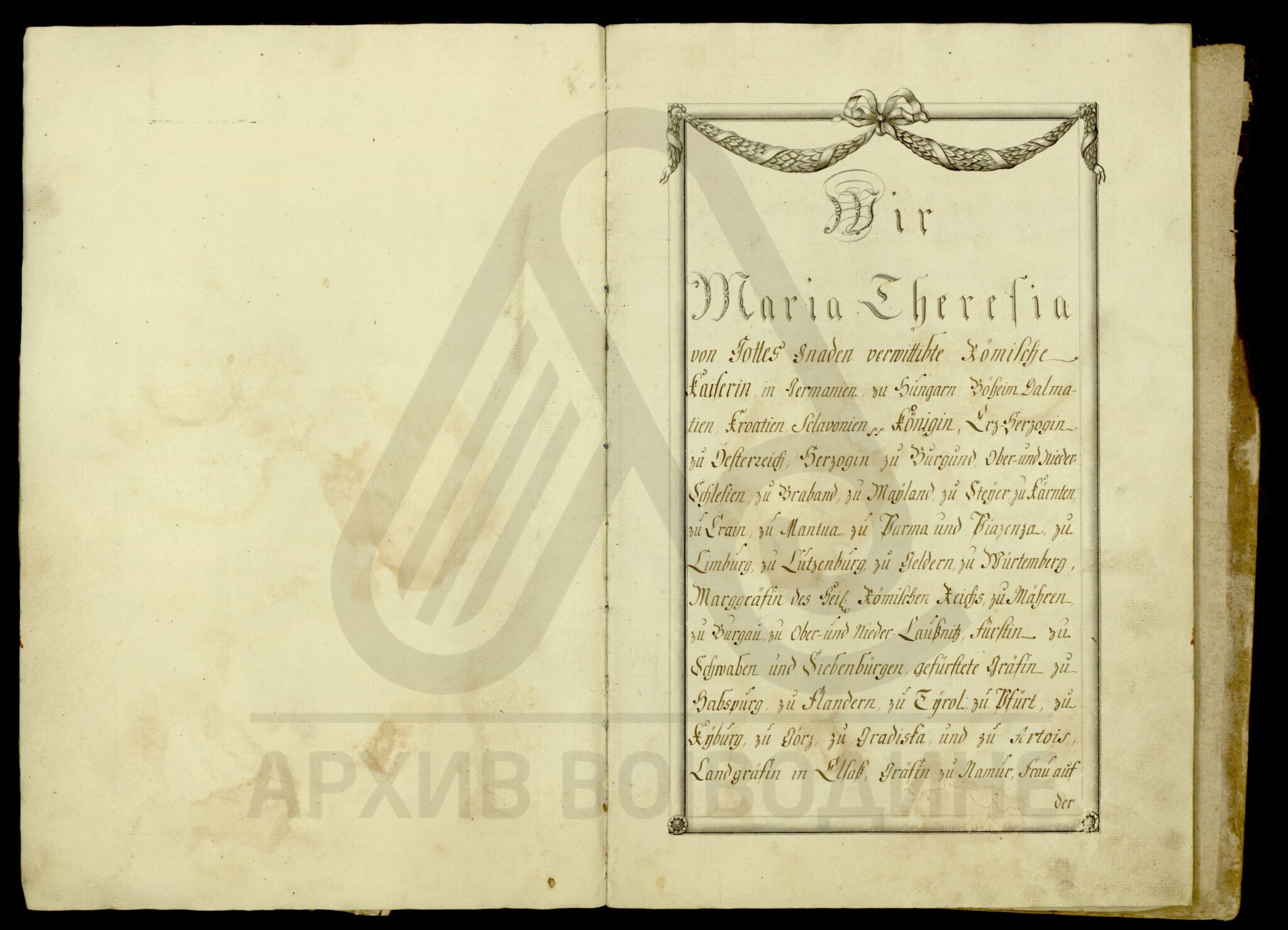 Диплома царице Марије Терезије о даровању племићке титуле, уз право употребе племићког печата, Максиму Мириловићу (Mirillovics), некадашњем заставнику Фелдварске тврђаве (Фелдварског Шанца; Feudvár), његовој жени и деци, као и будућим наследницима именованих, оба пола.