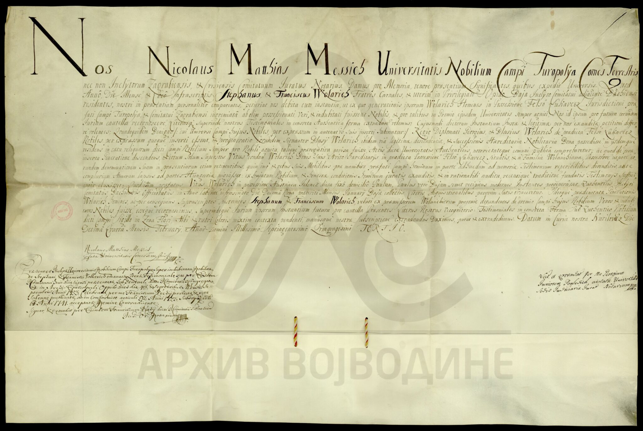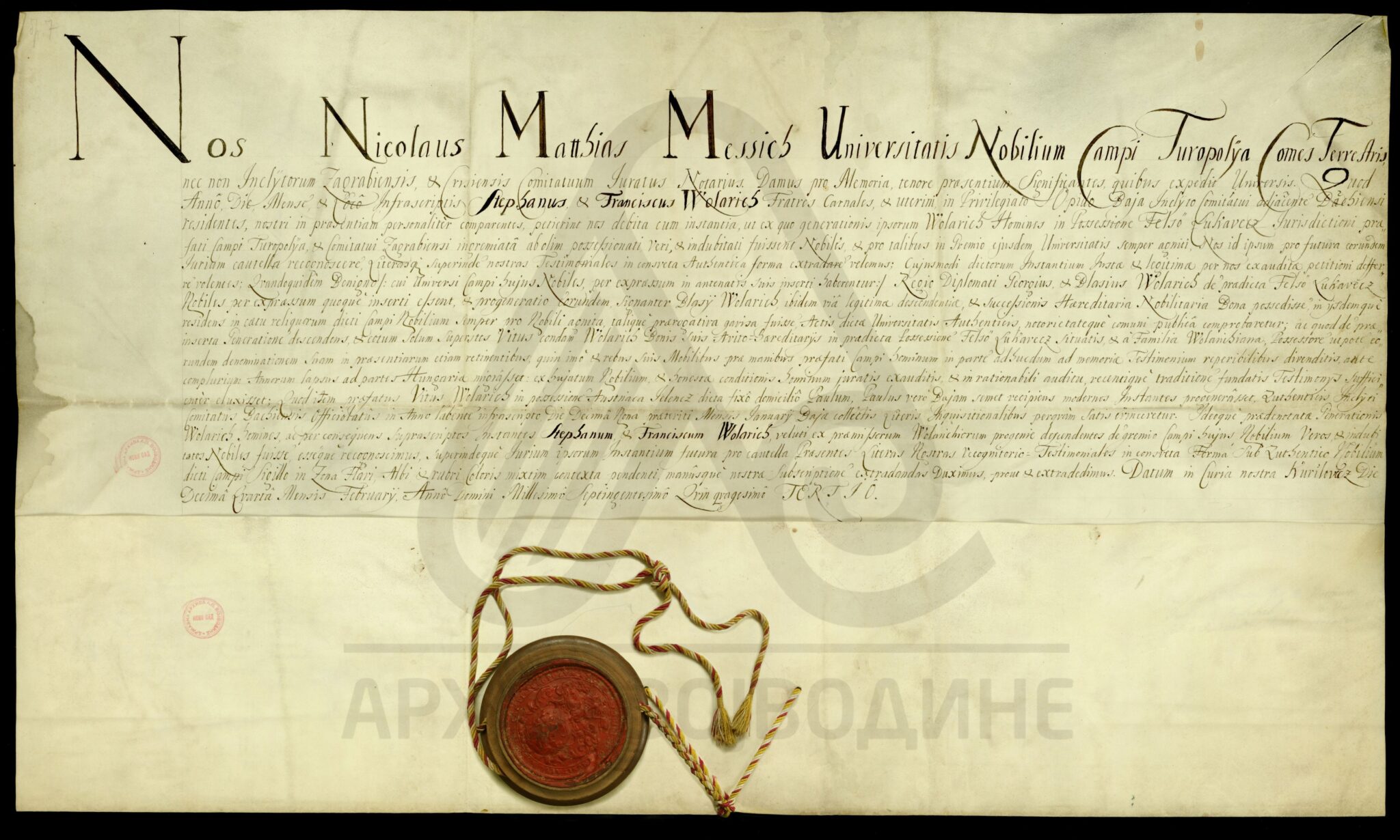 Потврда туропољског грофа и бележника Загребачке и Крижевачке жупаније, Николе Матије Месића (Messich), коју он издаје на захтев браће Стефана и Фрање Воларића (Wolarich), о племству и поседу места Фелсо Лукавец (Felsö Lukavecz) које се налази под управом Туропоља, на територији Загребачке жупаније.