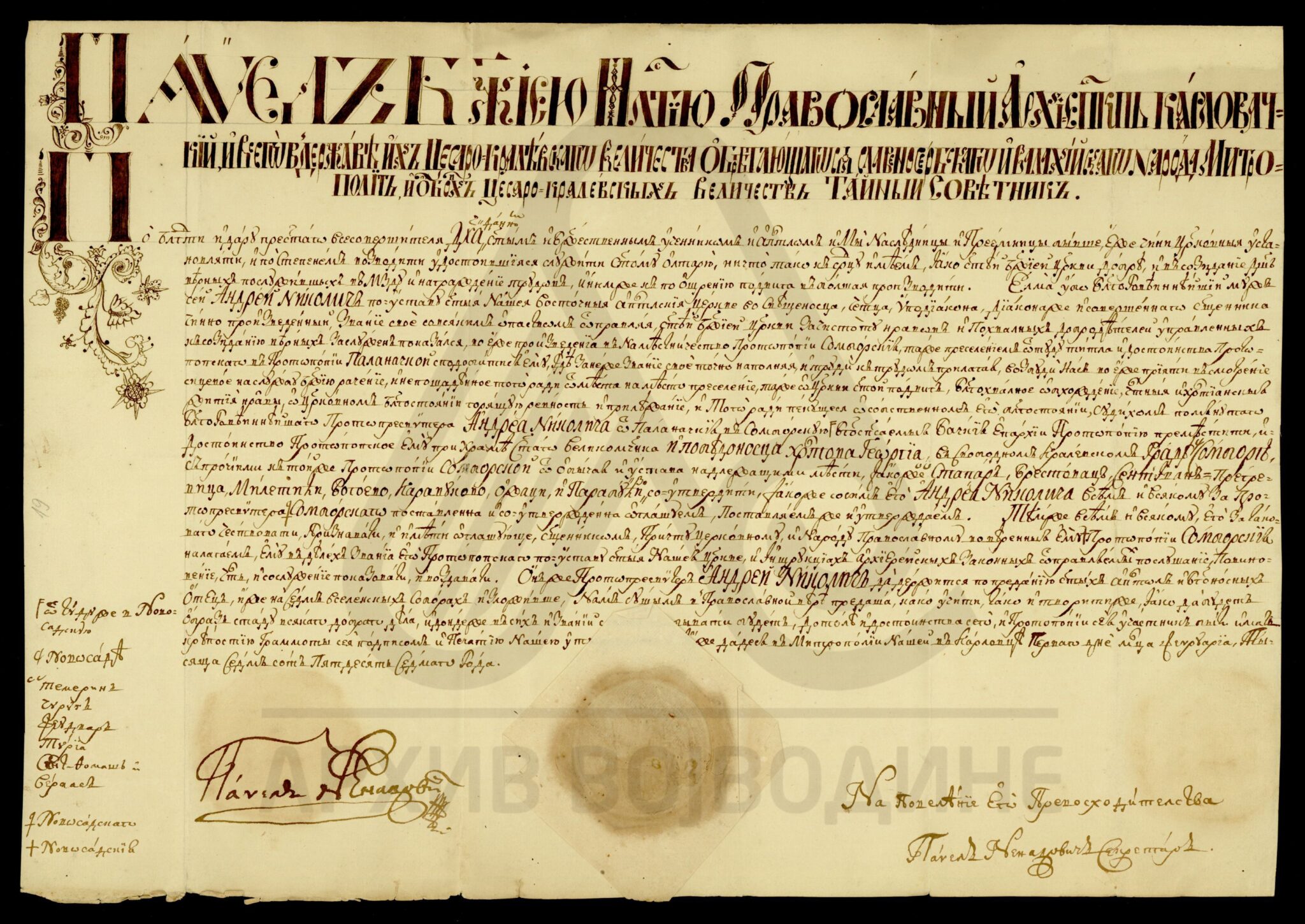 Диплома (грамата) карловачког архиепископа и митрополита Павла Ненадовића о постављењу Андрије Николића за сомборског протопрезвитера (протојереја).