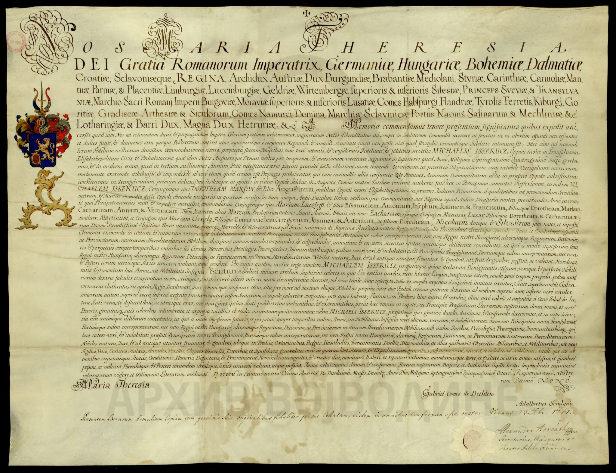 Диплома царице Марије Терезије о даровању племићке титуле, уз право употребе племићког печата, грађанину и становнику вароши Елизабетополиса у Трансилванији, Михајлу Исекуцију (Issekucz) и његовој породици, као и будућим наследницима оба пола.