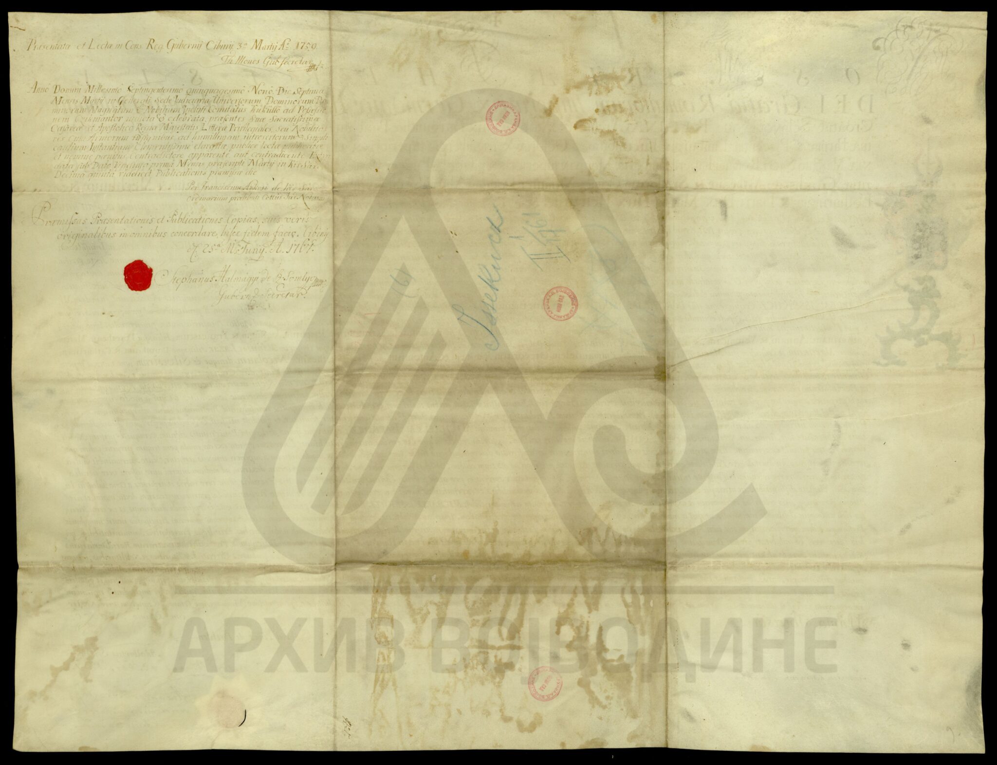 Пергамент, латински језик, 1 лист (велики формат), рукопис, очуван, воштани печат у кутији.