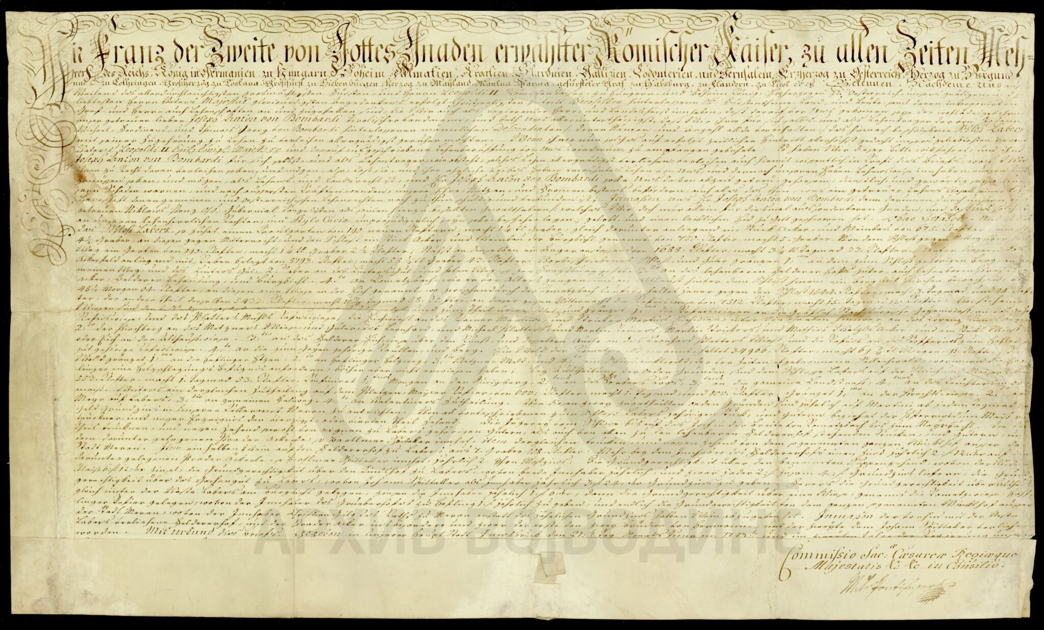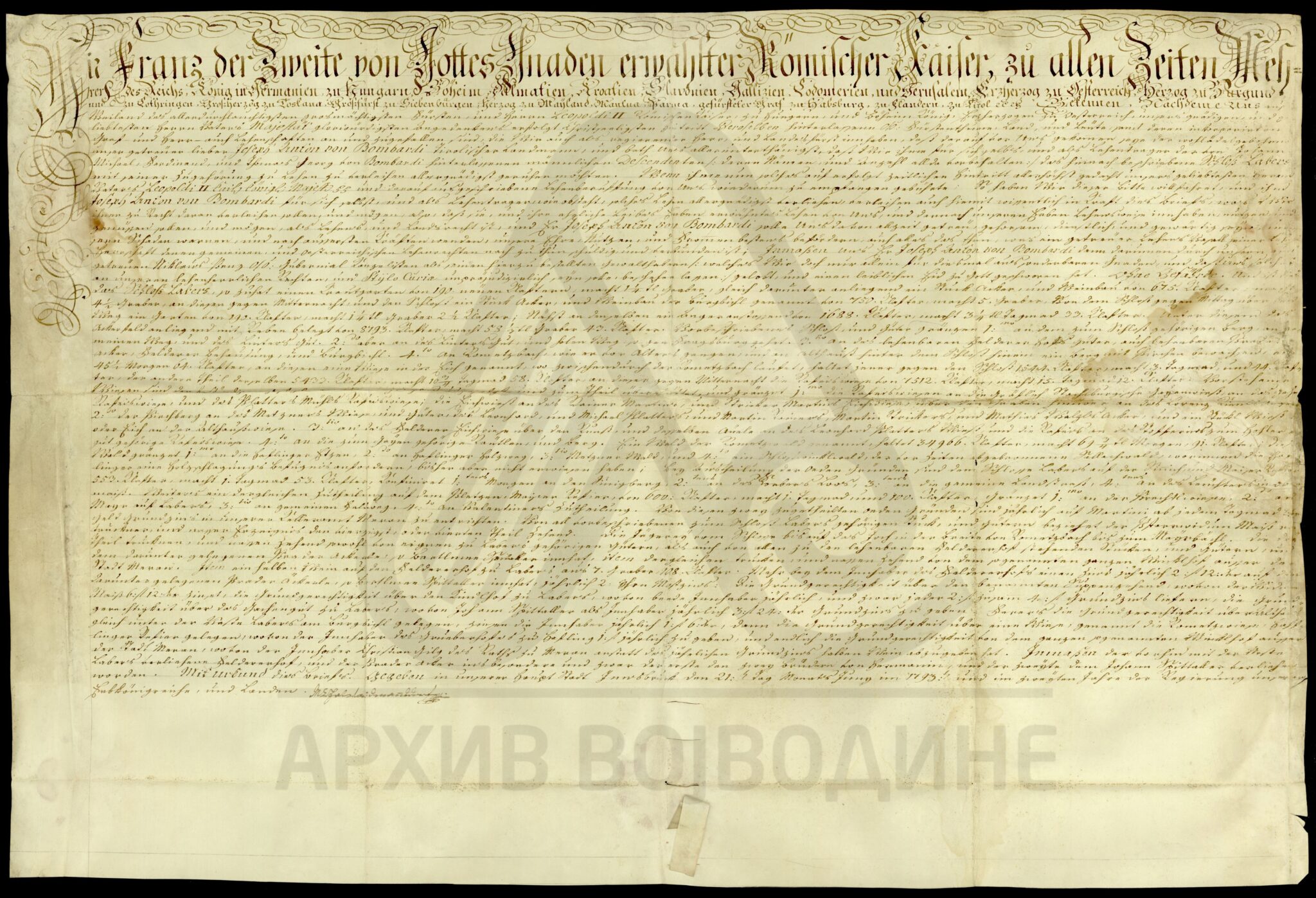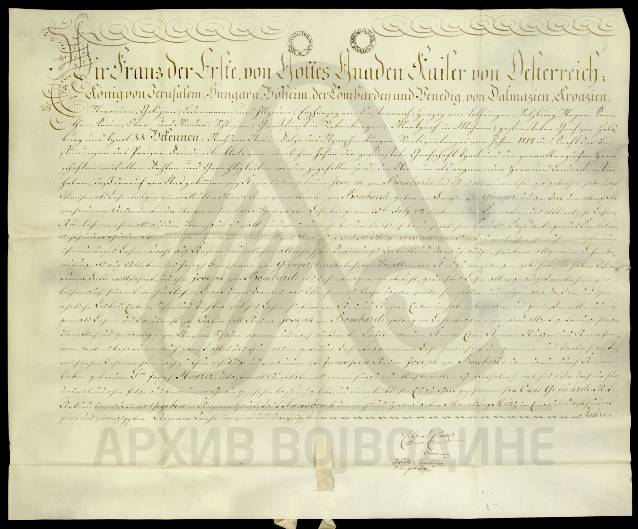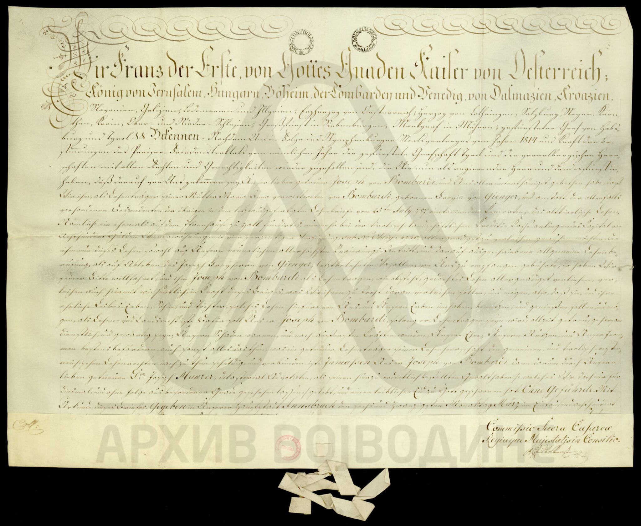 Диплома аустријског цара Франца I о даровању племићу Јосифу фон Бомбарију (von Bombardi) и његовим наследницима поседа у вредности од 800 аустријских форинти на који има право по својој мајци, удовици Ани Бомбарди.