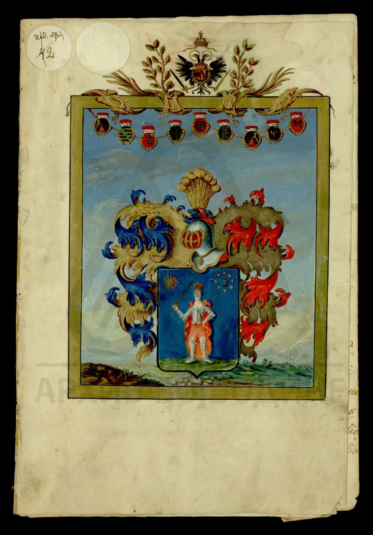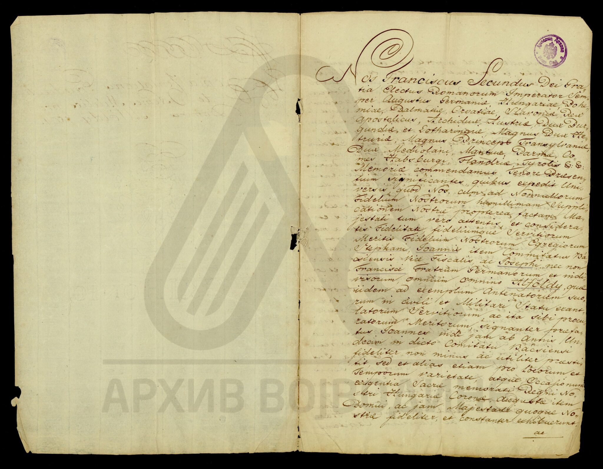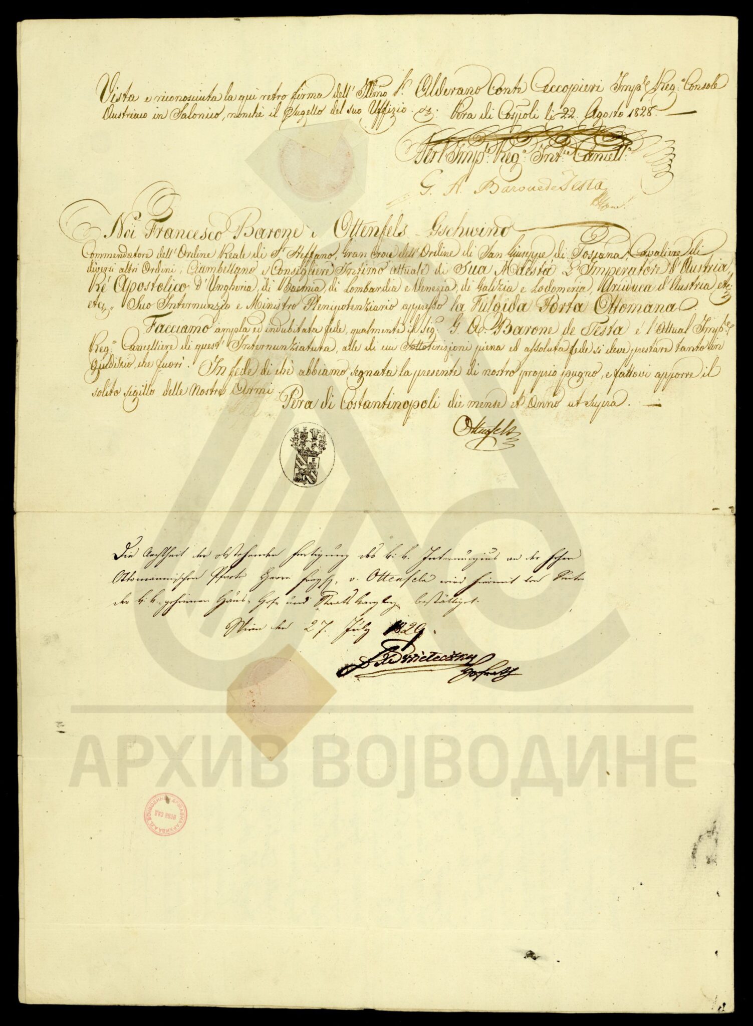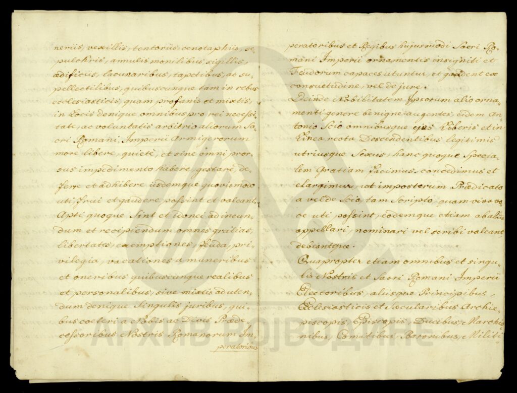 Диплома аустријског цара Франца I о даровању племићу Јосифу фон Бомбарију (von Bombardi) и његовим наследницима поседа у вредности од 800 аустријских форинти на који има право по својој мајци, удовици Ани Бомбарди.