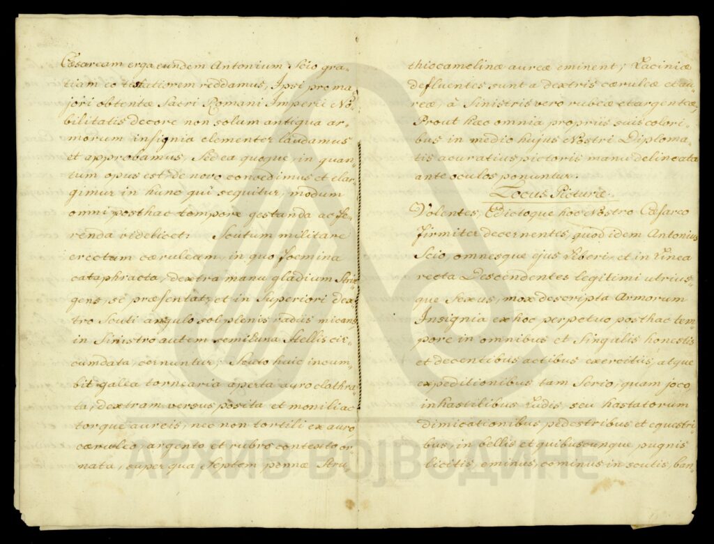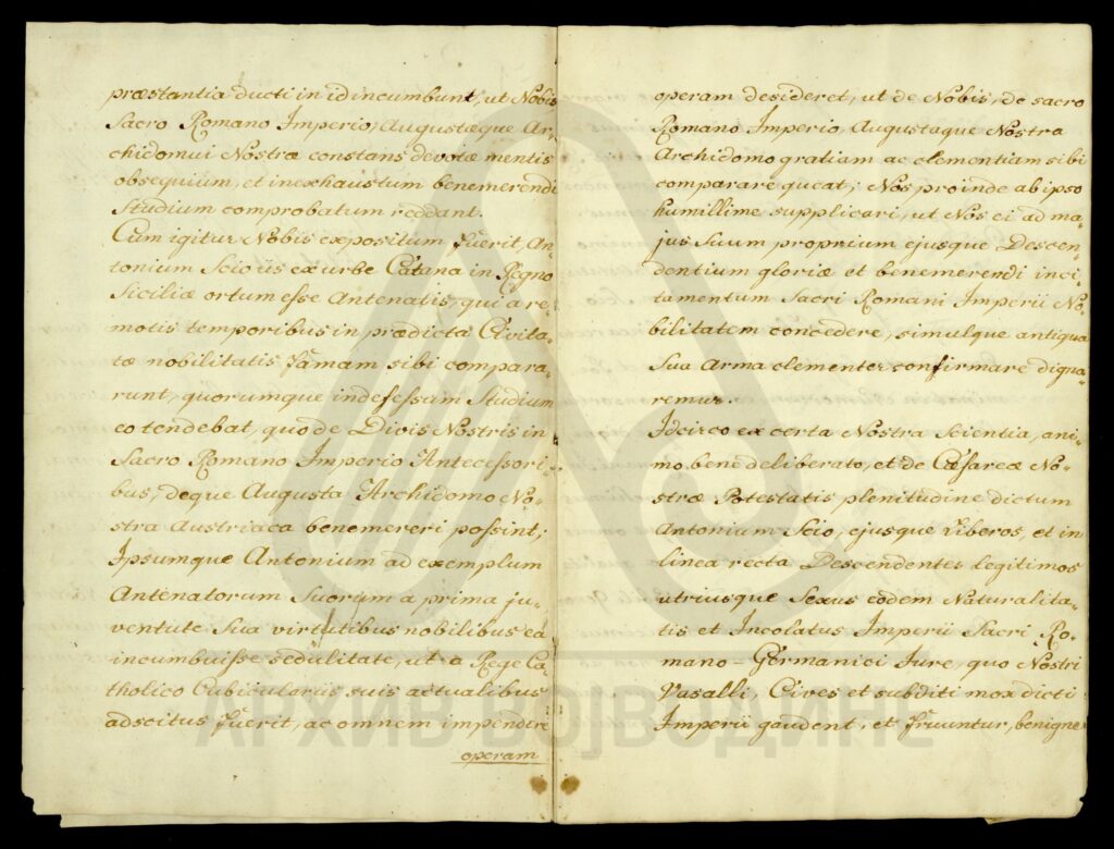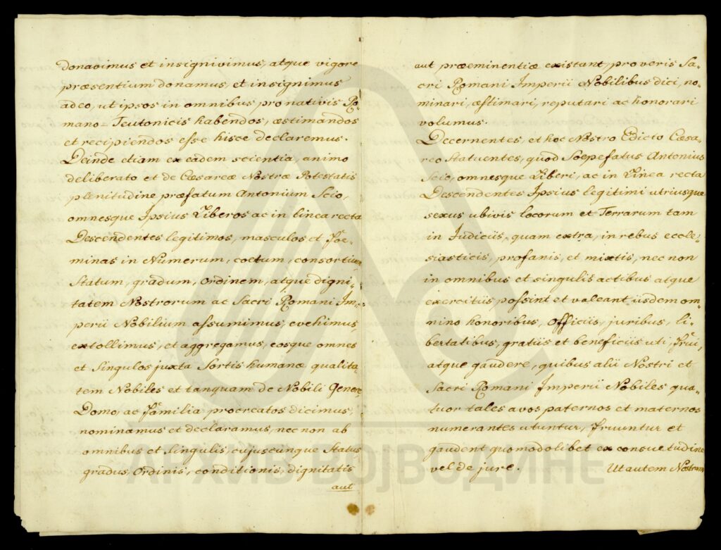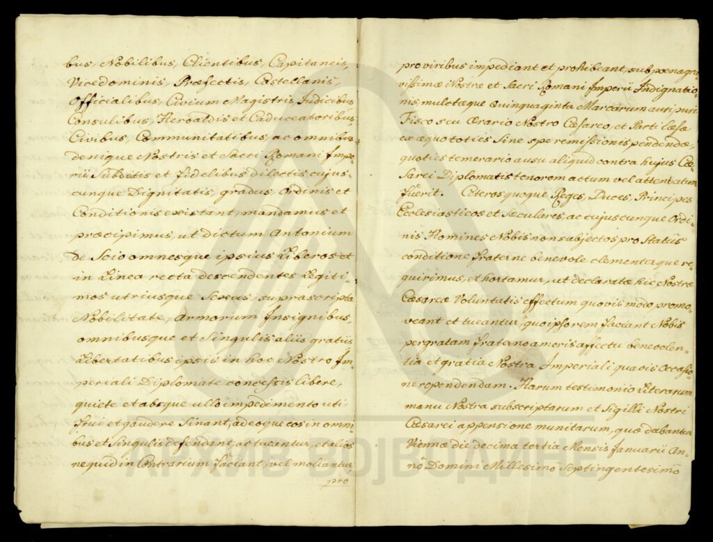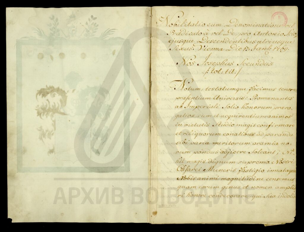Диплома Јосифа II којом се Антонијe Сојо (Soio), чији су преци пореклом из града Катана (Catana) у Краљевству Сицилији, и његови законити наследници оба пола, уводи у ред племства Светог римског царства уз право употребе предиката „а“ или „де“ Сојо (a vel de Soio).