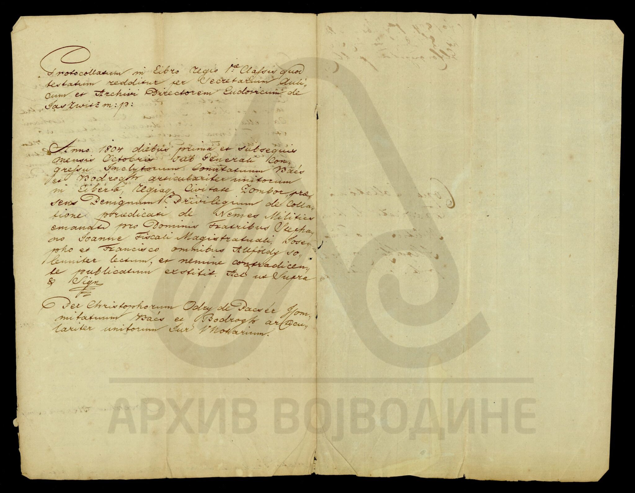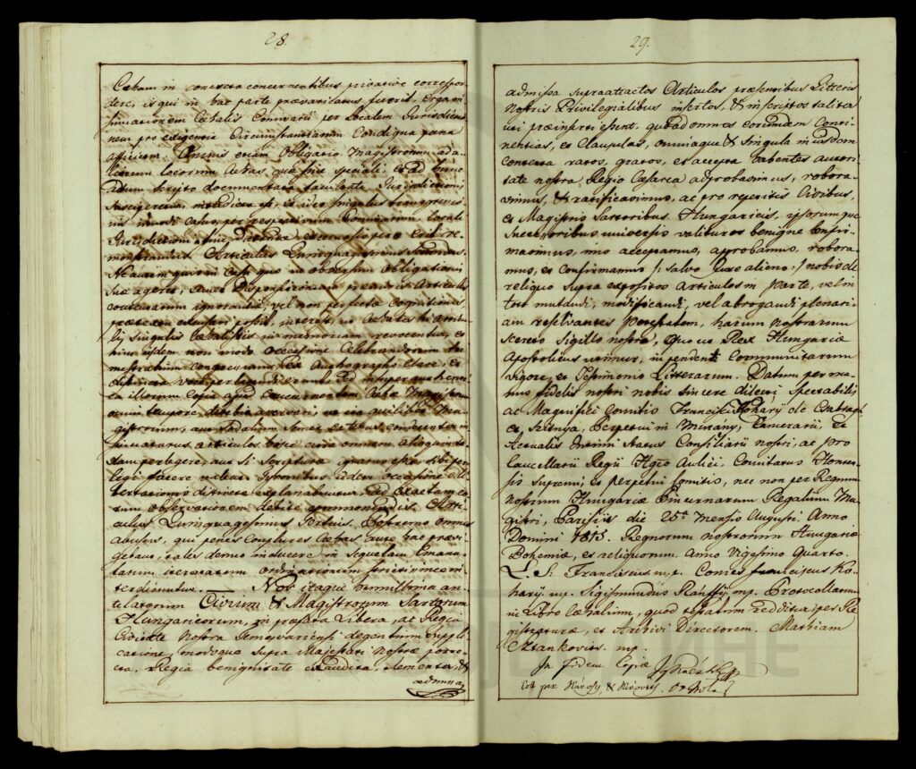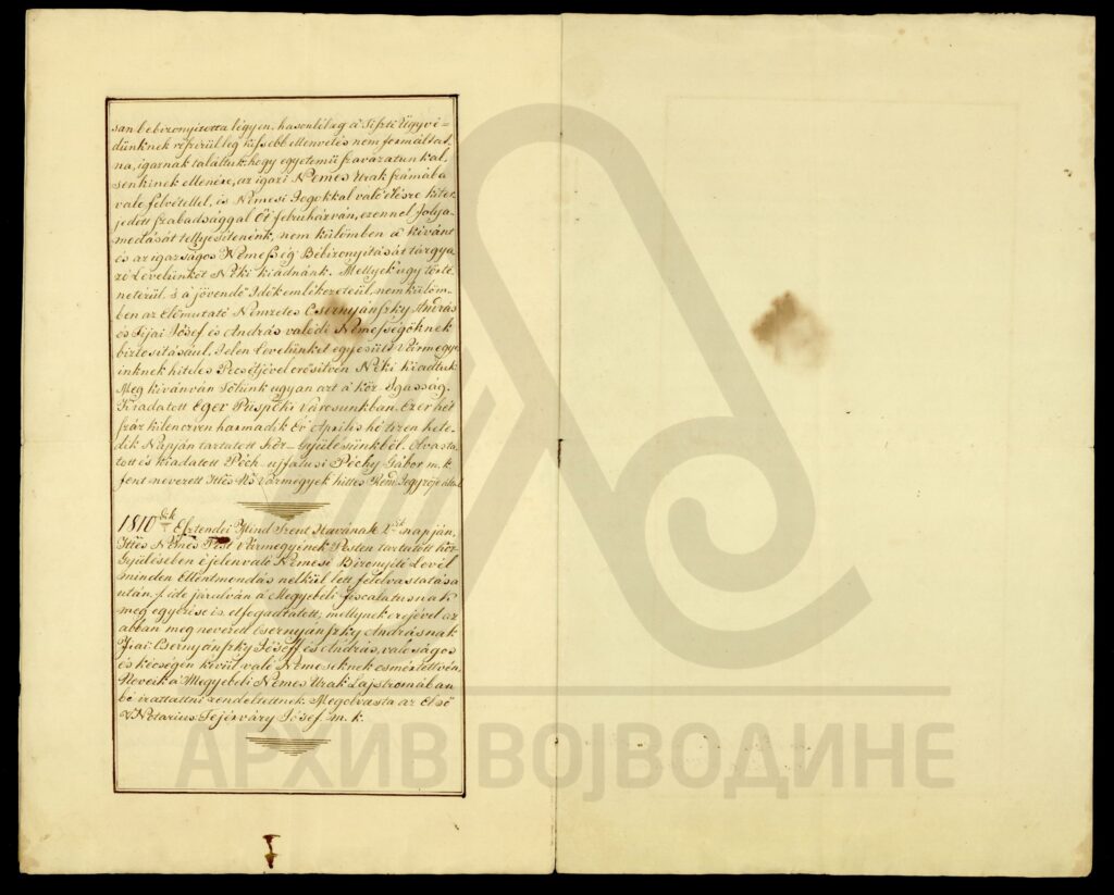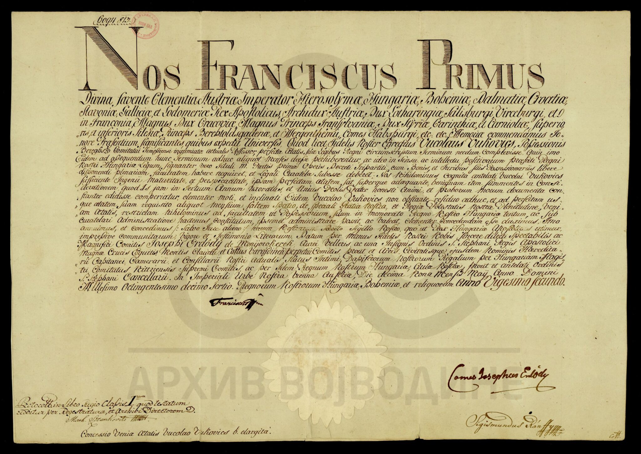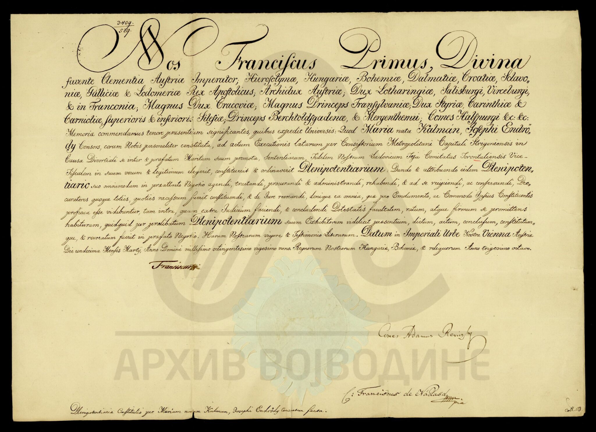 Сведочанство аустријског цара Франца I о именовању подфишкала Торонталске жупаније Лудвига Феја (Feja) за правног заступника од стране Марије рођене Калман (Каlmán), жене Јожефа Ендредија (Endeödy), у ствари њихове бракоразводне парнице.