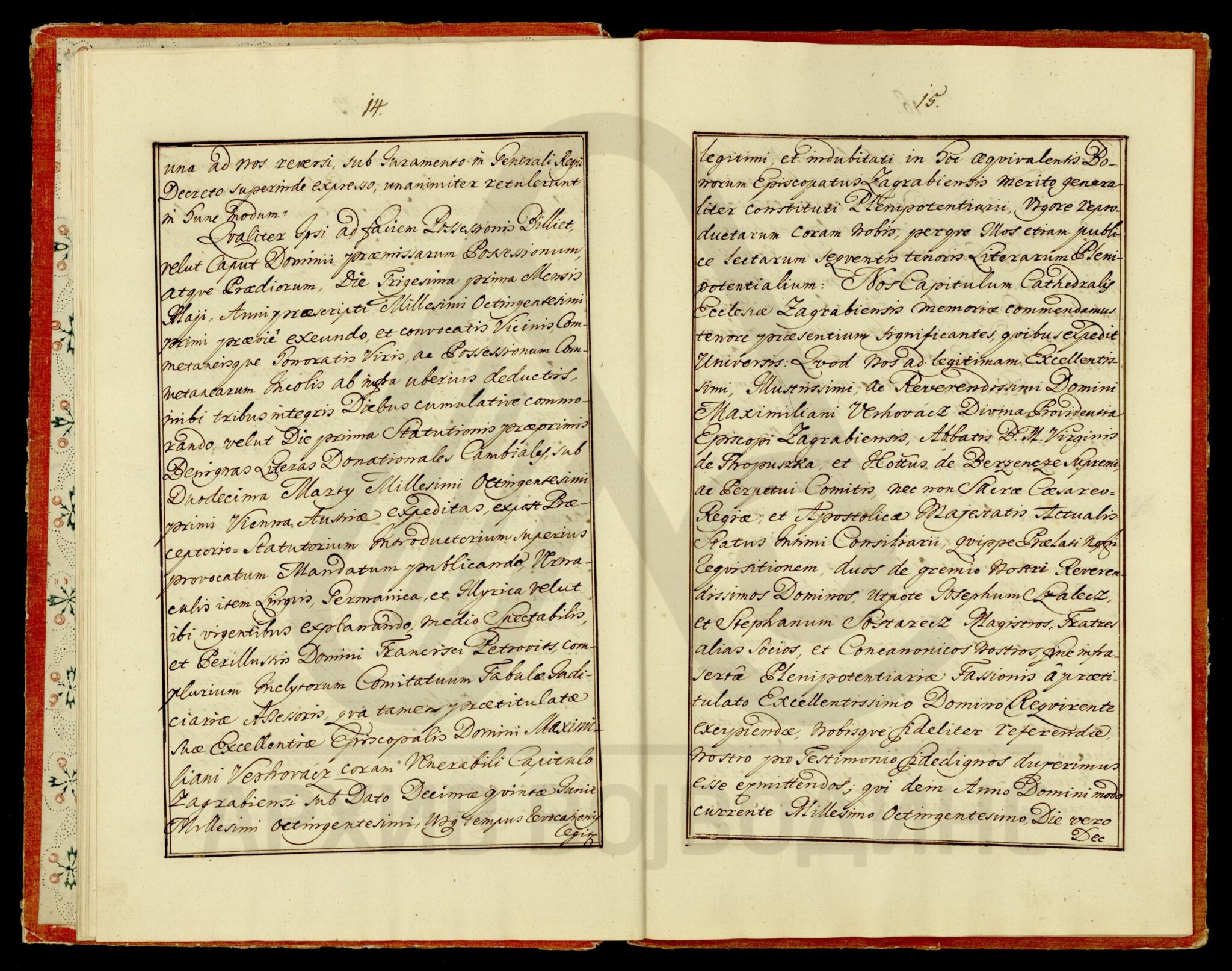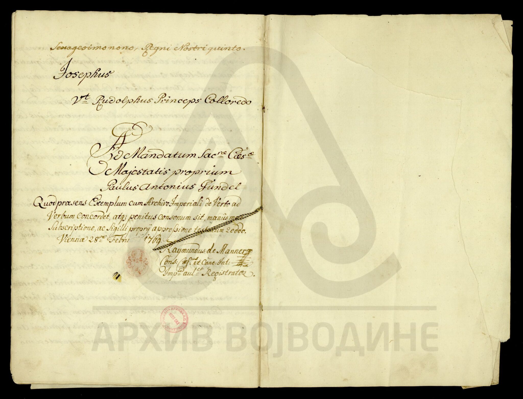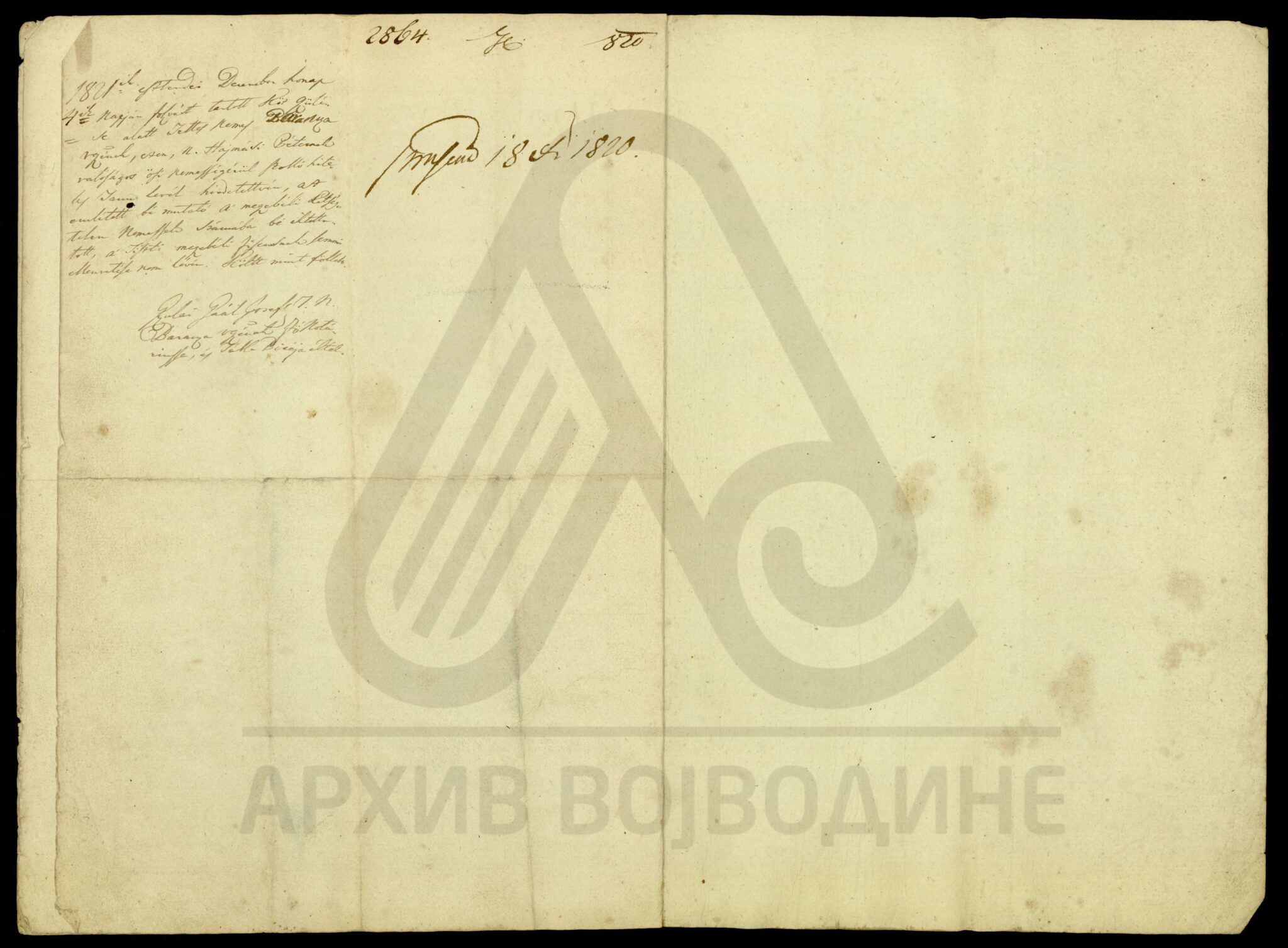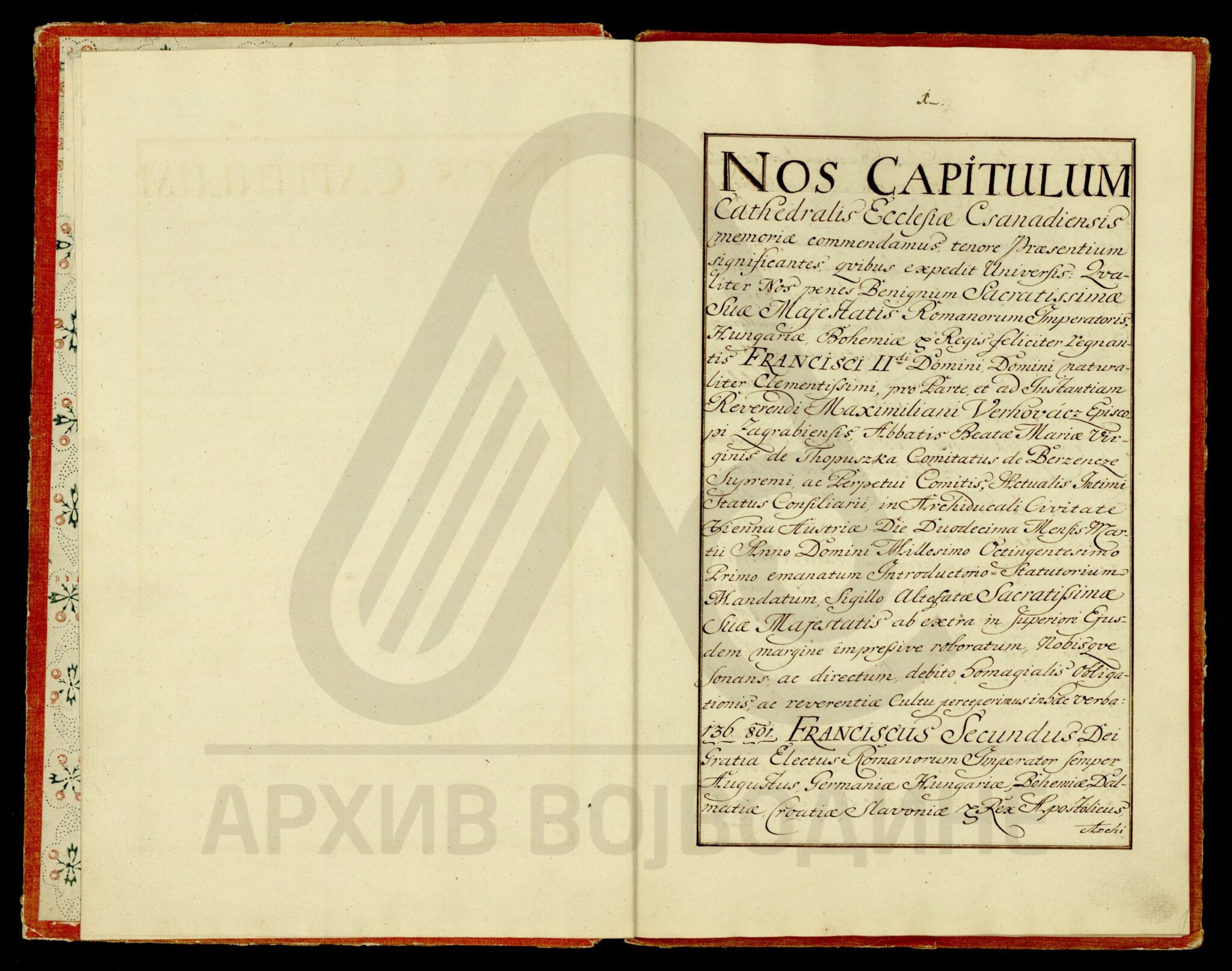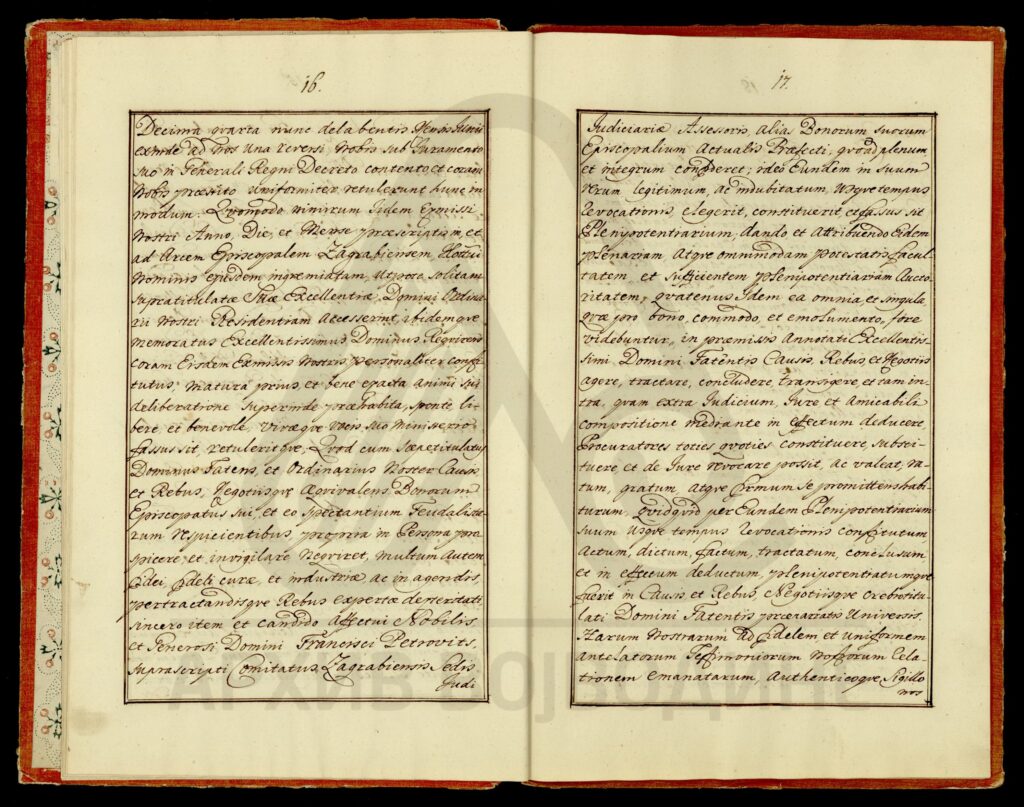 Сведочанство аустријског цара Франца I о именовању подфишкала Торонталске жупаније Лудвига Феја (Feja) за правног заступника од стране Марије рођене Калман (Каlmán), жене Јожефа Ендредија (Endeödy), у ствари њихове бракоразводне парнице.
