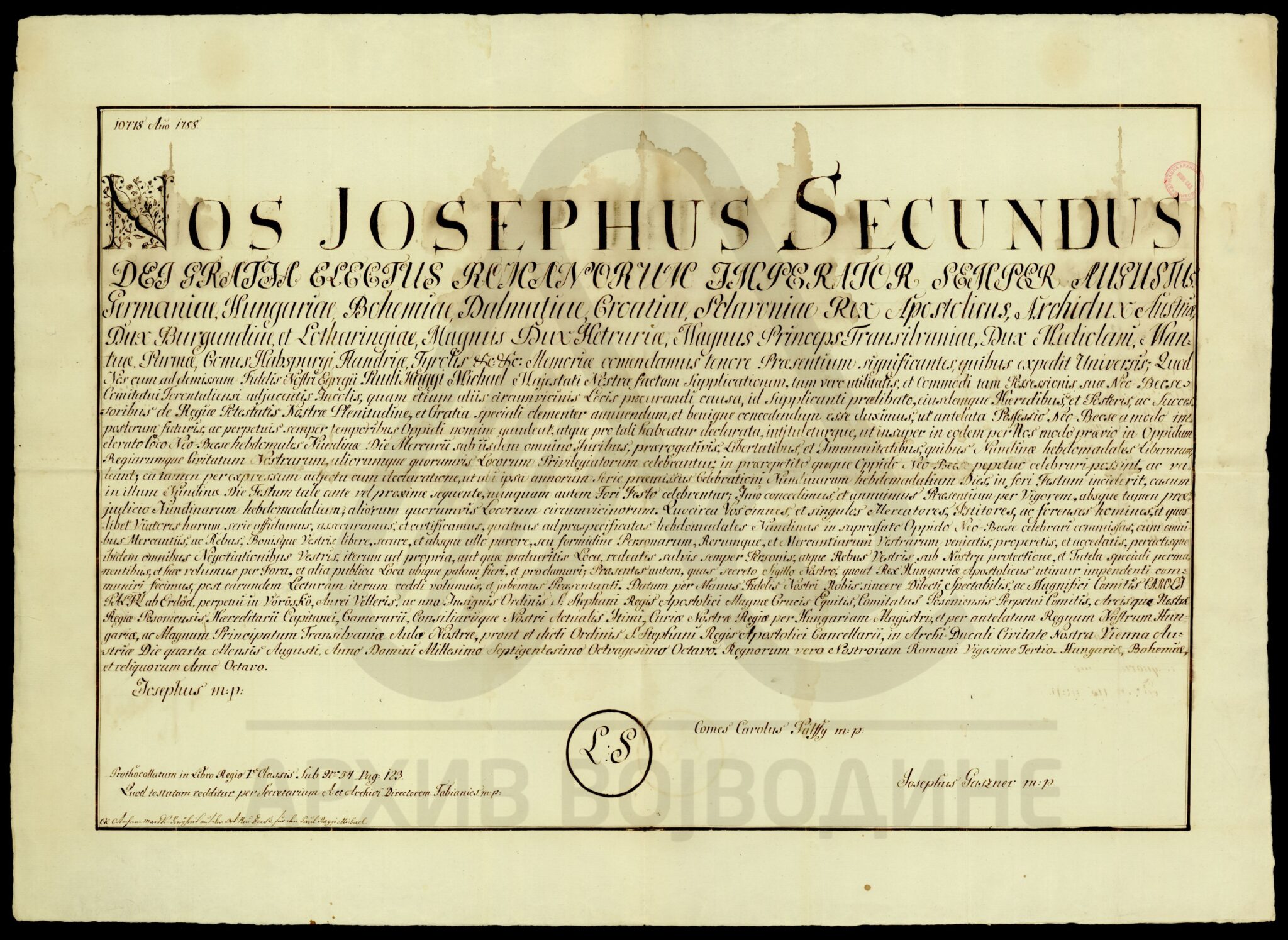 Проглас цара Јосифа II о додељивању статуса вароши месту Нови Бечеј (Neo-Becse) на територији Торонталске жупаније, уз право одржавања седмичних вашара (средом).