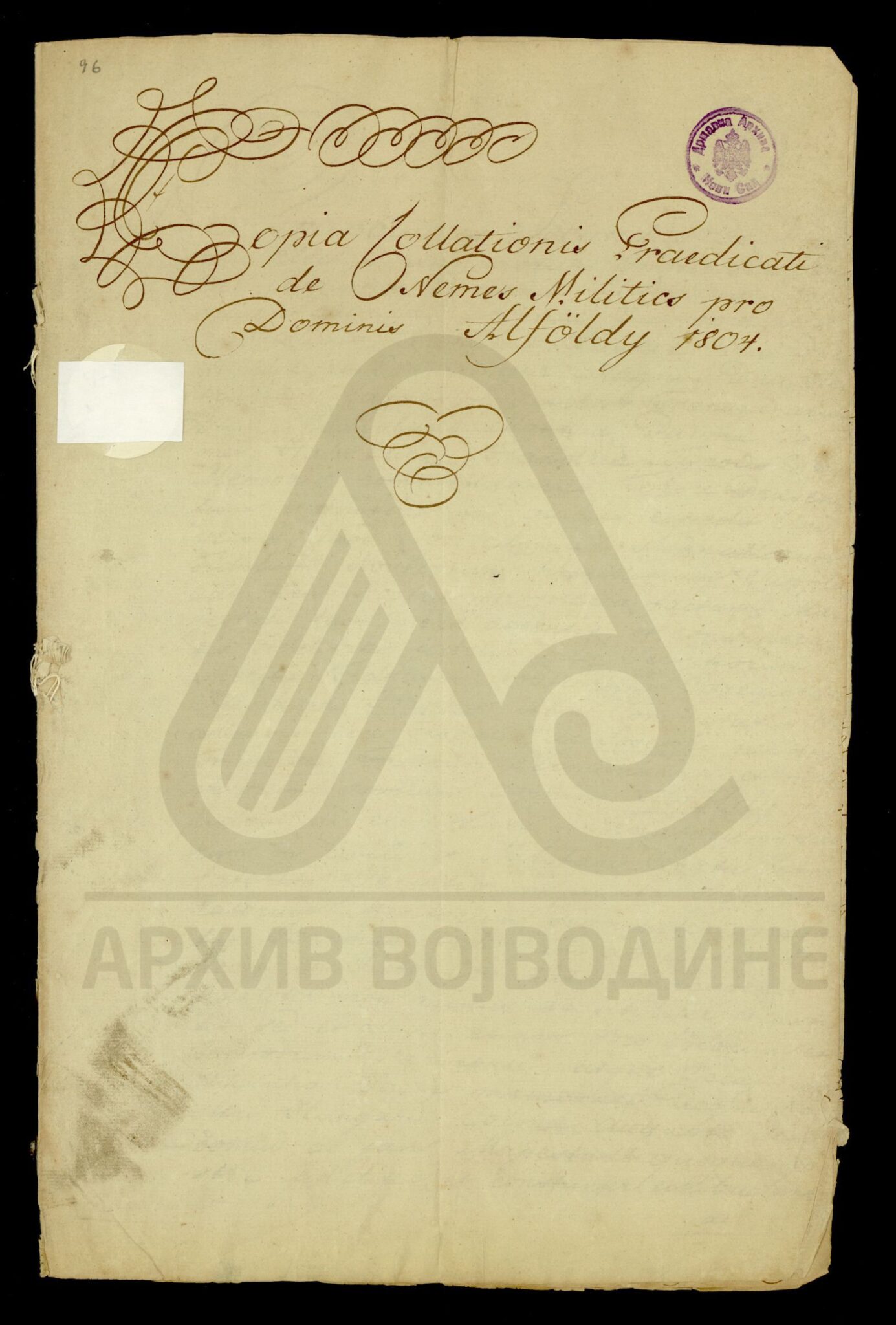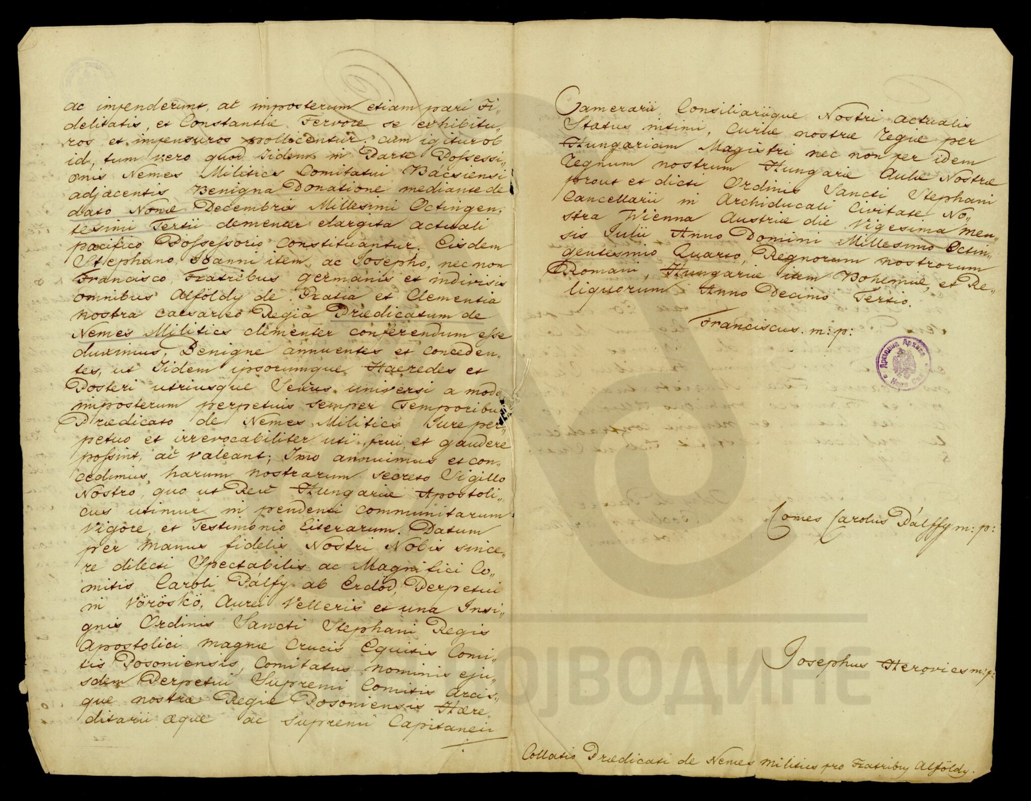 Диплома цара Франца II којом се браћи Алфелди (Alföldy), којима је 1803. године дотирано место Немеш Милитић (Nemes Militics; Светозар Милетић) на територији Бачке жупаније, додељује предикат де Немеш Милитић (de Nemes Militics).