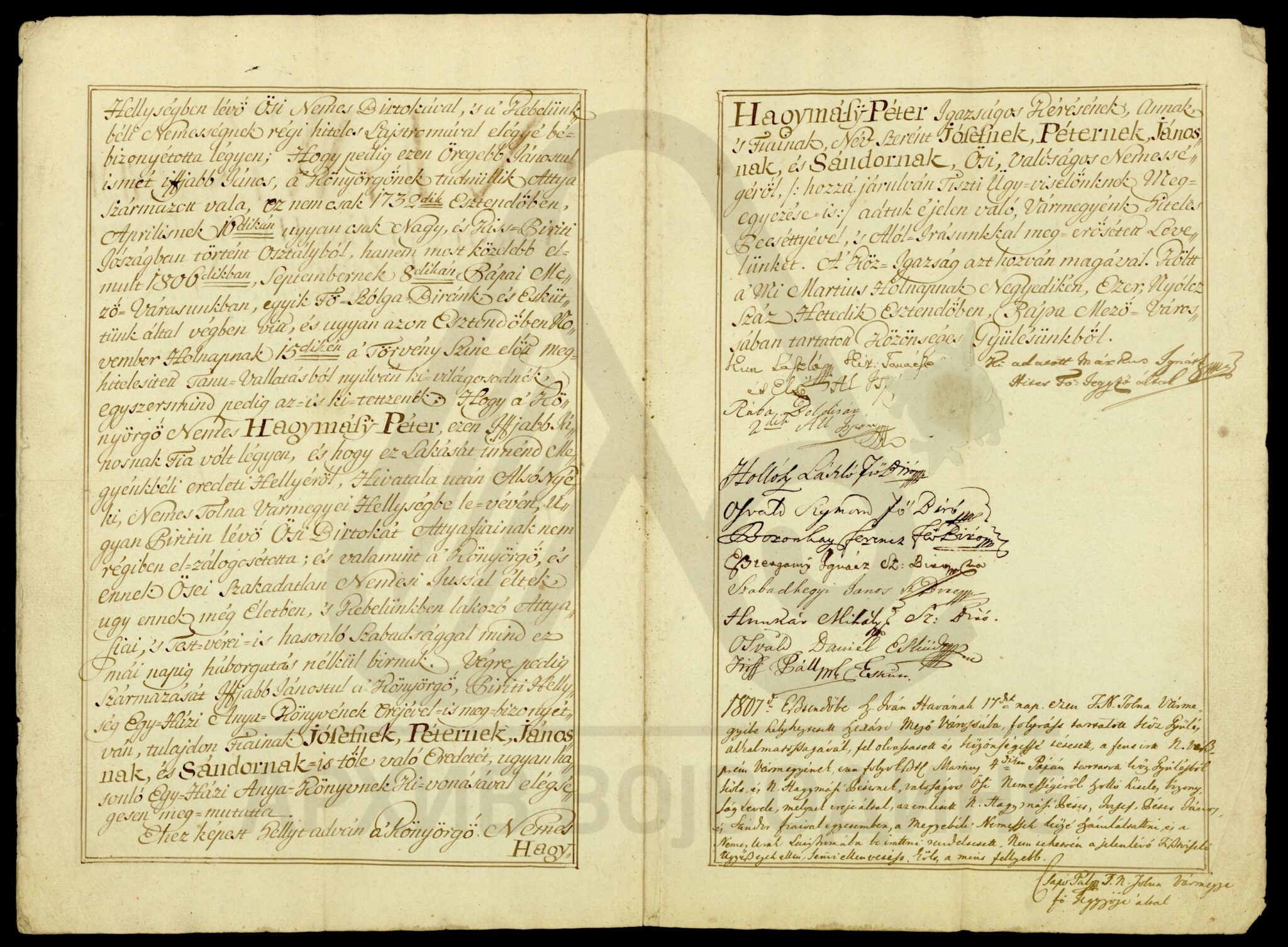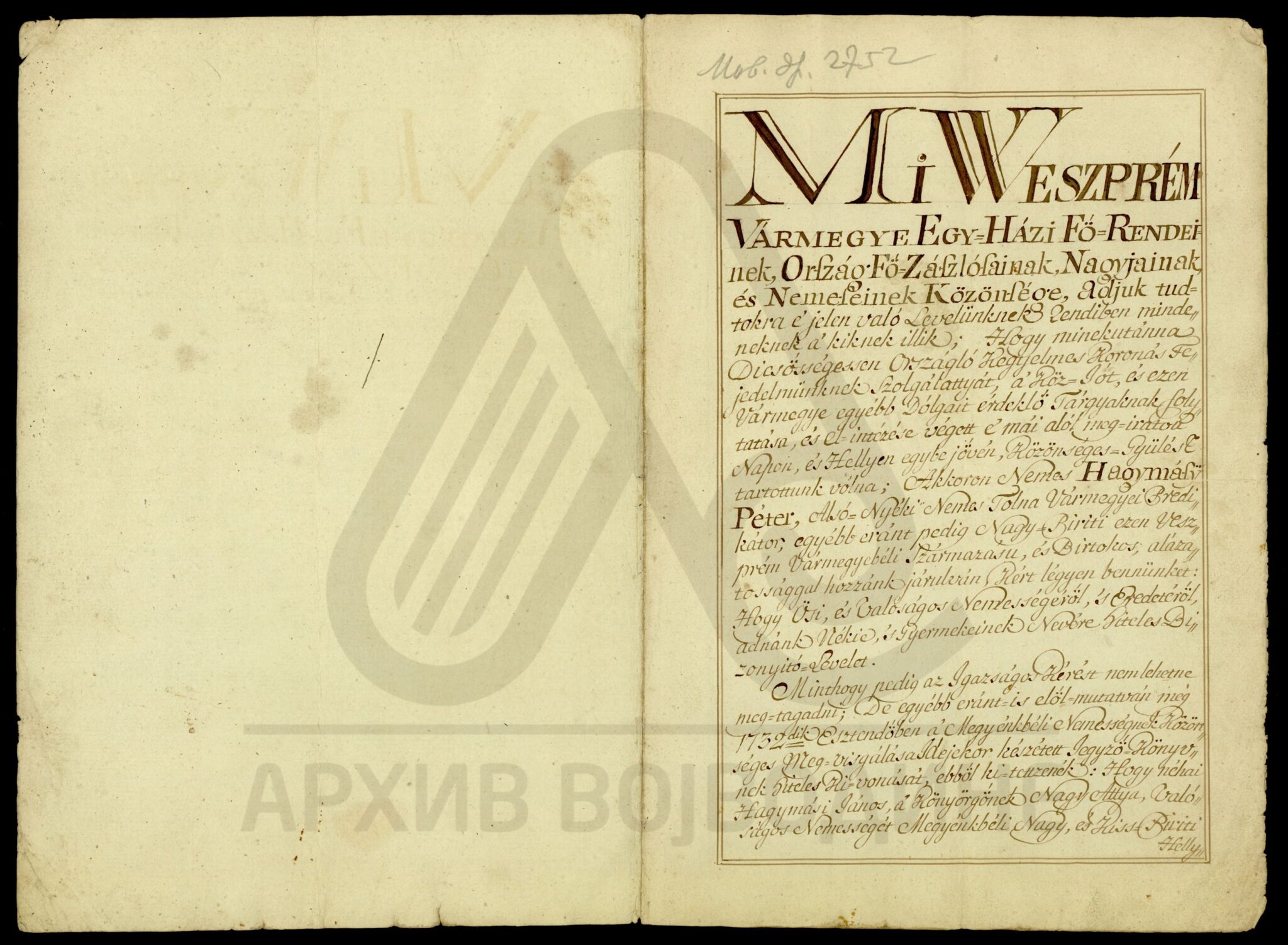 Потврда жупаније Веспрем о племству Хађмаши Петера (Hagymásÿ Péter).
