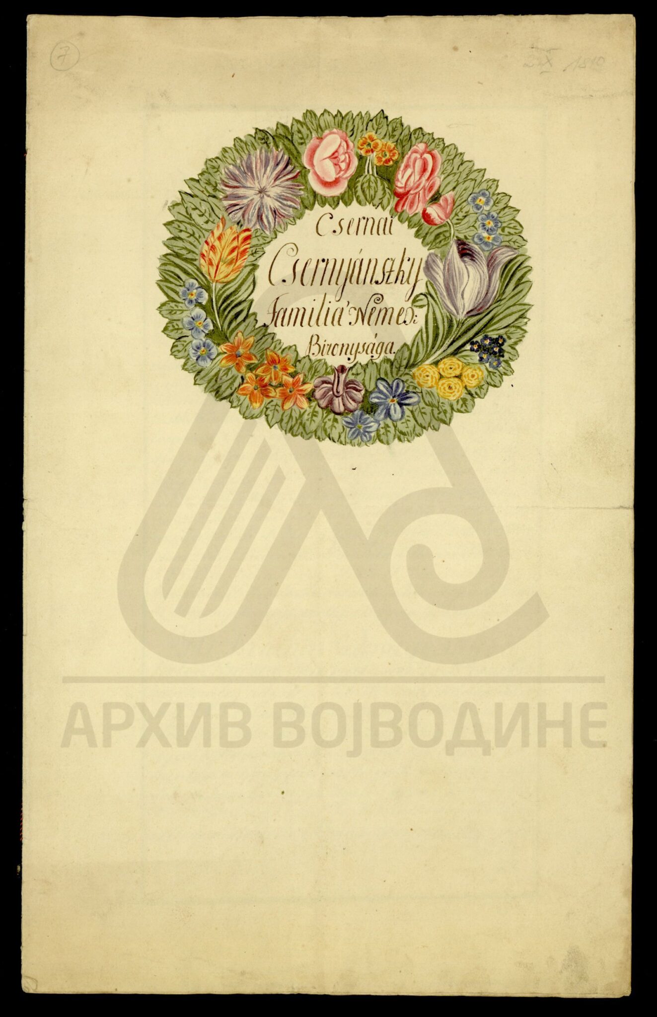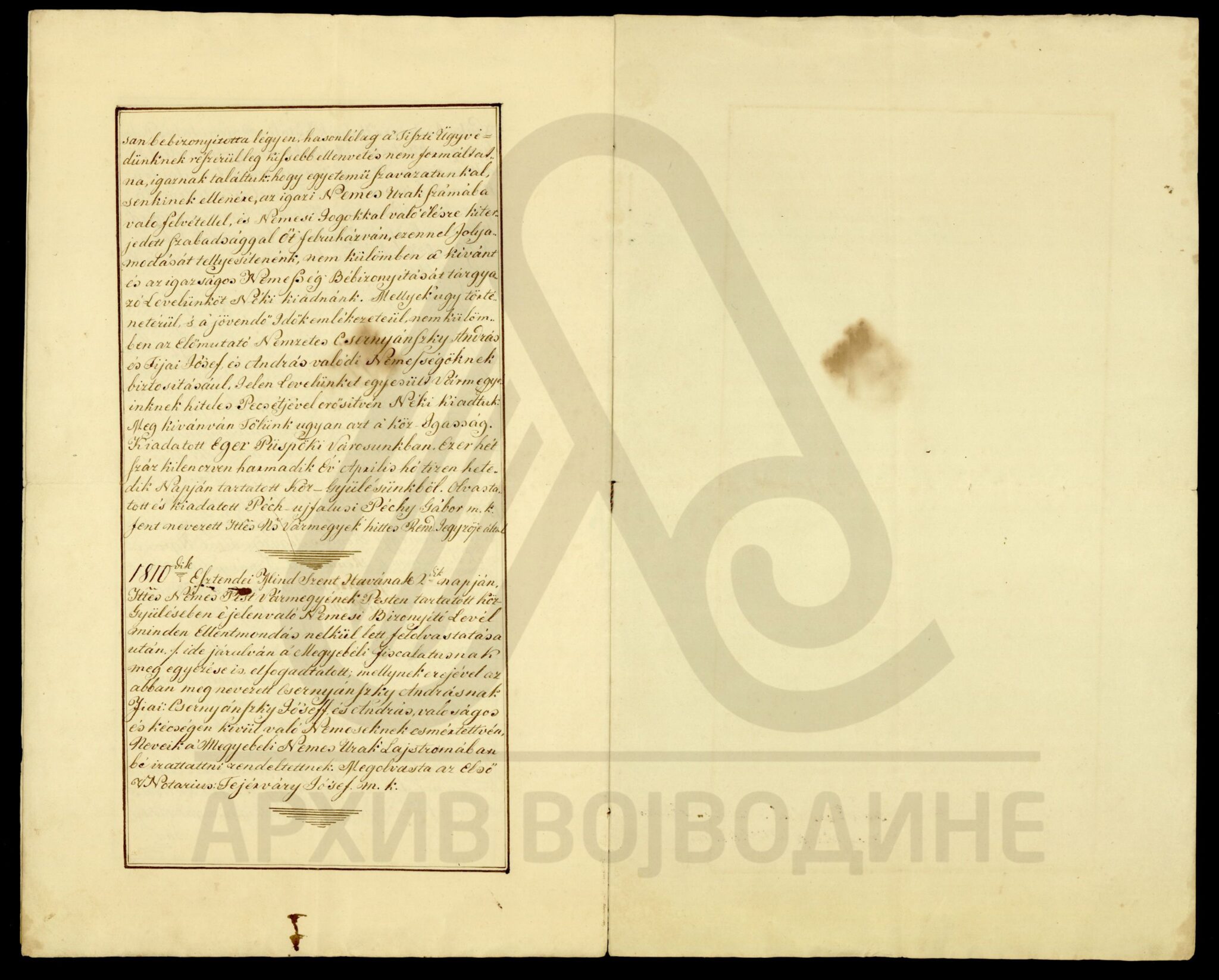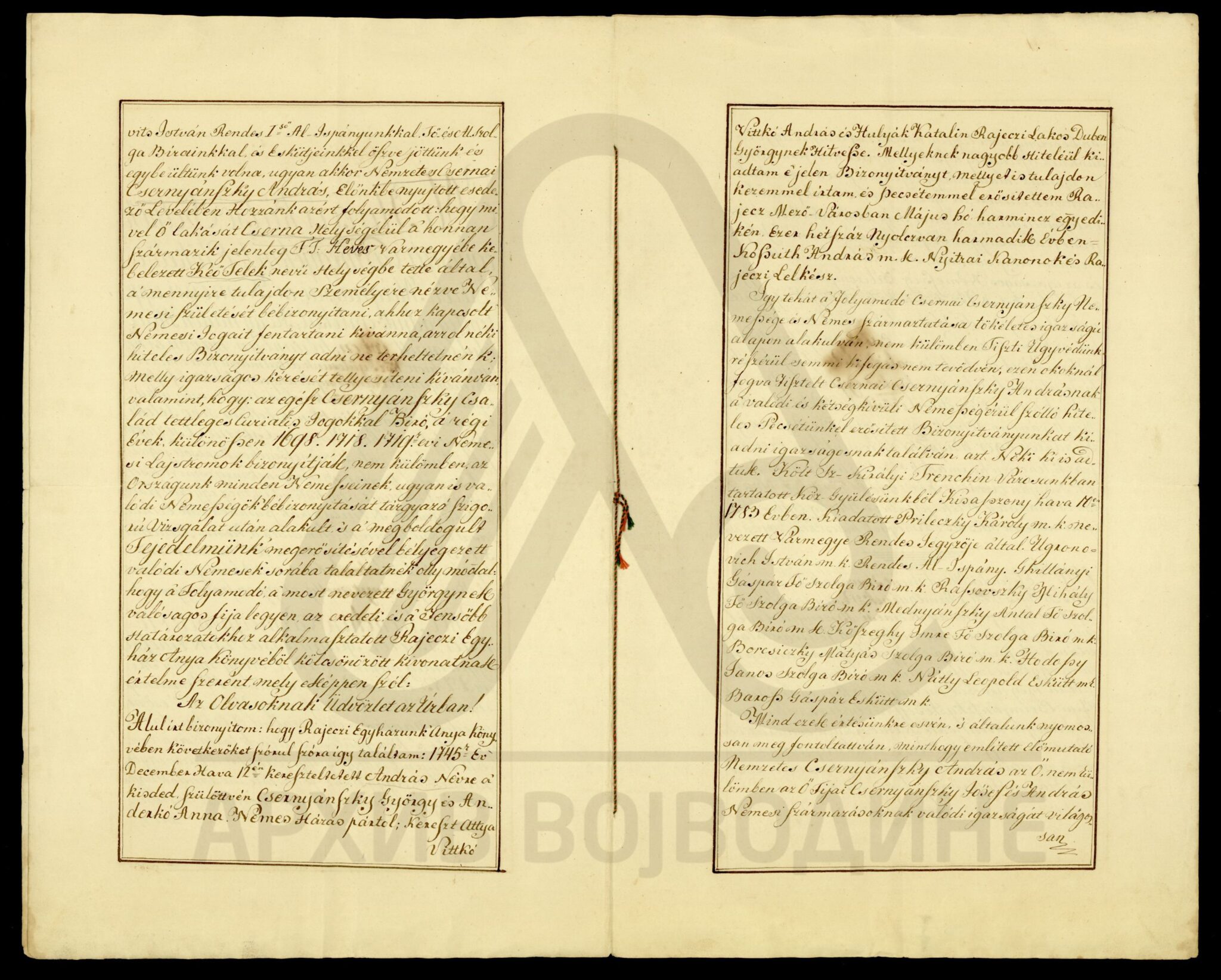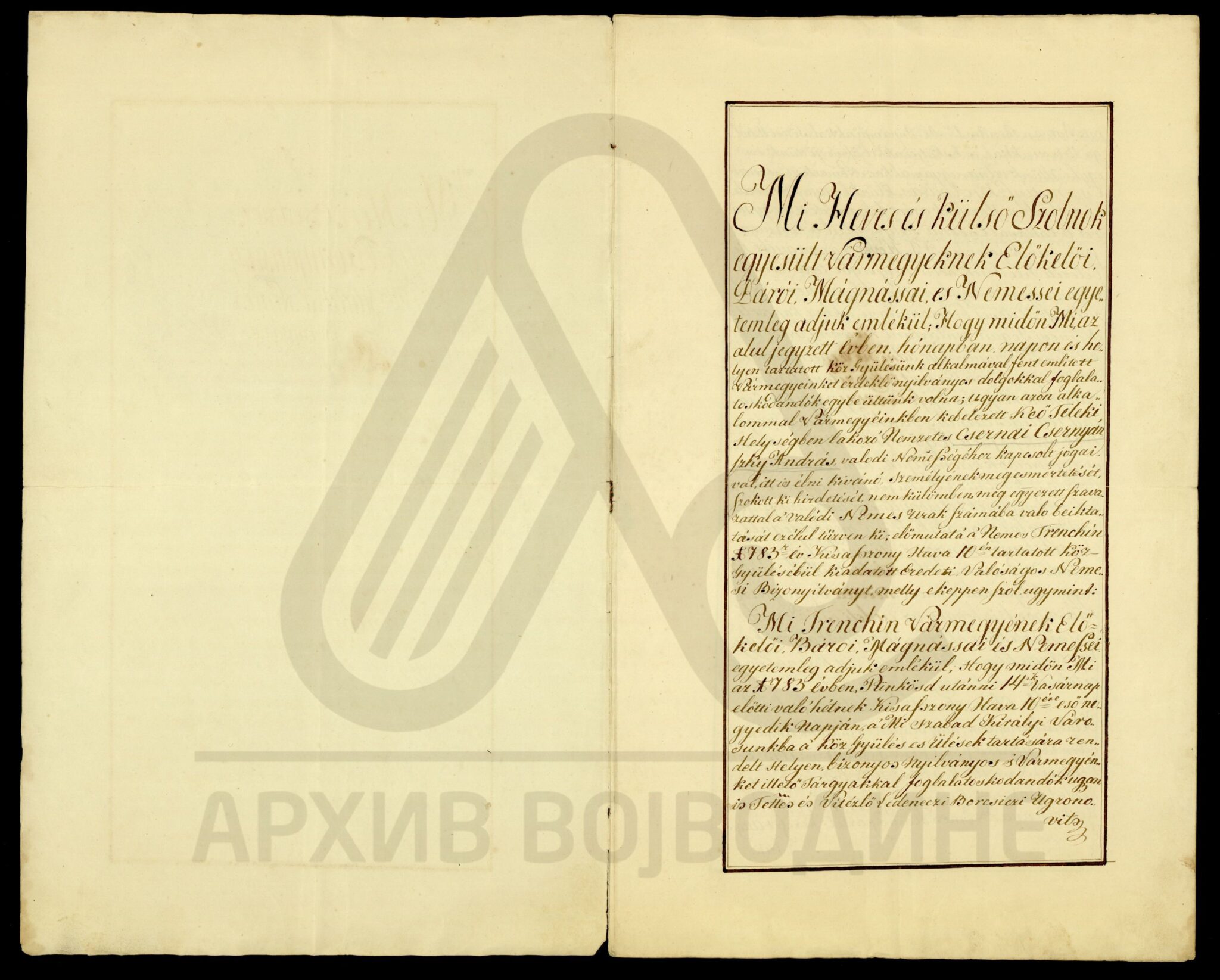 Потврда жупаније Хевеш и Килше Солнок (Heves és Külsö Szolnok) о даровању племићке титуле, као и свих племићких прва, Андрашу Цернеја Черњанском (Csernai Csernyánszky András) на основу повеље жупаније Тренчин издате 10. августа 1783. године.