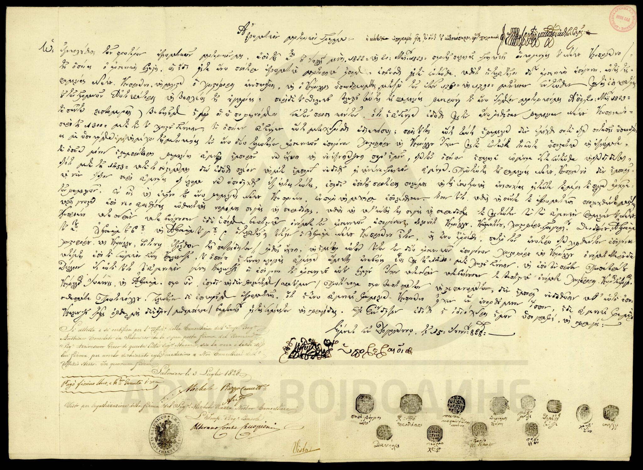 Пергамент, грчки, италијански језик, 2 листа, рукопис, очуван, печати различитих канцеларија и печатњаци и потписи канцелара и писара. Потврда аутентичности својеручног потписа и функције Микелеа Пиаца (Michelle Piazza), канцелара Аустријске канцеларије у Солуну, којом се потврђује именовање аустријског канцелара од стране архиепископа грчког и града Солуна, Макариа.