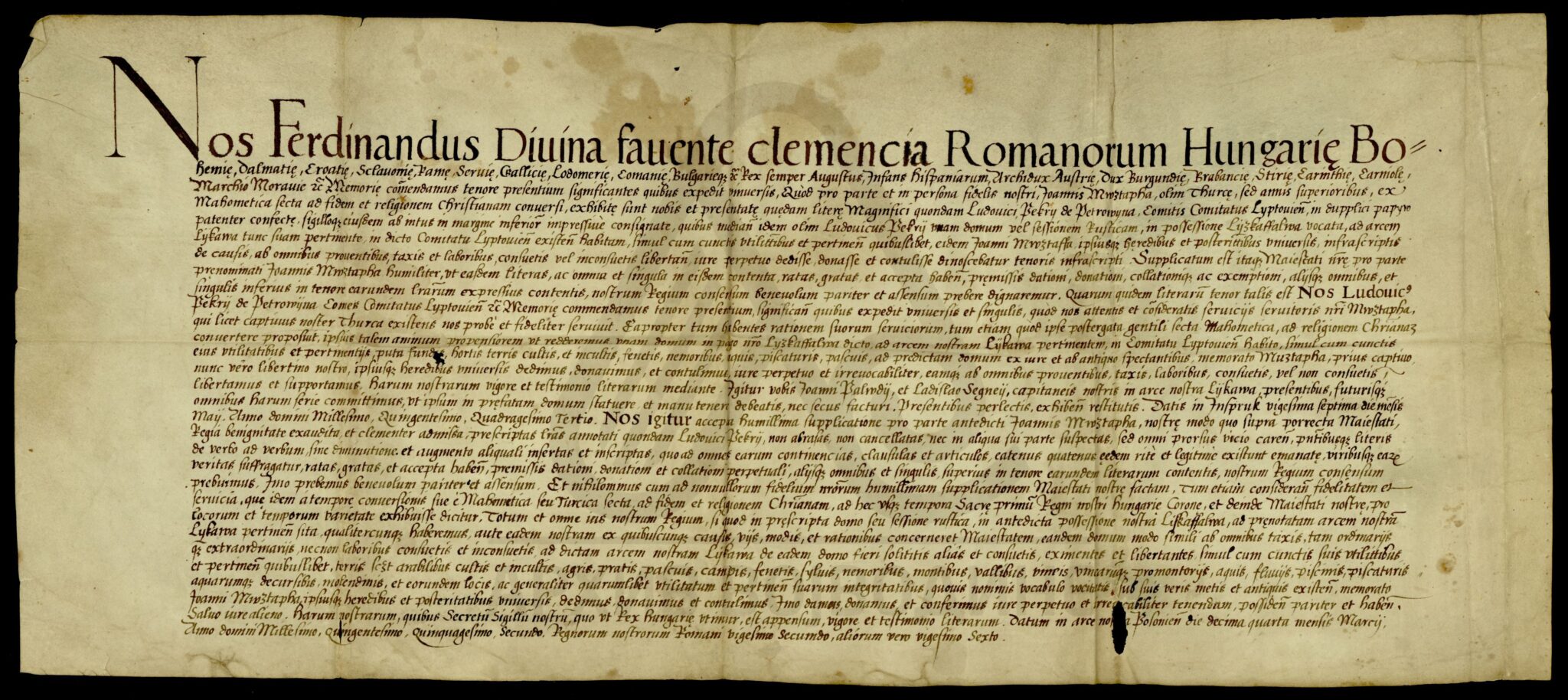 Препис сведочанства Фердинанда I од 14. марта 1552. године датиране у Пожуну, којом се потврђује даровница жупана жупаније Липто, Лудвига Пекри де Петровине од 27. маја 1543. године, о даровању поседа Јовану Мустафи (Mwztapha) у месту Лискафалва (Lÿzkaffalwa) на територији наведене Жупаније.