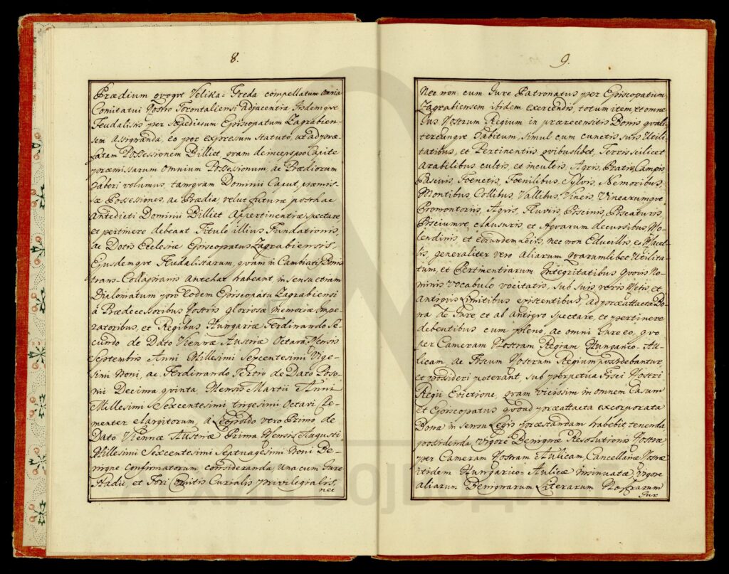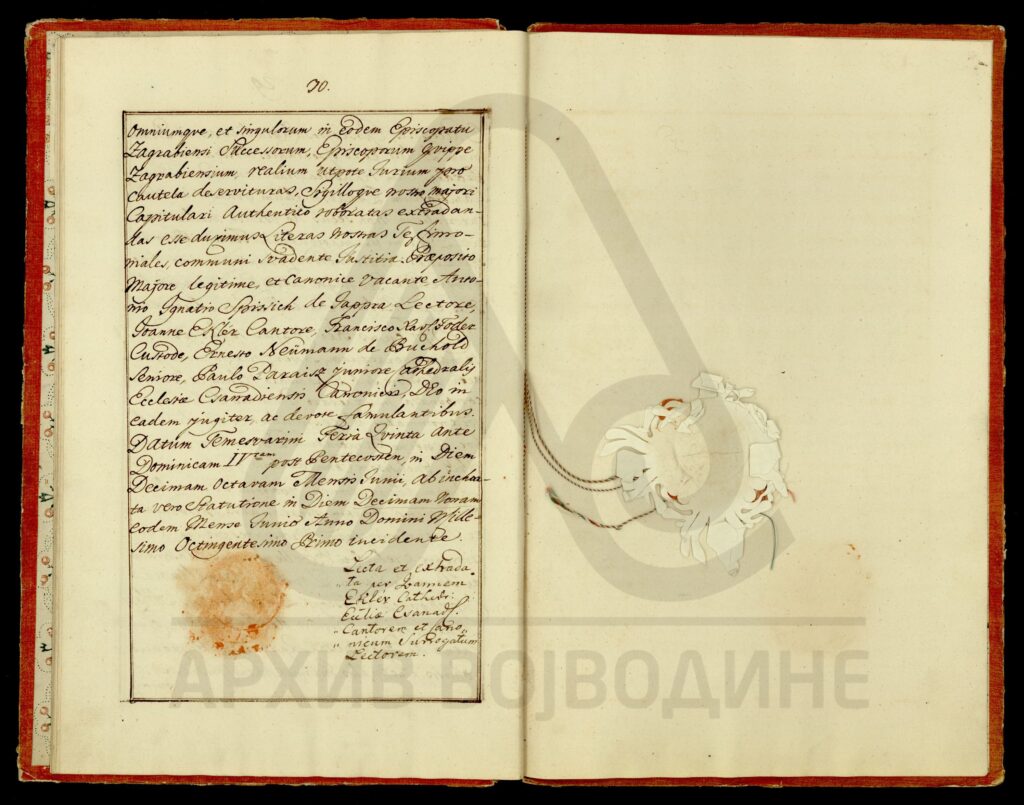 Хартија, пергамент, латински језик, 9 листова, рукопис (облик књиге меког повеза, недостаје предња корица), очувана, печат службеника.