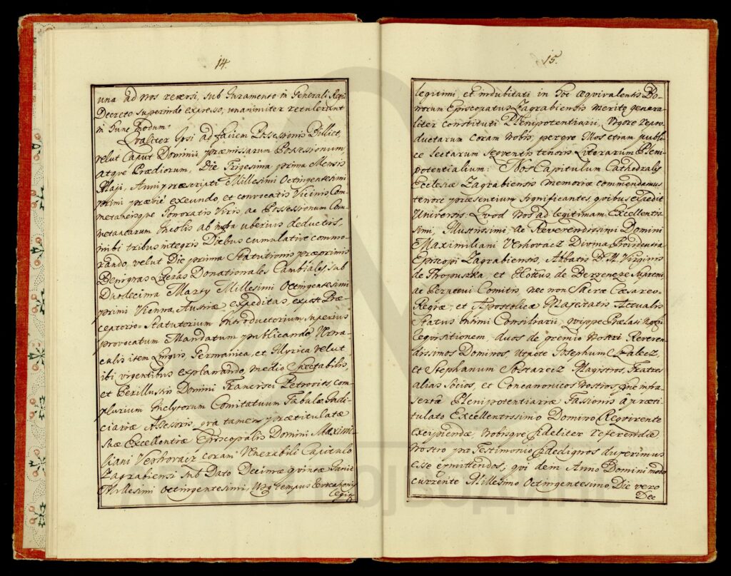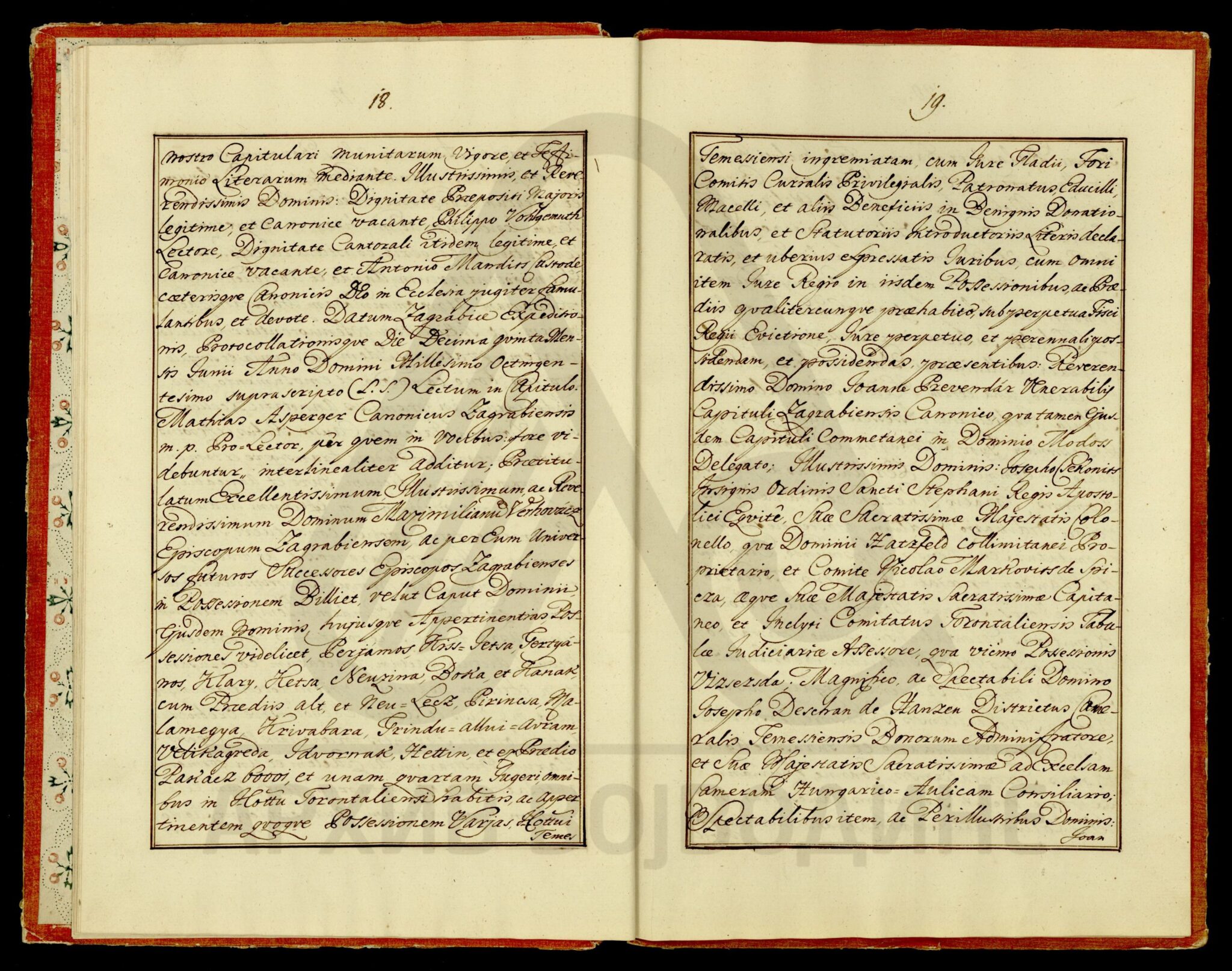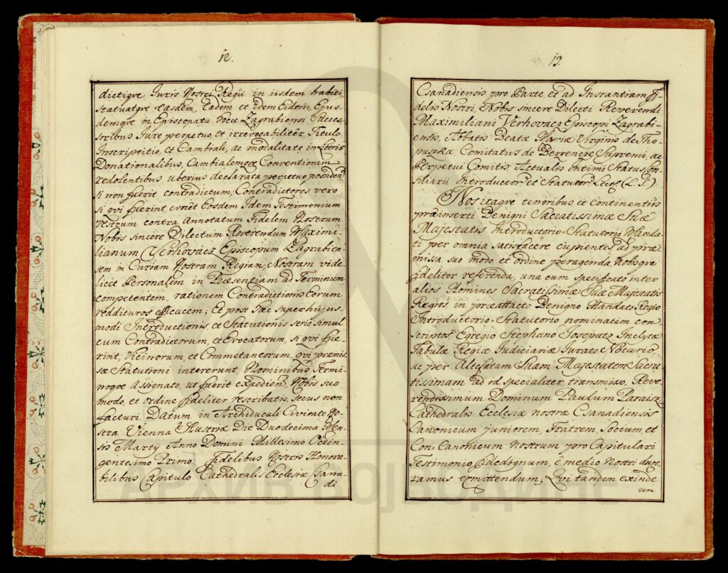 Хартија, латински језик, 19 листова, рукопис (облик књиге тврдог повеза), очувана, папирни печат (оштећен). Објава Чанадског каптола која садржи раније наредбе, и друга акта, о даровању поседа (места), на територији Торонталске и Тамишке жупаније, Загребачком епископату.