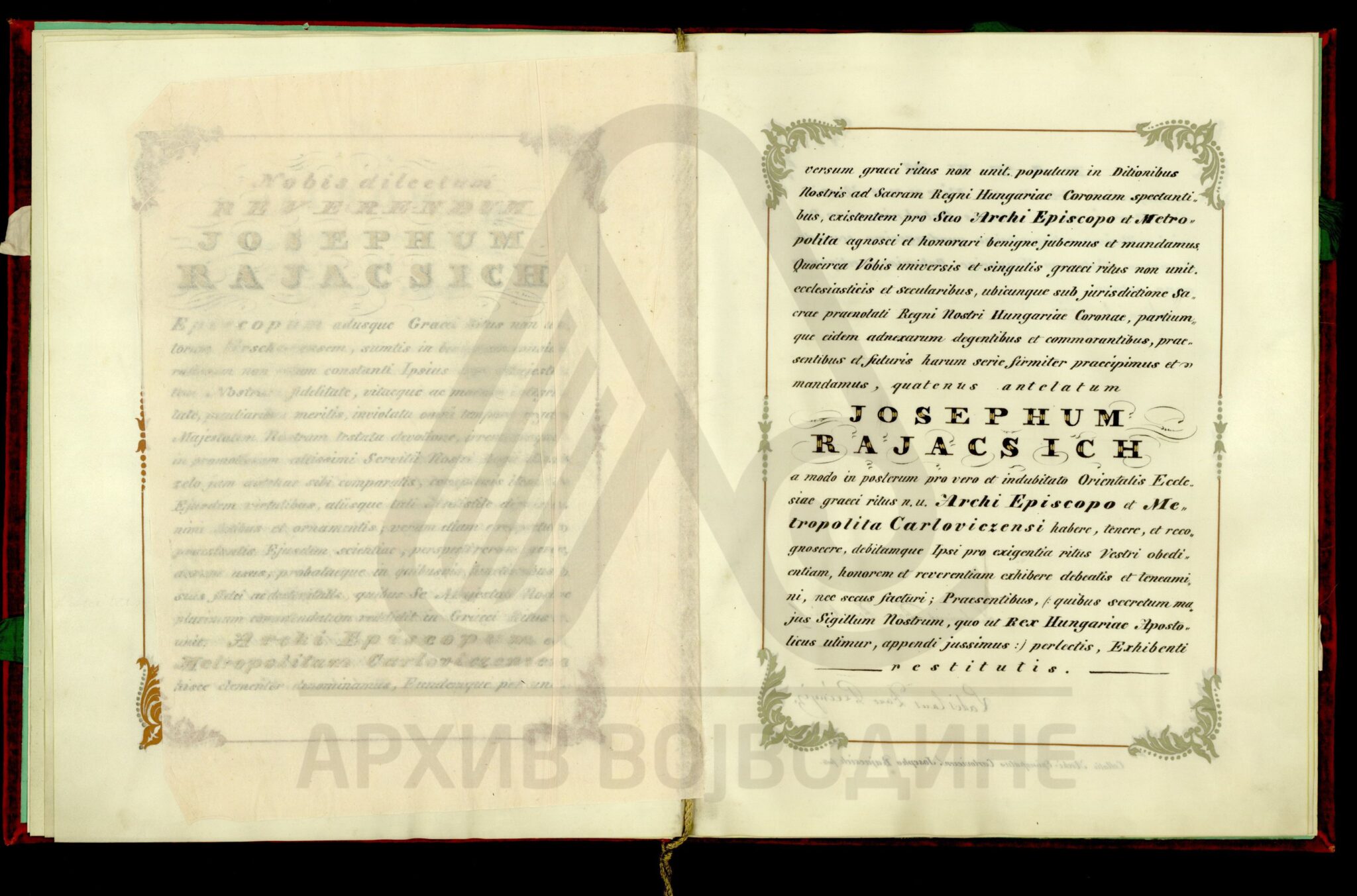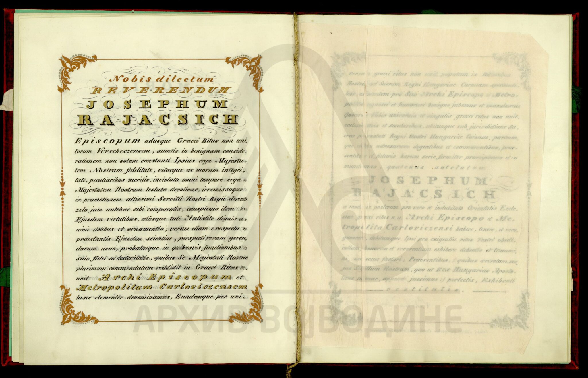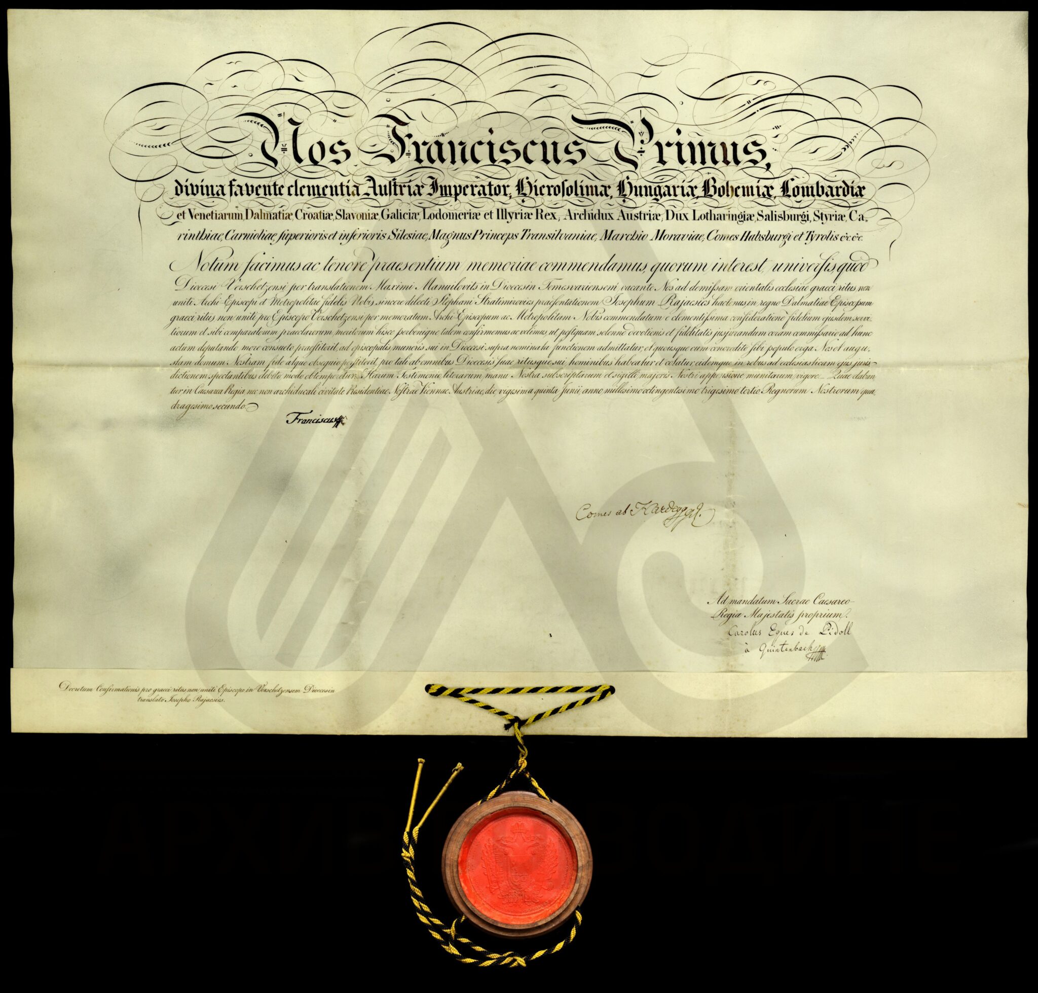 Резолуција цара Франца I о постављењу далматинског епископа Јосифа Рајачића за вршачког епископа, на место Максима Манујловића (Manuilovits) који је премештен у Темишварску епархију.