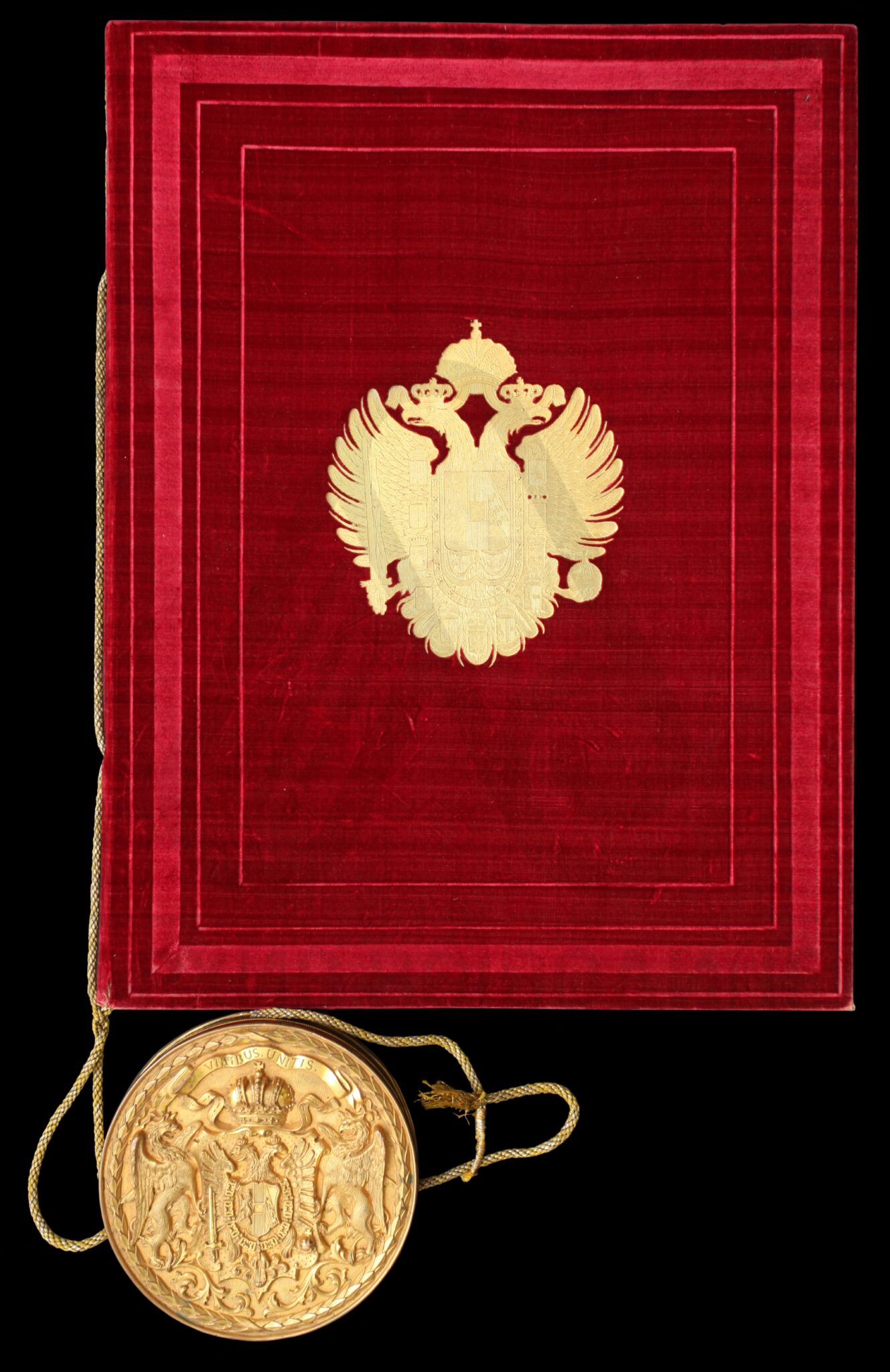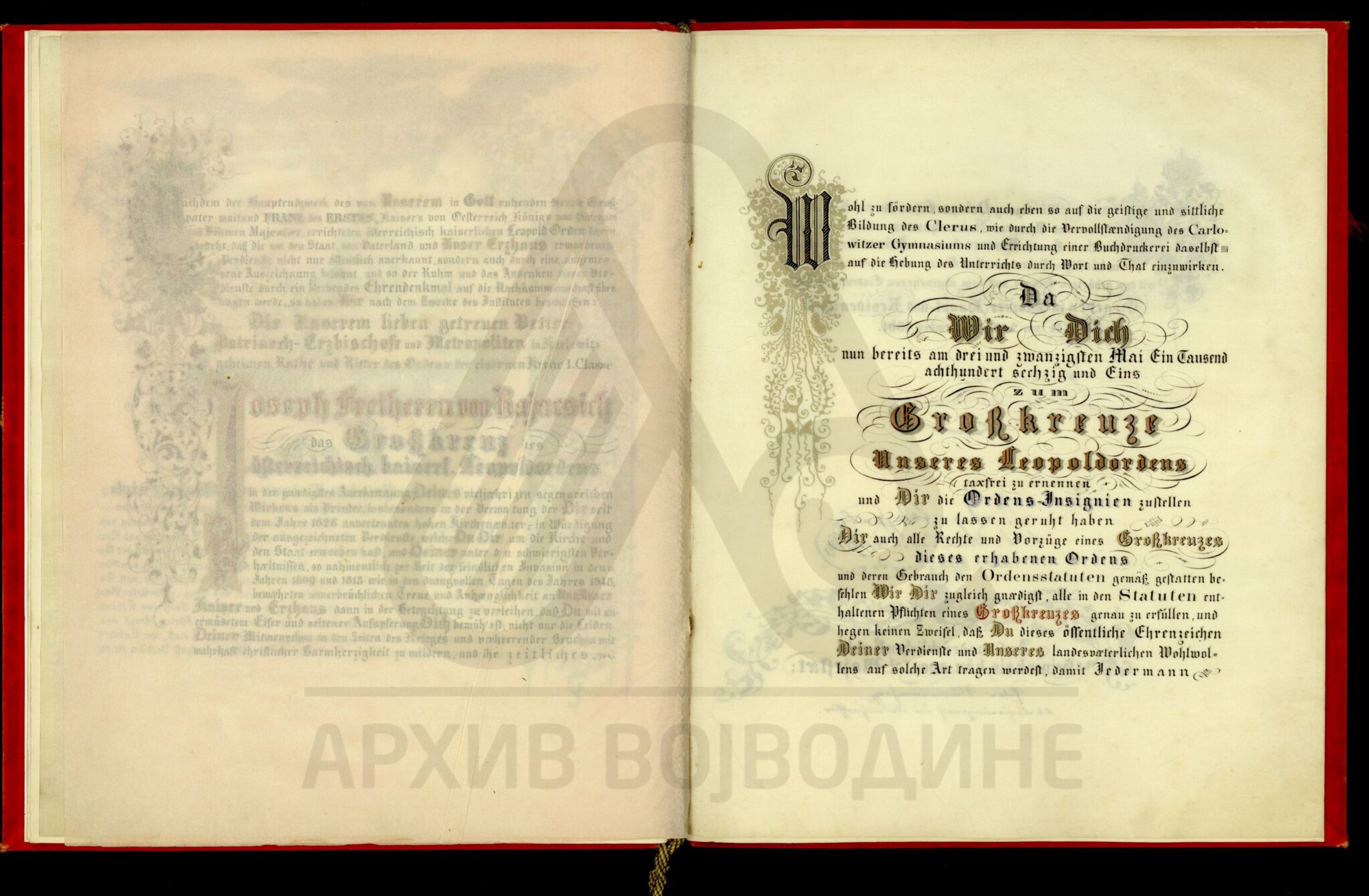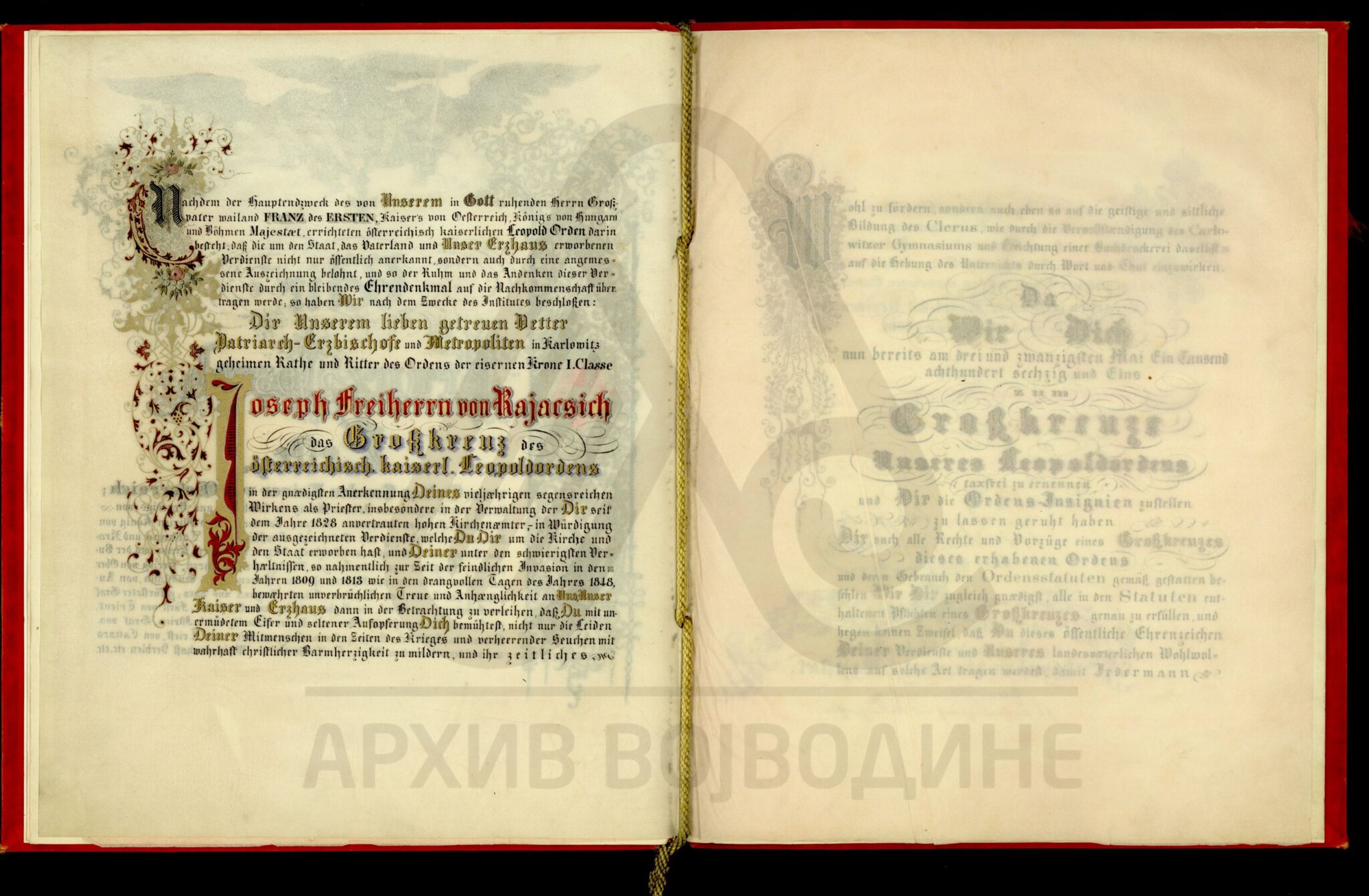 Пергамент, немачки језик, 6 листова, штампано (облик књиге тврдог повеза), очувана воштани печат у металној кутији. Декрет аустријског цара Франца Јозефа I о одликовању српског патријарха Јосифа Рајачића, Орденом Леополдовог Великог крста.