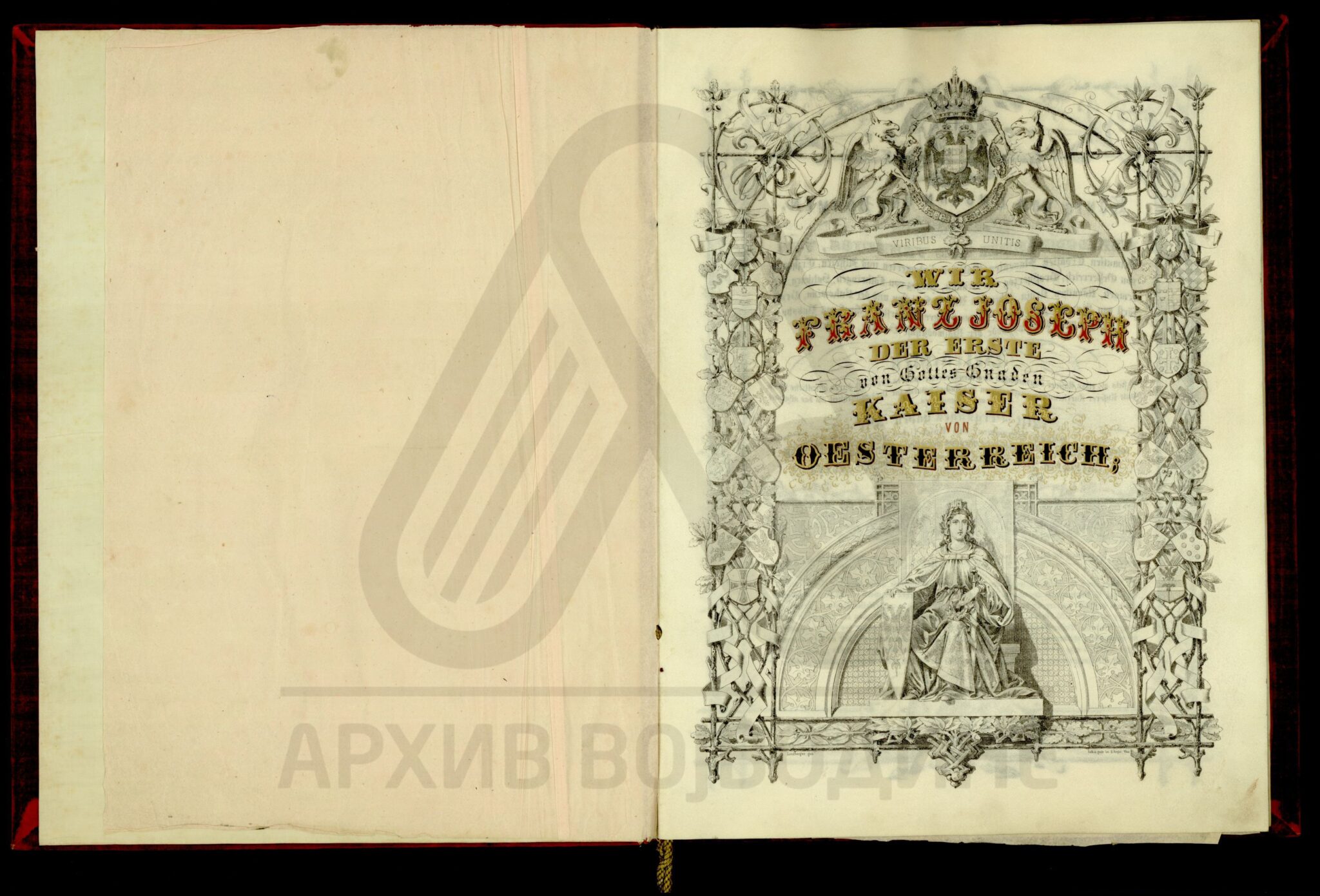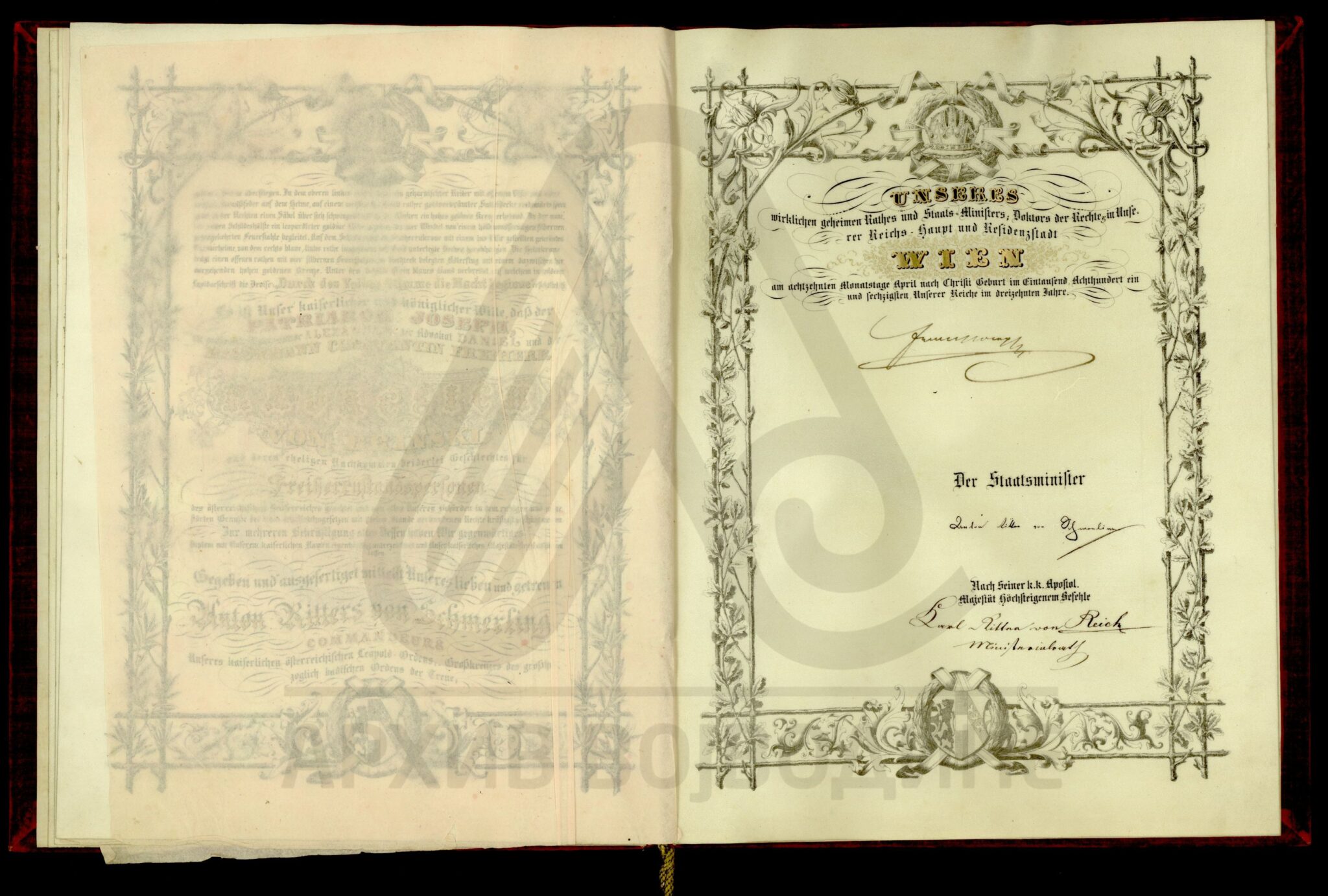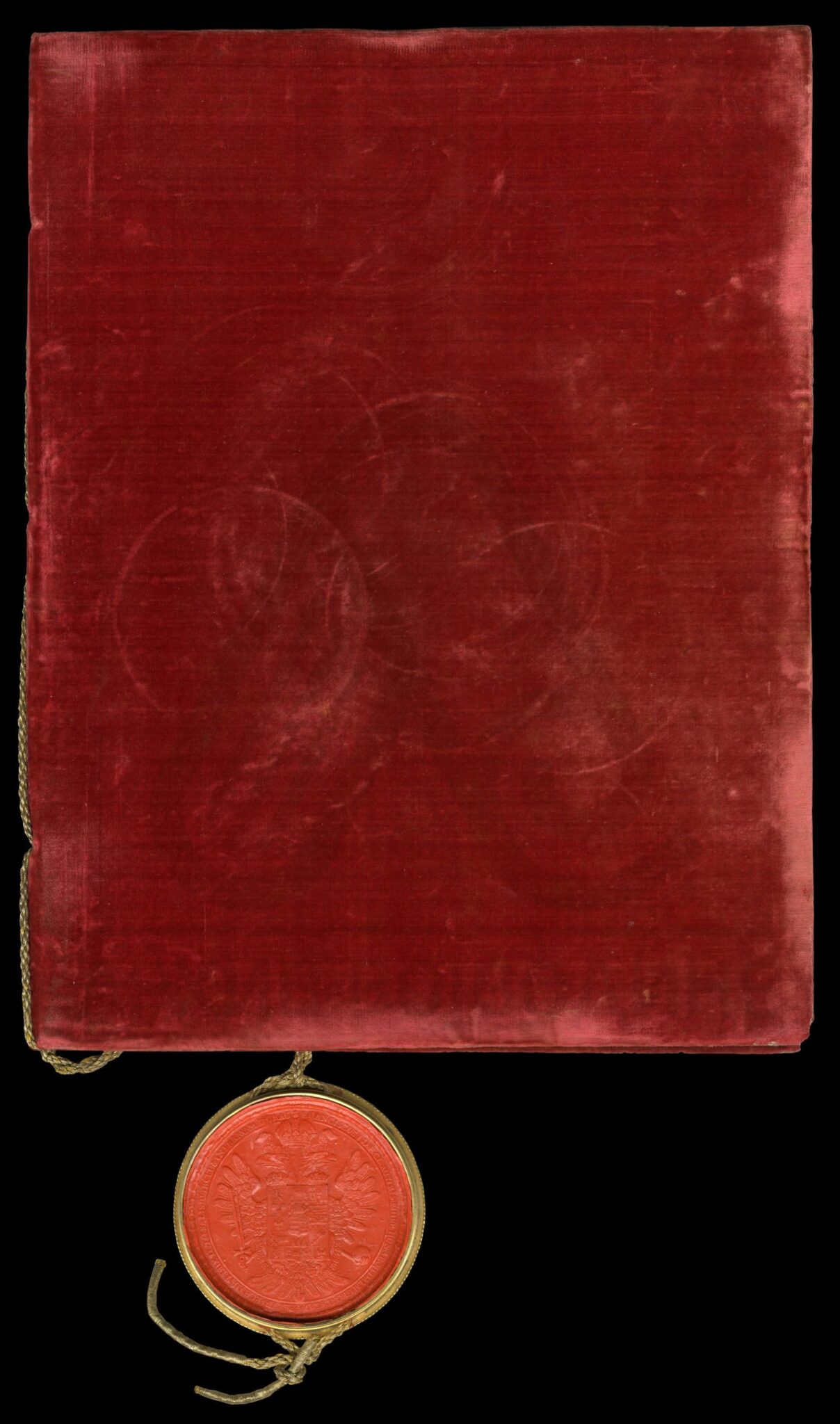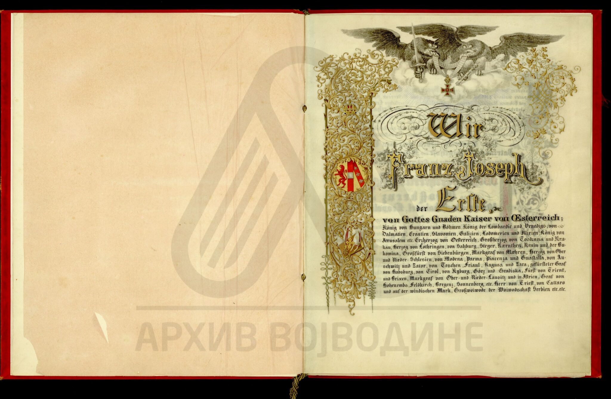 Пергамент, немачки језик, 6 листова, штампано (облик књиге тврдог повеза), очувана воштани печат у металној кутији. Декрет аустријског цара Франца Јозефа I о одликовању српског патријарха Јосифа Рајачића, Орденом Леополдовог Великог крста.