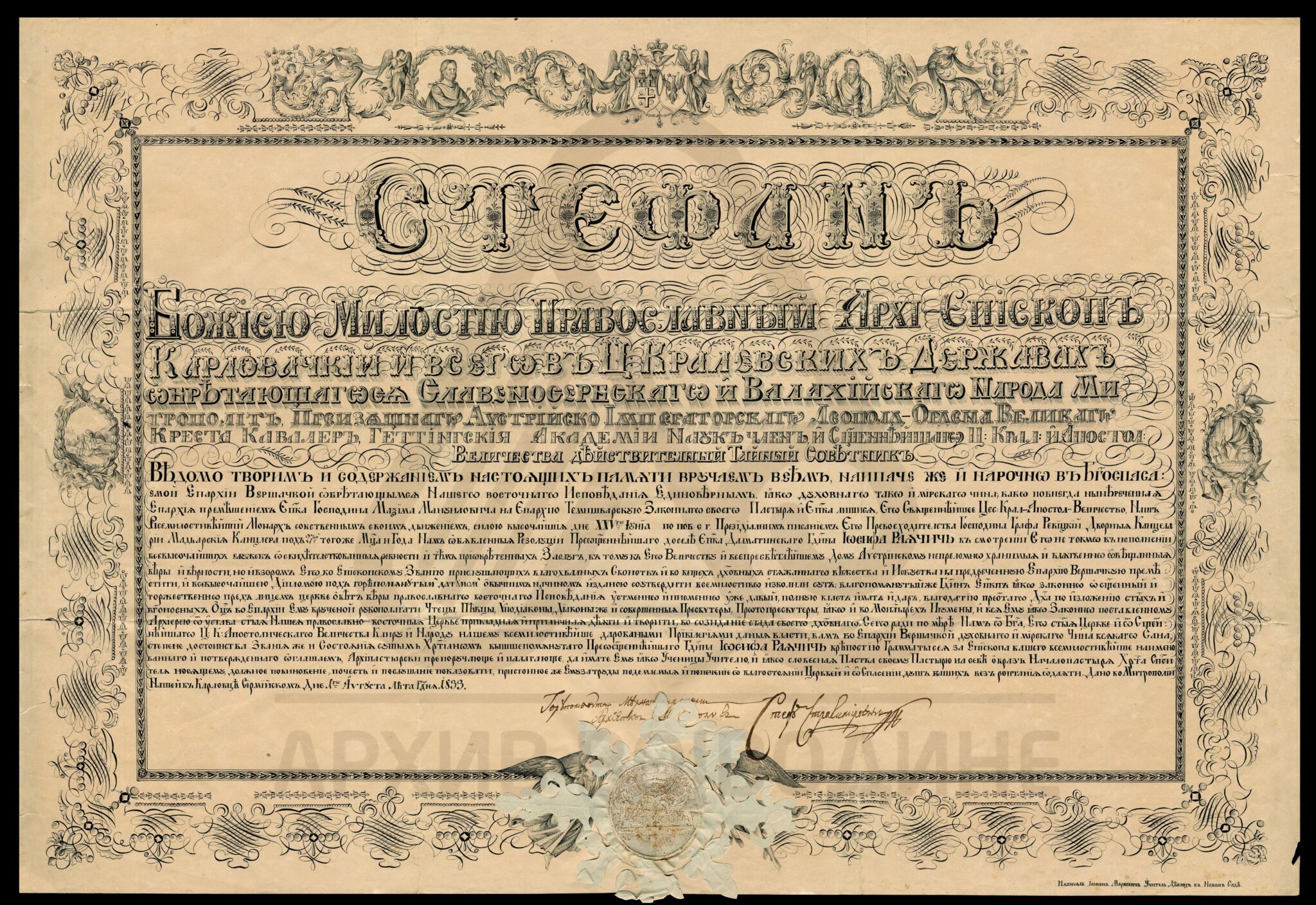 Декрет карловачког архиепископа и митрополита Стефана Стратимировића, о именовању далматинског епископа Јосифа Рајачића за епископа вршачког, на основу Царске резолуције од 25. јуна 1833. године.