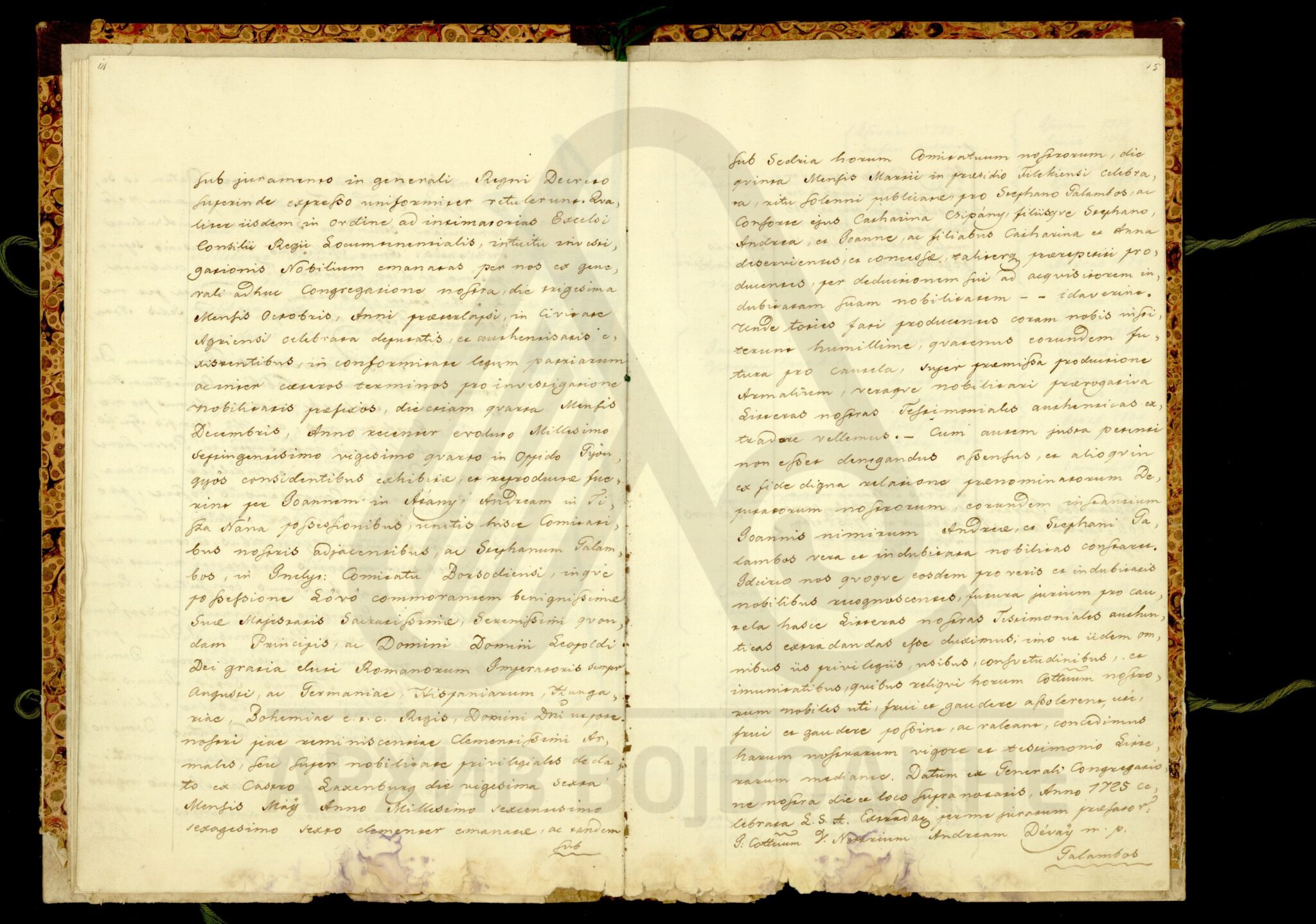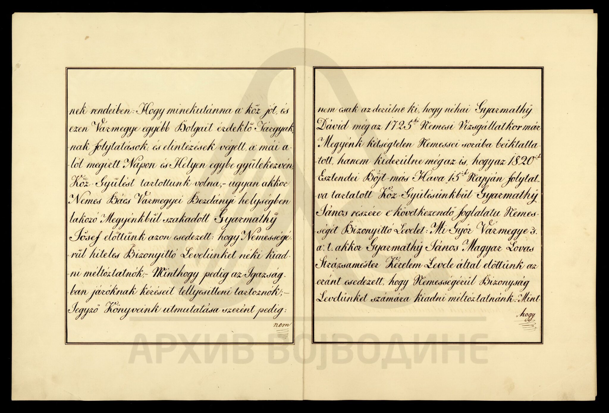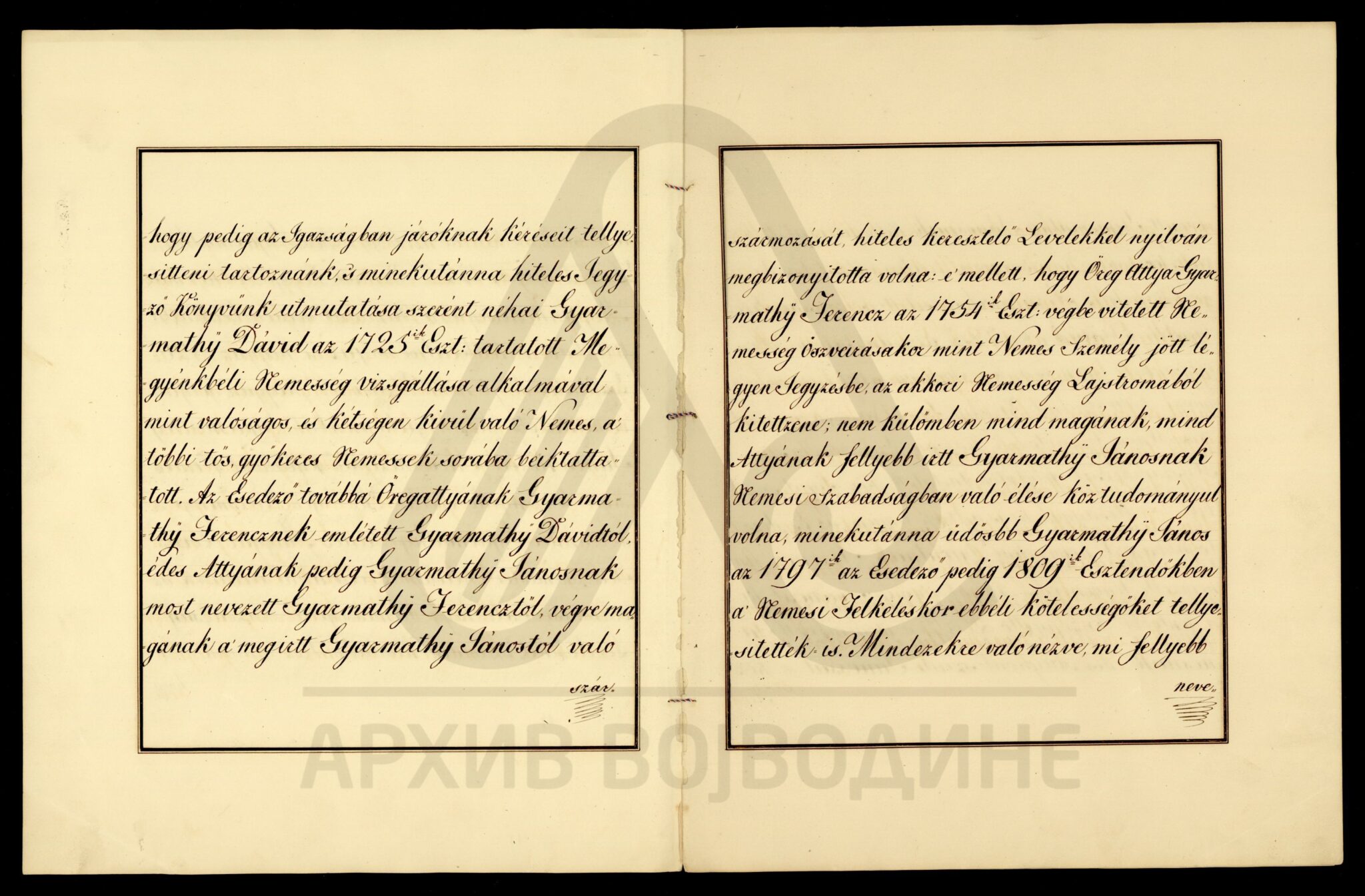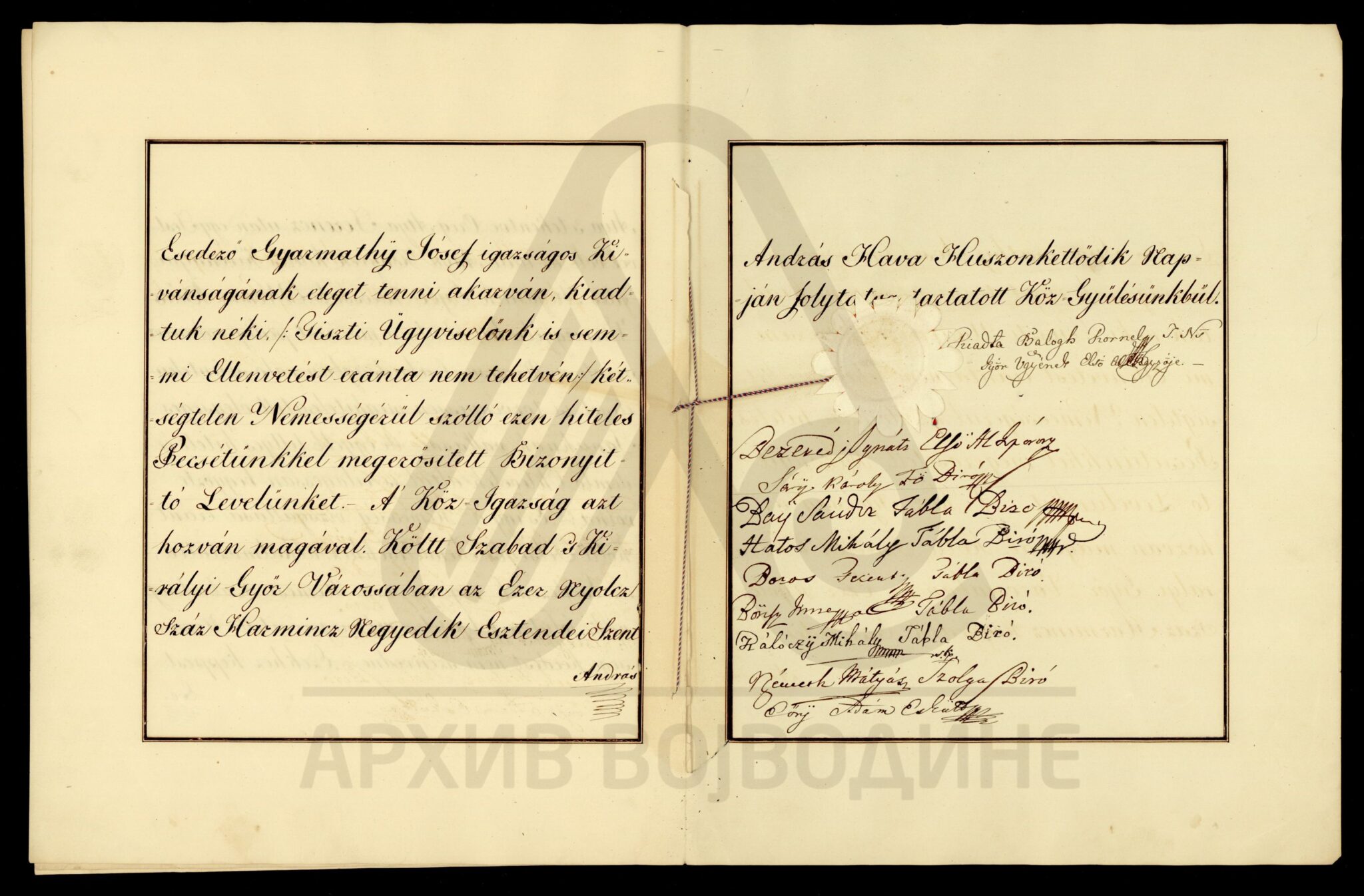 Хартија, мађарски језик, 5 листова, рукопис (форма књиге мек повез, без корица), делимично оштећена, папирни печат. Потврда о племству коју жупанија Ђер издаје Јожефу Ђарматију (Gyarmathÿ), становнику места Бездан на територији Бачке жупаније. У њој се наводи да је предак именованог, Давид Ђармати, још 1725. године био уписан у списак (попис) племића жупаније Ђер.