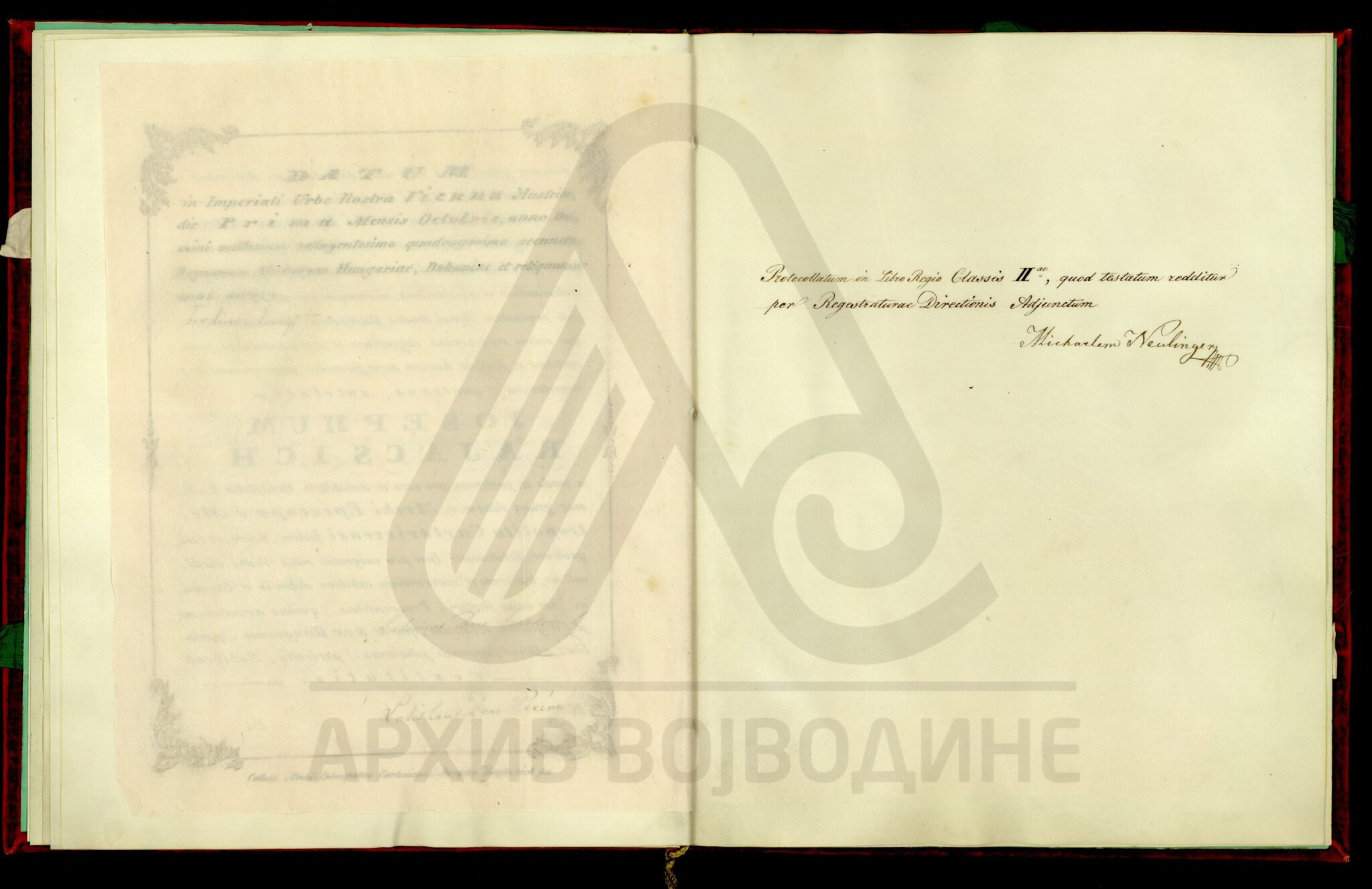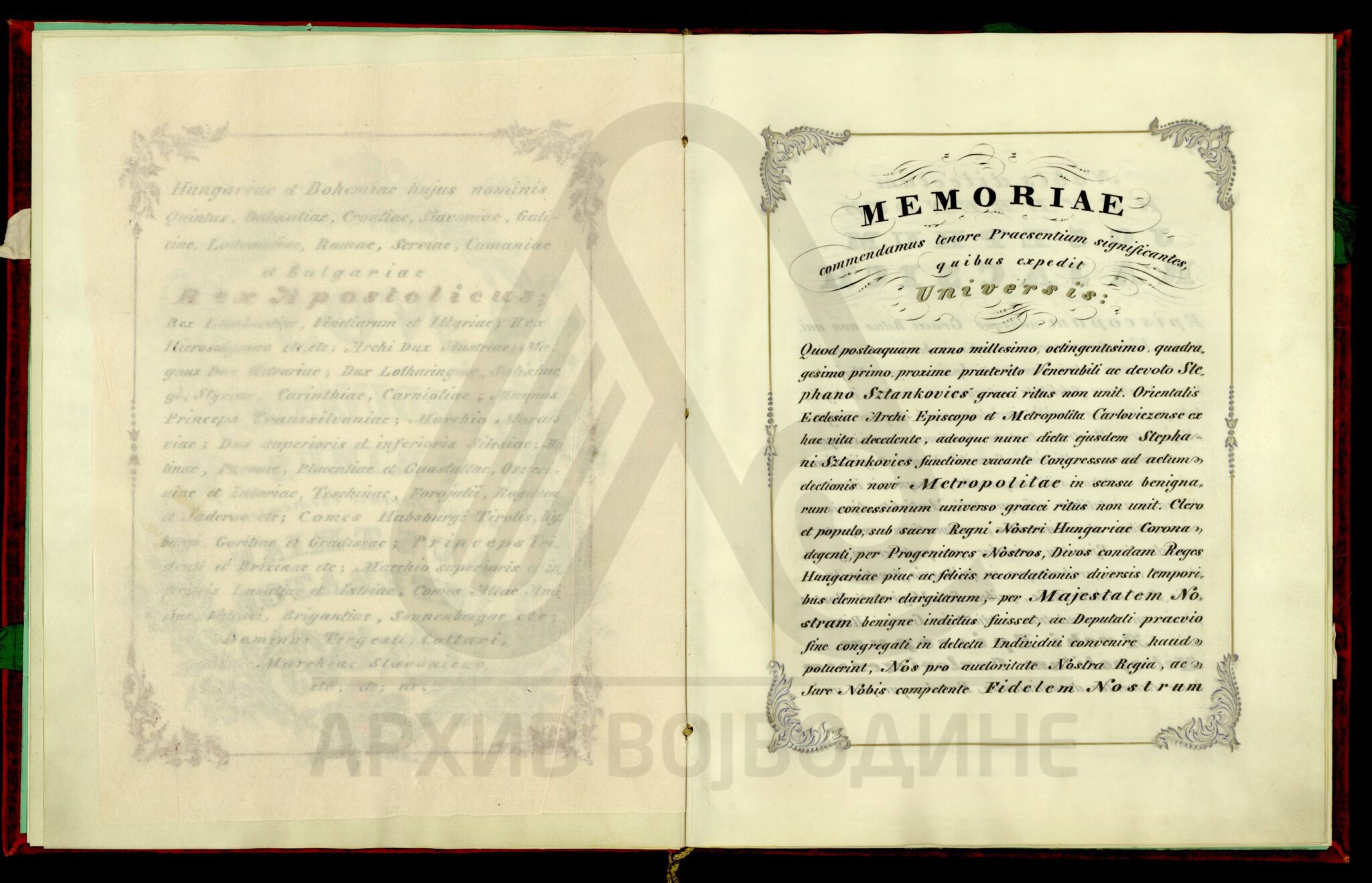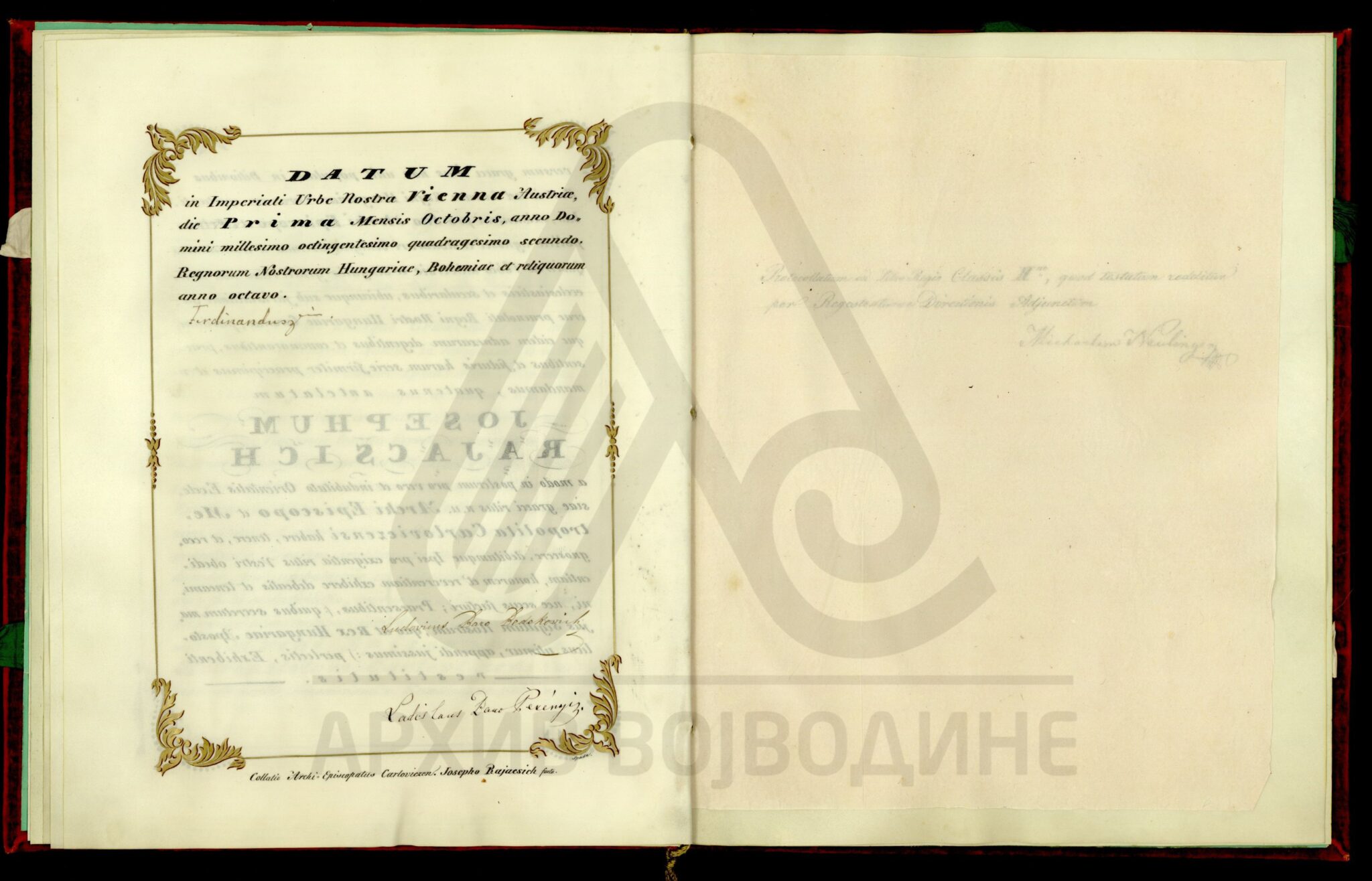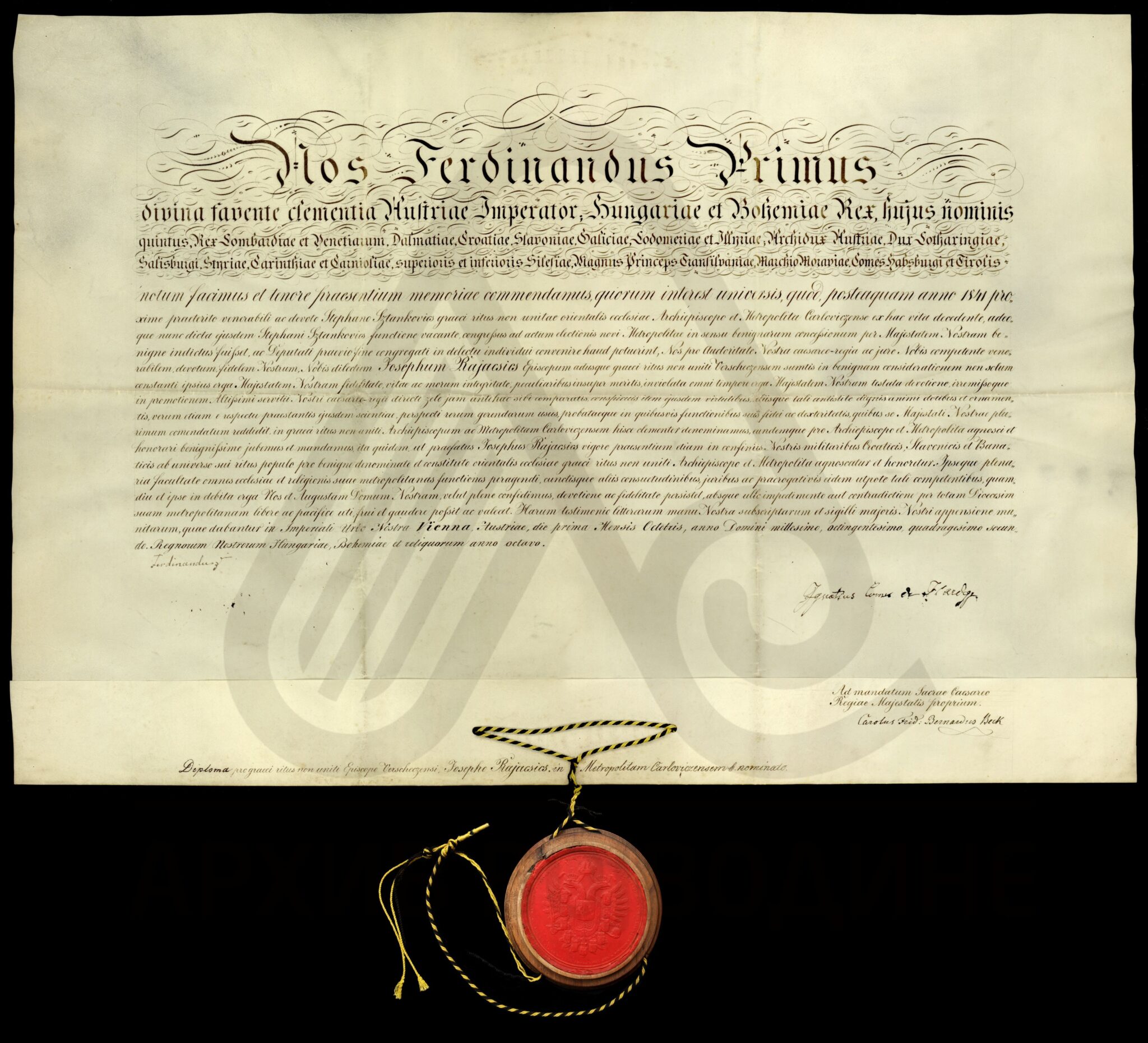 Препис дипломе аустријског цара Фердинанда I, од 1. октобра 1842. године (Беч), о постављењу вршачког епископа Јосифа Рајачића за карловачког архиепископа и митрополита.