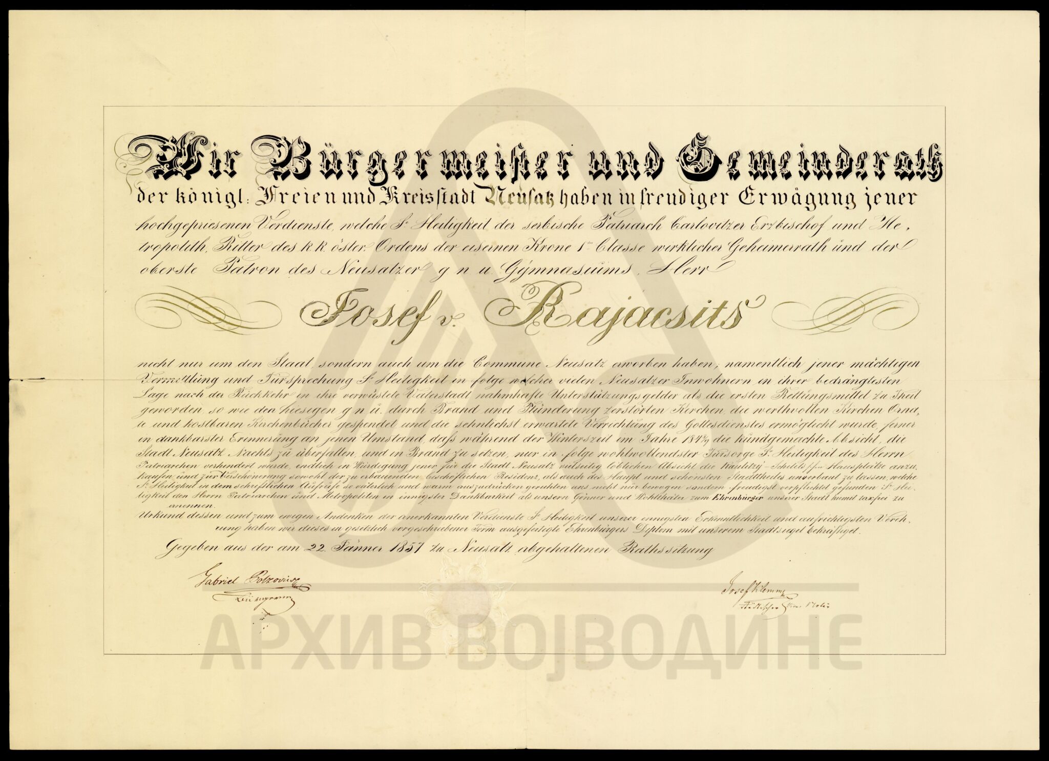 Диплома којом Градско начелство Слободног и краљевског града Новог Сада одликује почасним грађанством српског патријарха Јосифа Рајачића.
