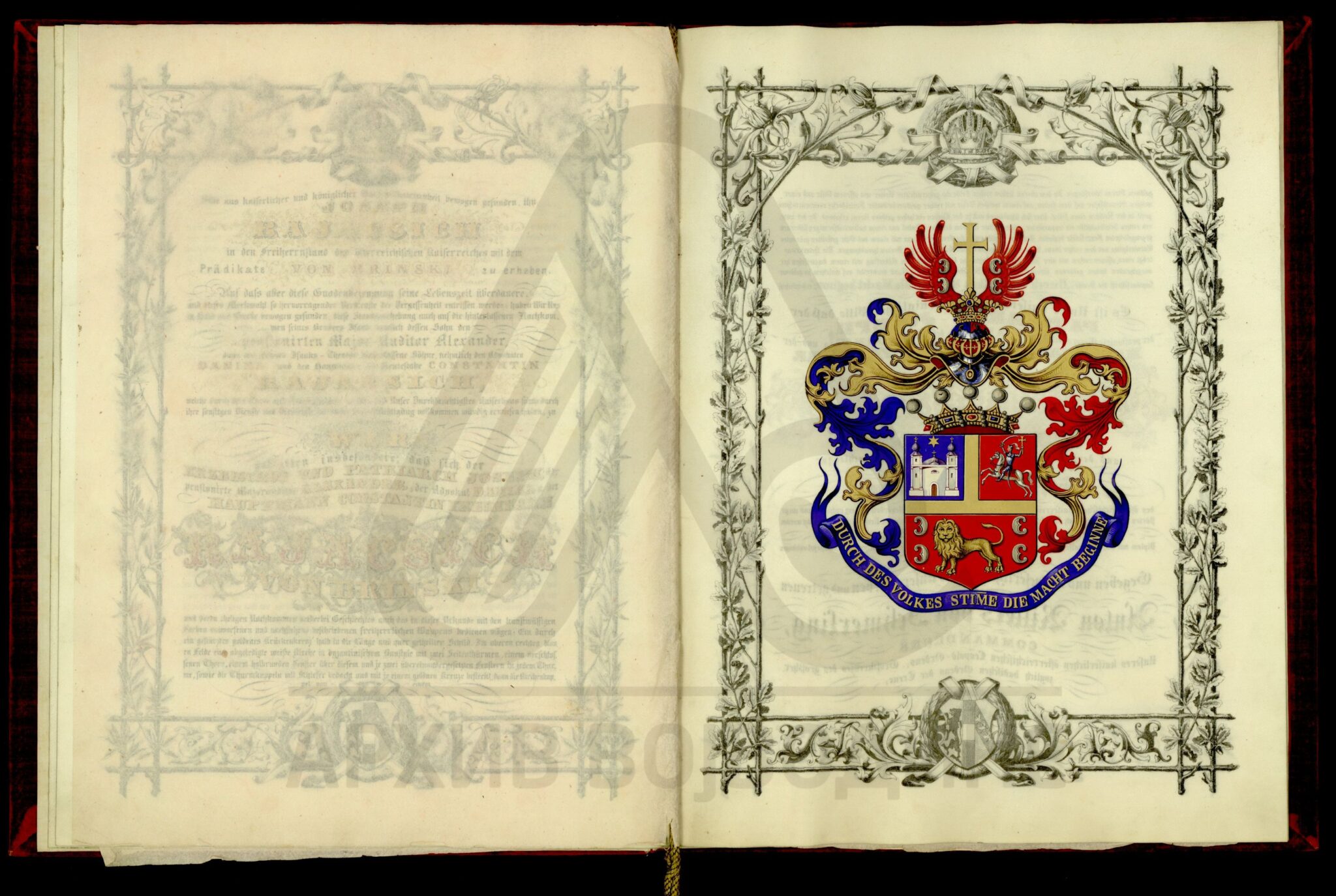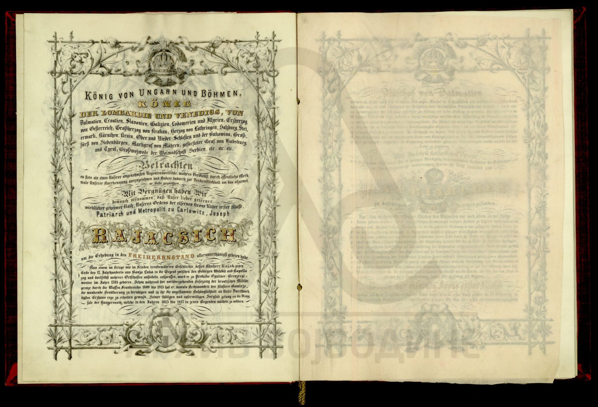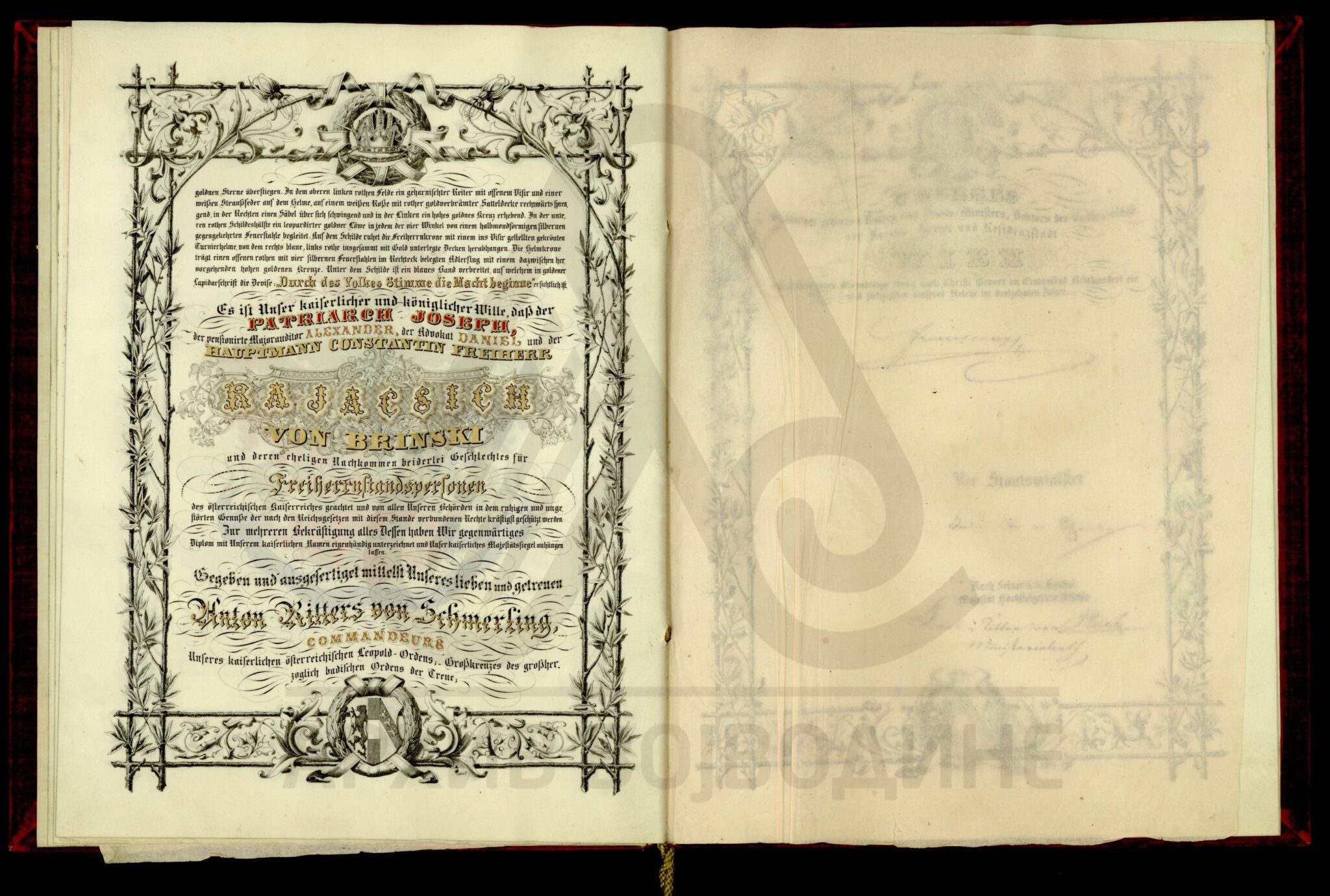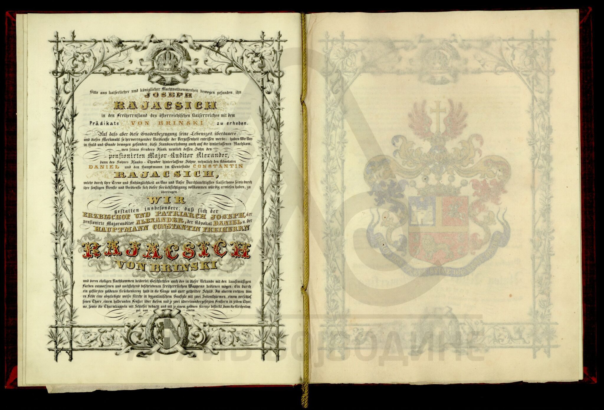 Пергамент, немачки језик, 4 листа, штампано (облик књиге тврдог повеза), очувана, воштани печат у металној кутији. Диплома аустријског цара Франца Јозефа I којом се српски патријарх Јосиф Рајачић одликује баронатом, уз употребу предиката „вон Брински“ (prädikate von Brinski).