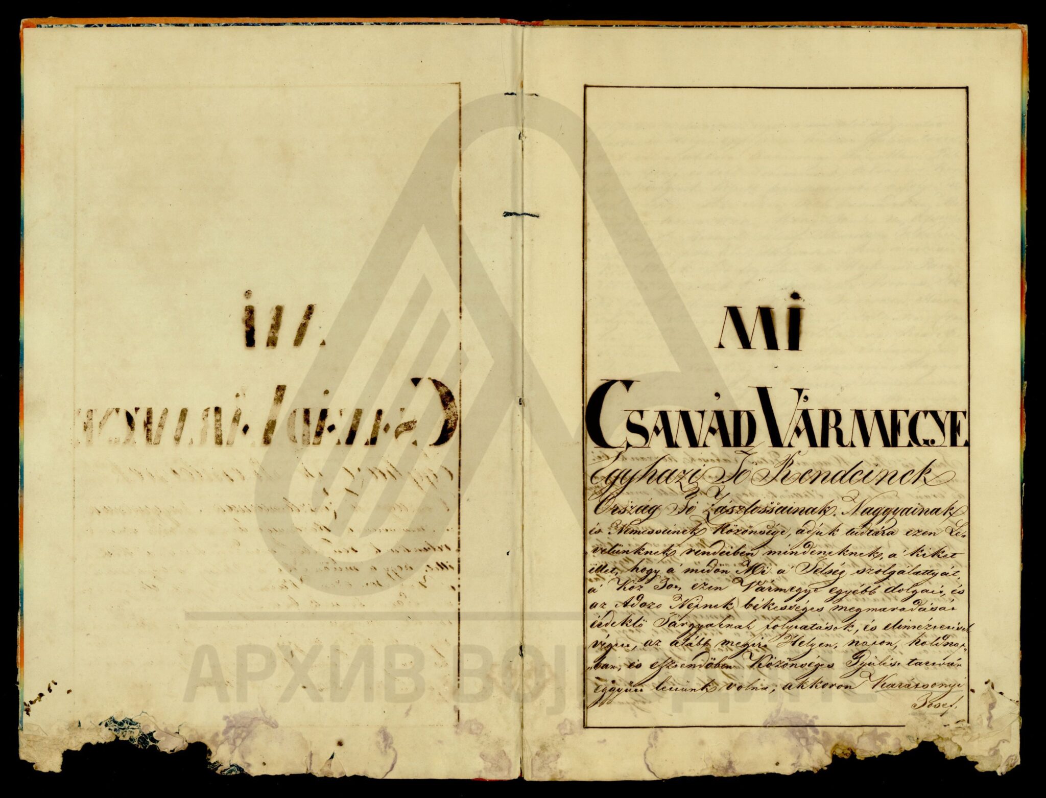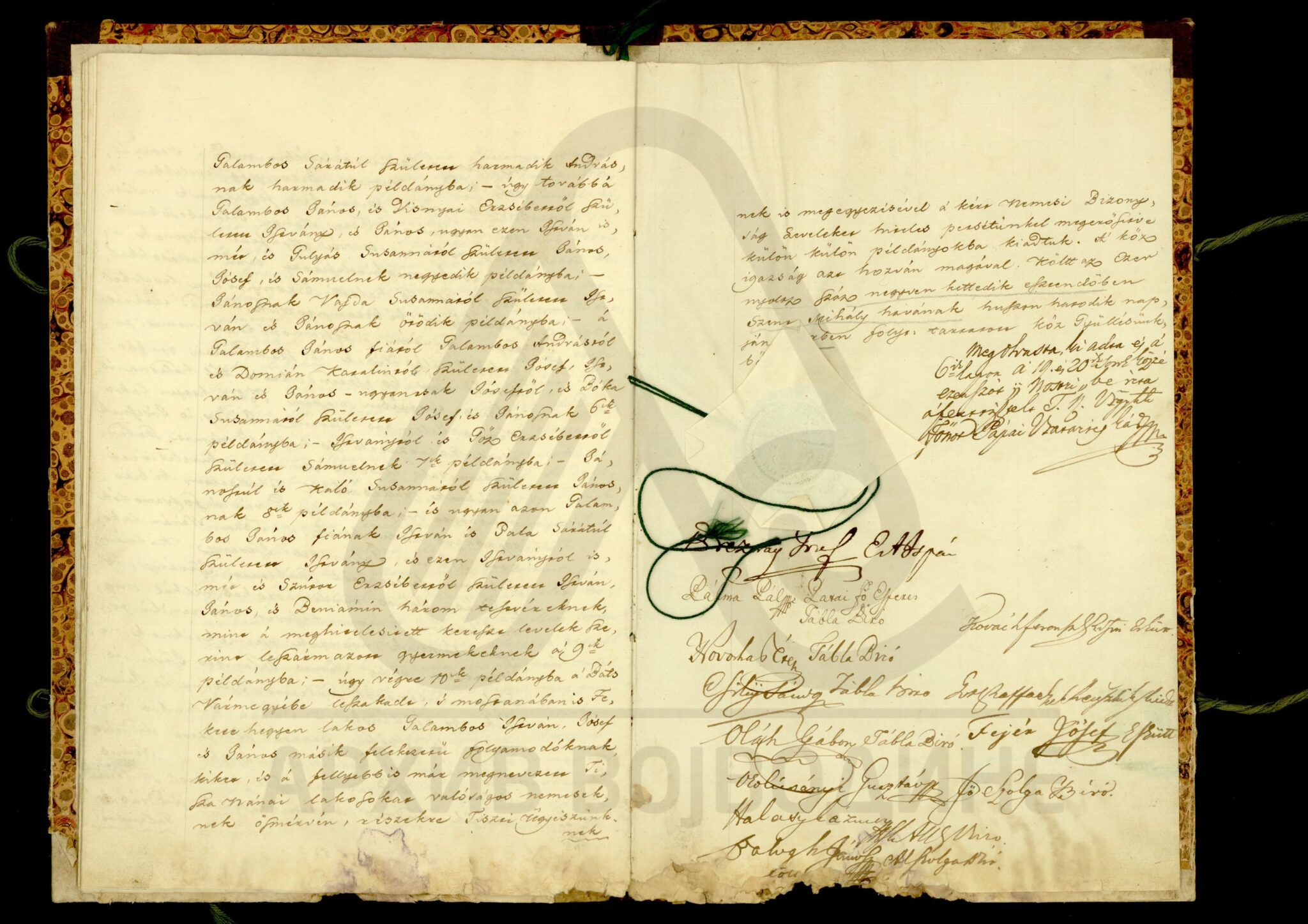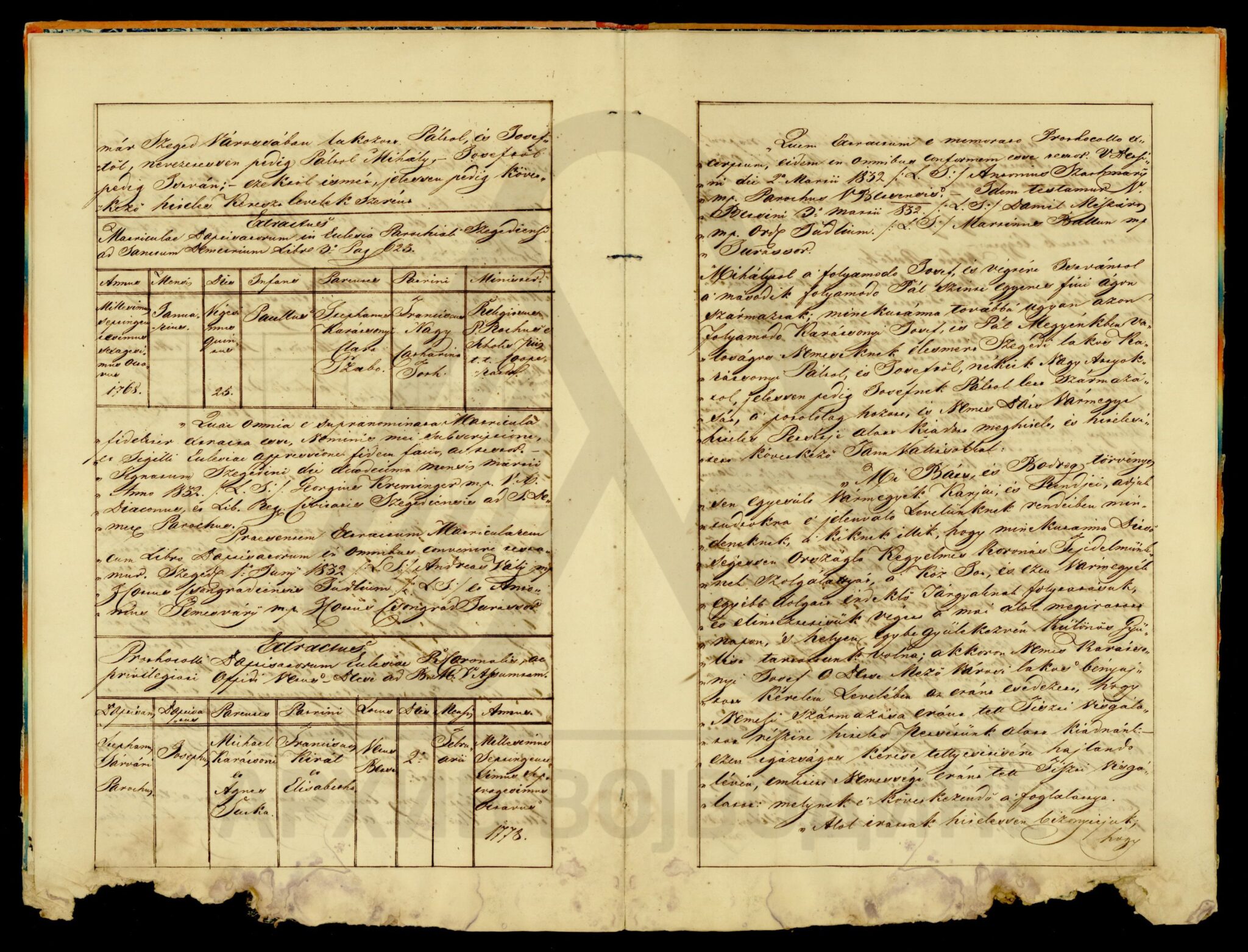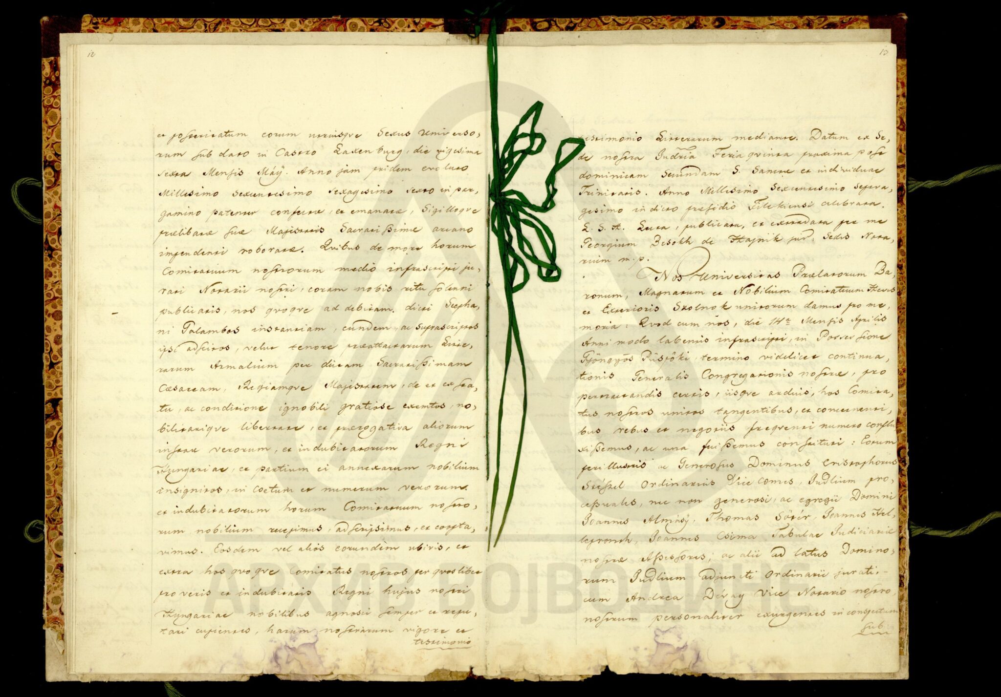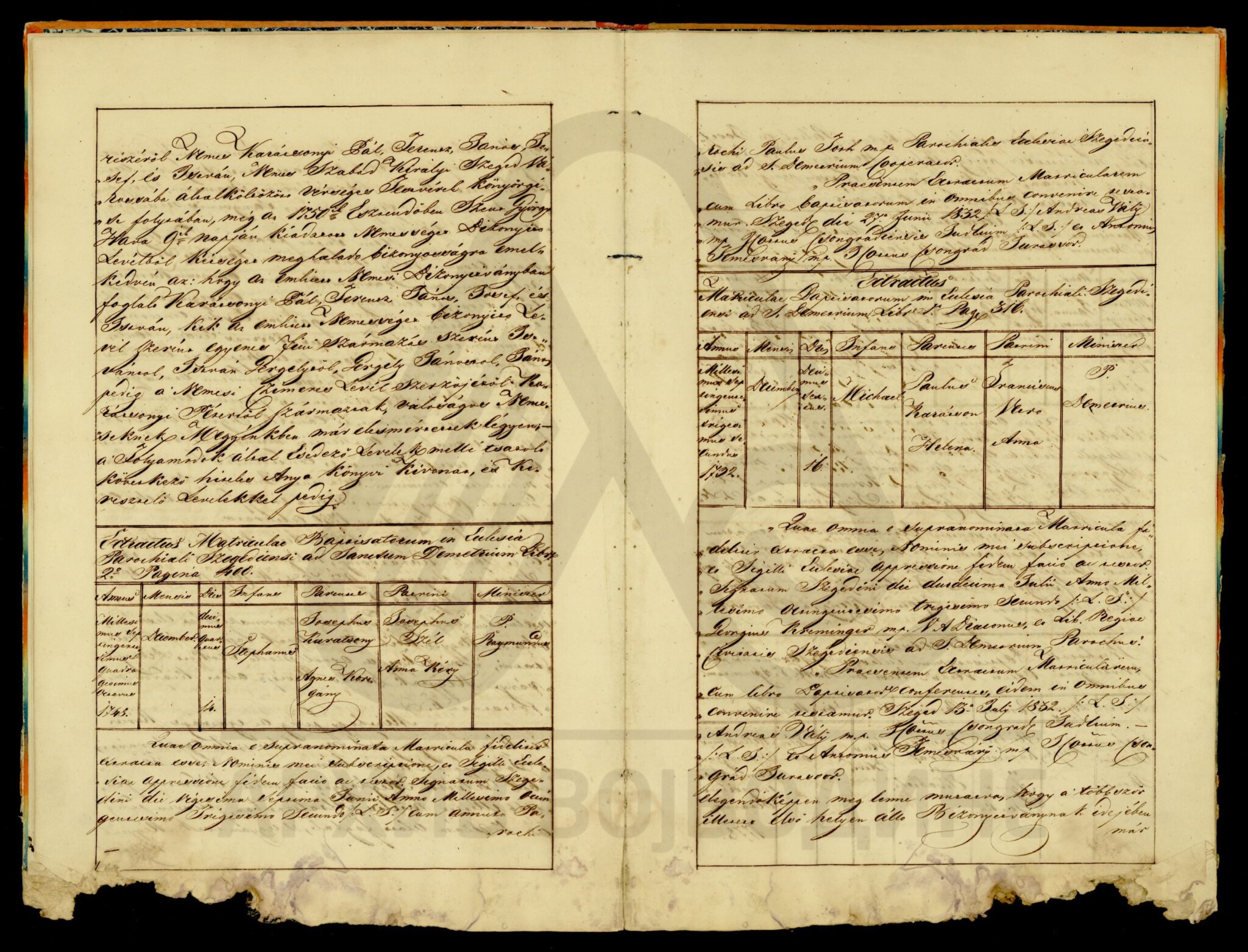 Хартија, мађарски, латински језик, 12 листова, рукопис (облик књиге тврдог повеза), оштећена, папирни печат. Потврда Чанадске жупаније о племићком пореклу породице Карачоњи (Karátsonyi, Karátsony, Karátsoni, Karátson) која се издаје на основу постојећих аката у жупанијској архиви.