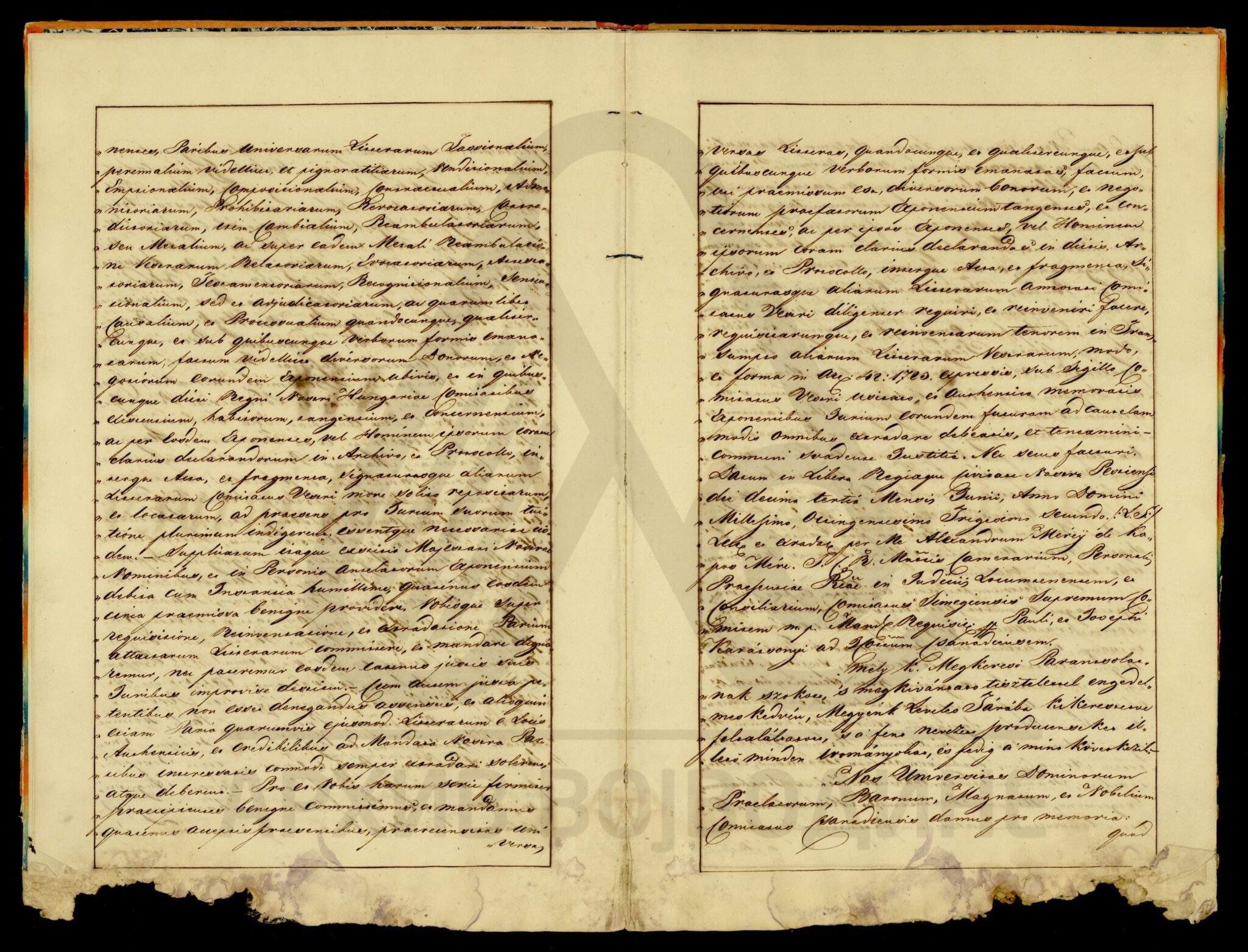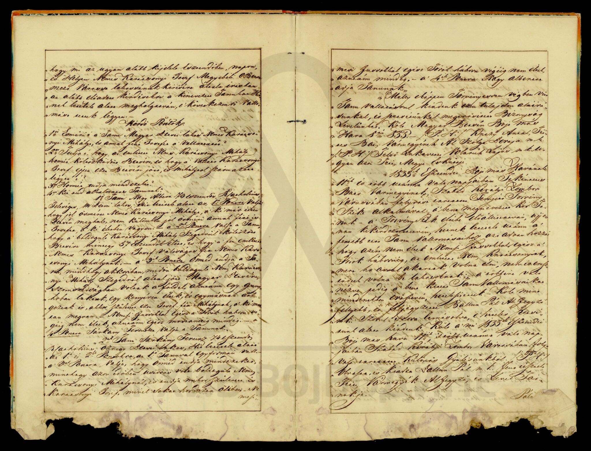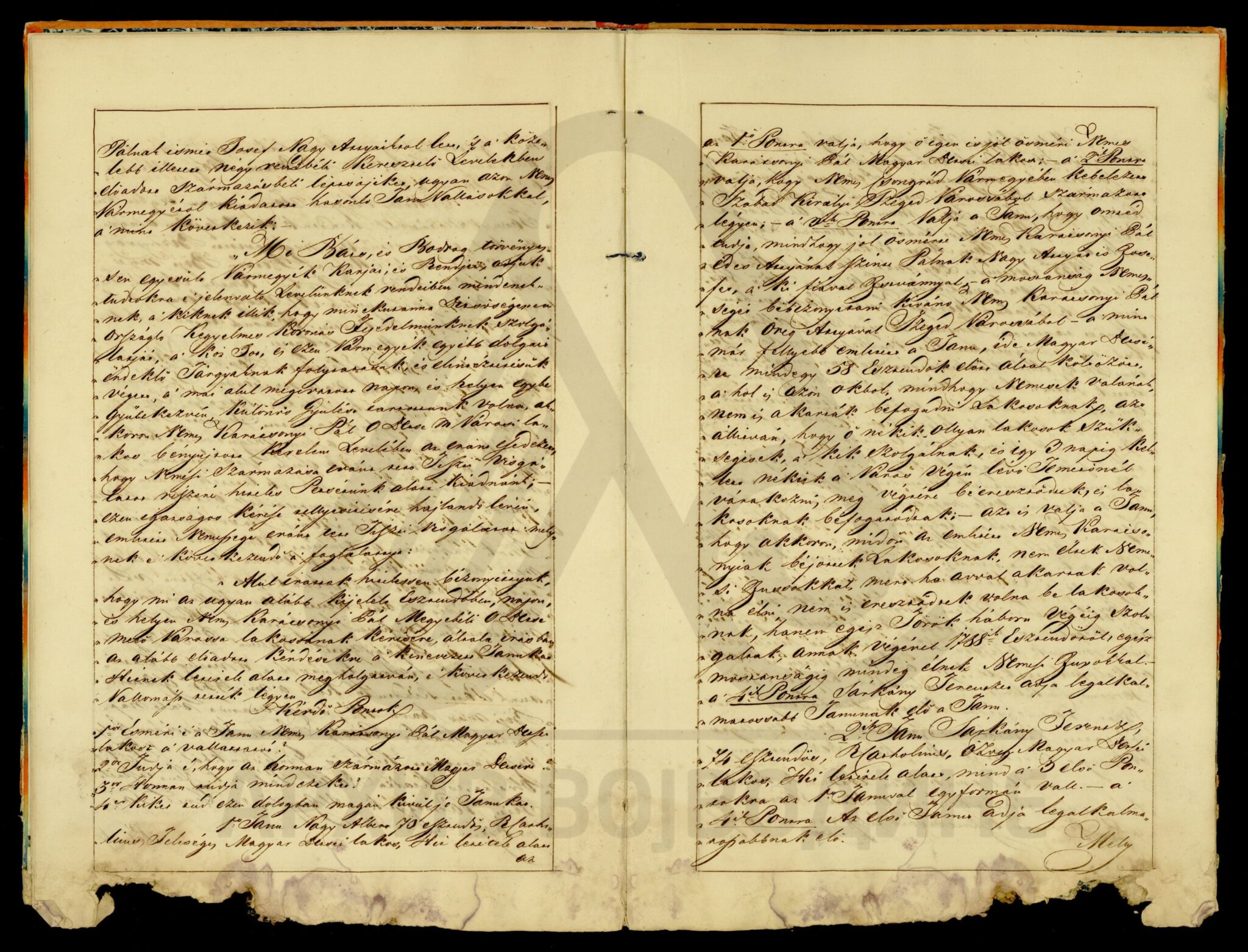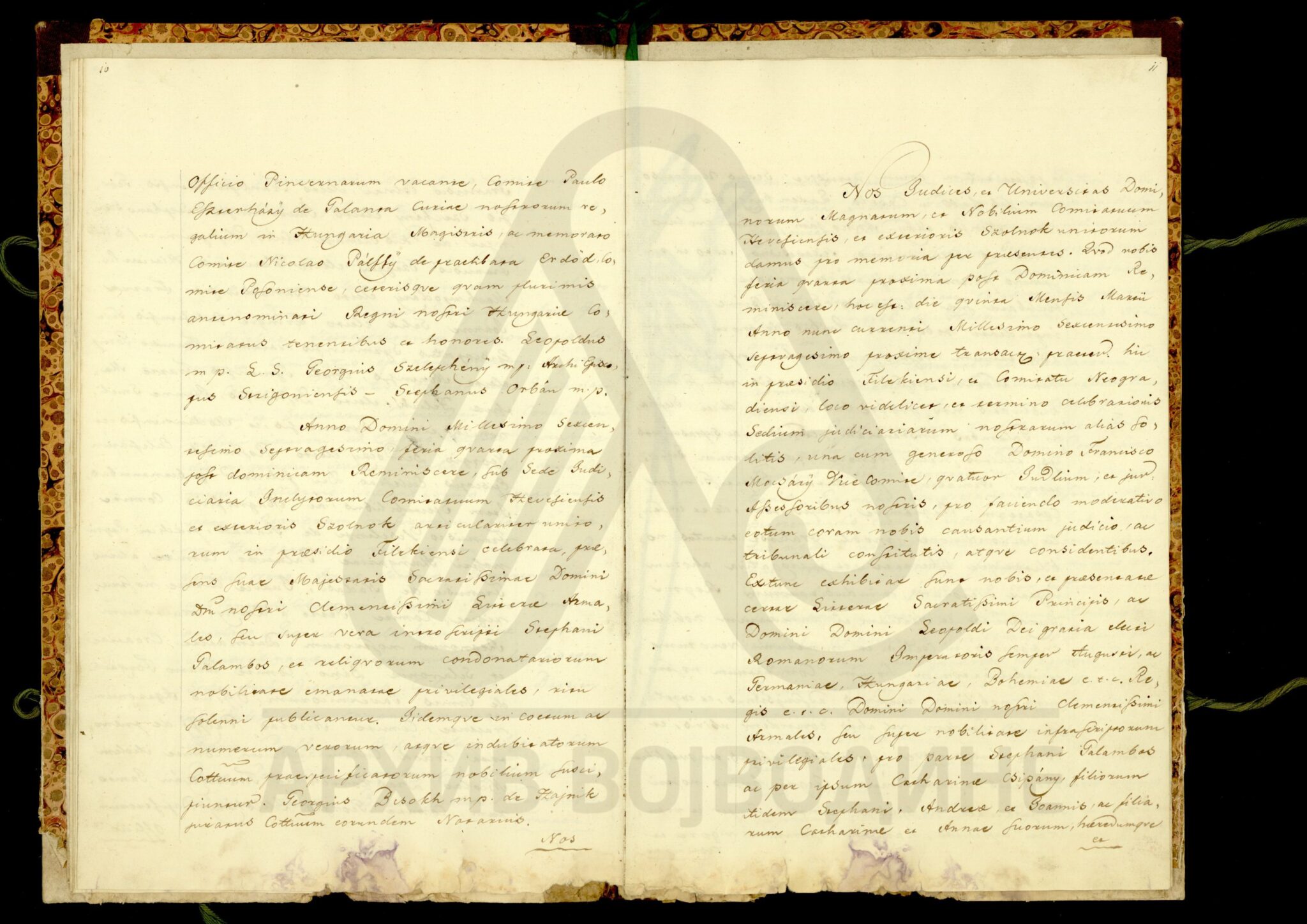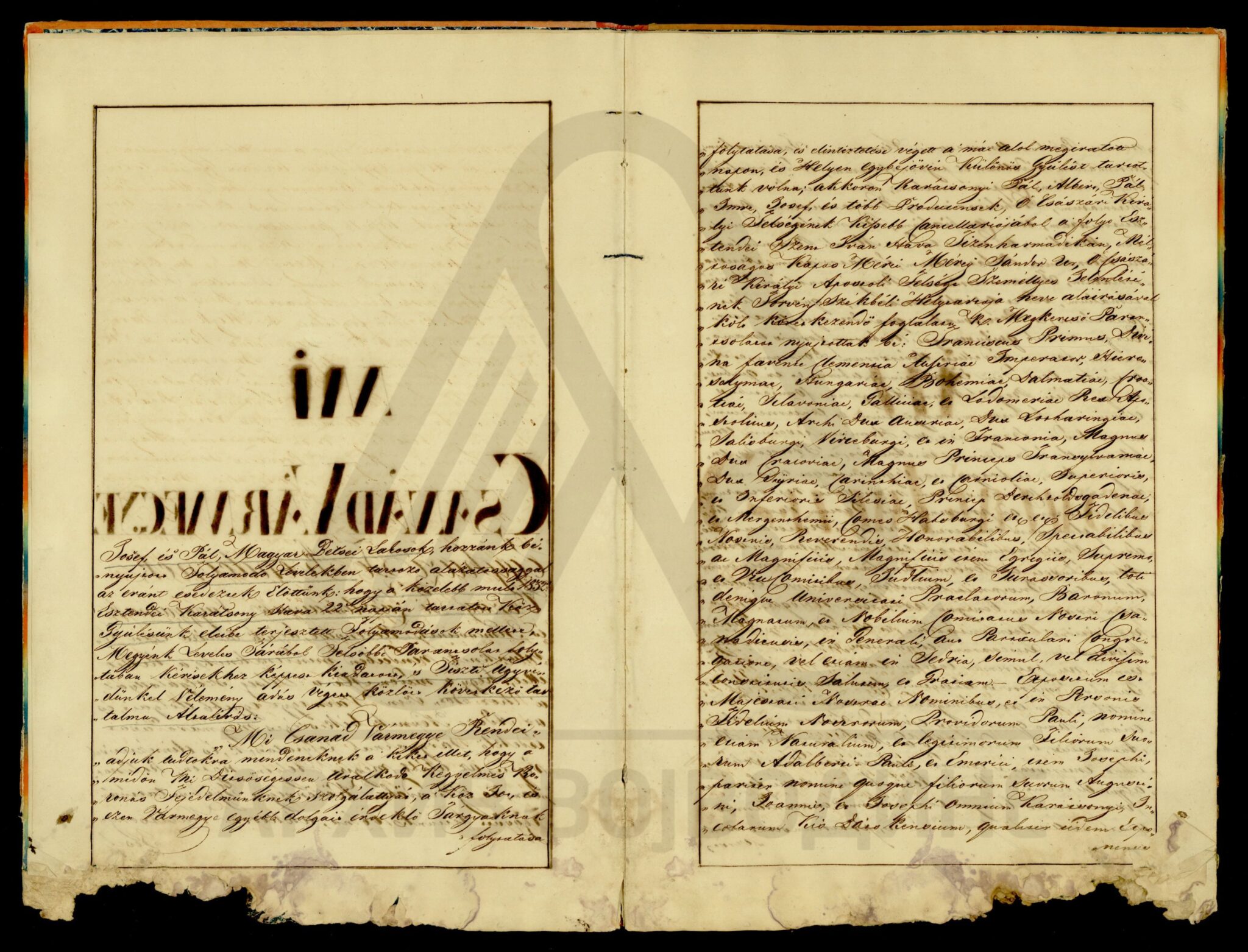 Хартија, мађарски, латински језик, 12 листова, рукопис (облик књиге тврдог повеза), оштећена, папирни печат. Потврда Чанадске жупаније о племићком пореклу породице Карачоњи (Karátsonyi, Karátsony, Karátsoni, Karátson) која се издаје на основу постојећих аката у жупанијској архиви.