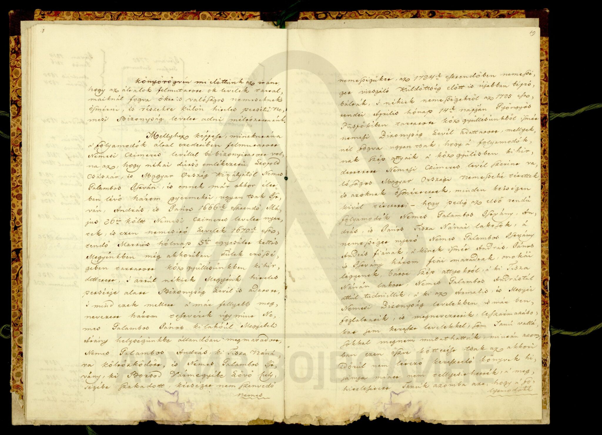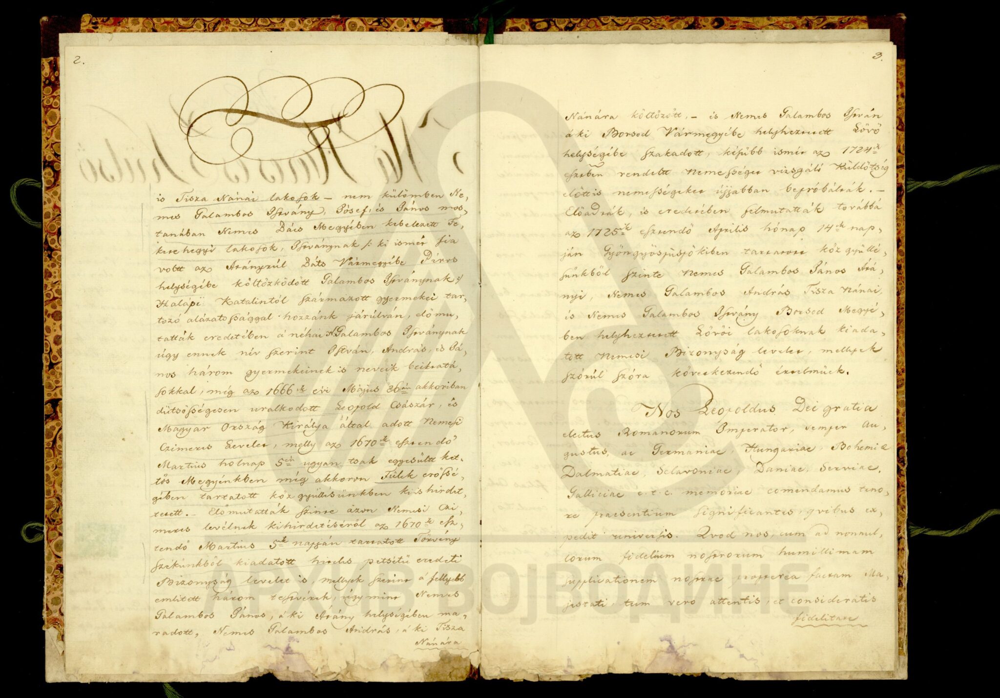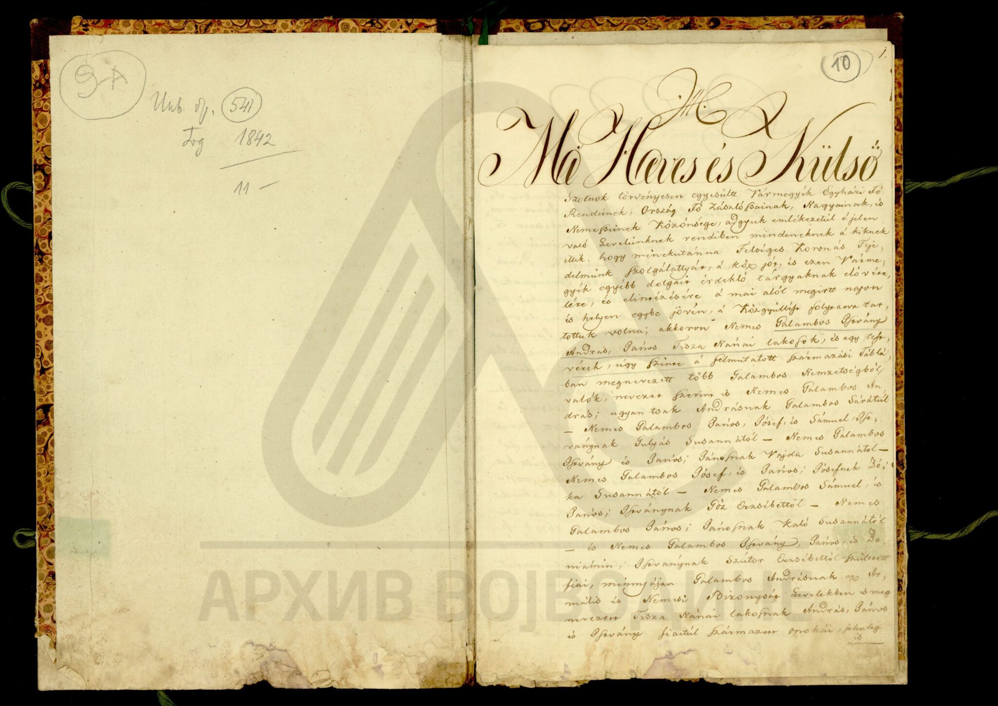 Хартија, мађарски, латински језик, 12 листова, рукопис (облик књиге тврдог повеза), оштећена, папирни печат. Потврда жупаније Хевеш и Килше Солнок (Heves és Külsö Szolnok; Heves, et exterioris Szolnok unitorum) о племићком пореклу породице Галамбош (Galambos), чијим прецима је цар Леополд I даровао племићку титулу 26. маја 1666. године. Потврда садржи родослов именоване породице, чији потомци живе у месту Тиса-Нана (Tisza Nánai) на територији наведене Жупаније, као и у местима Фекетић (Feketehegyi) и Пирош (Piros; Руменка) у Бачко-бодрошкој жупанији.